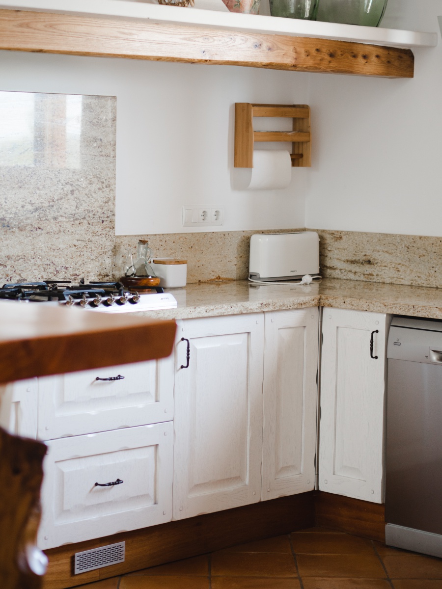 Der offene Wohnbereich besteht aus Wohnzimmer, Esszimmer und Küche. Die Küche hat eine große Arbeitsfläche mit einem Gasherd, Geschirrspüler, Toaster, Kaffeemaschine (Nespresso), Backrohr, Mikrowelle, einem großen Kühlschrank mit Gefrierkombi und ist komplett ausgestattet. Außerdem gibt es einen separaten Wasserhahn für Trinkwasser. Die Küche hat eine Türe die zum Pool führt. Im Wohnzimmer gibt es ein gemütliches Sofa, Fernseher und eine Radioanlage.