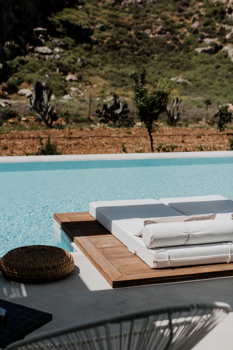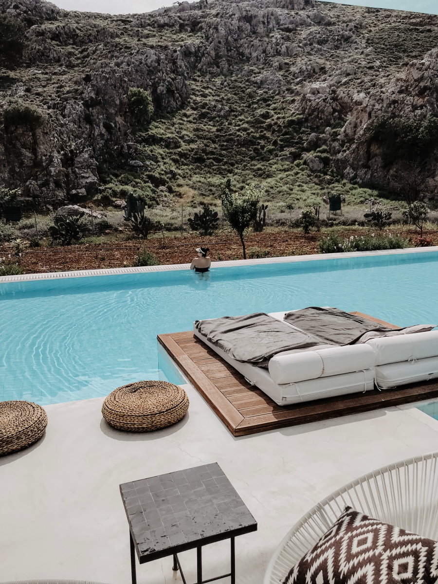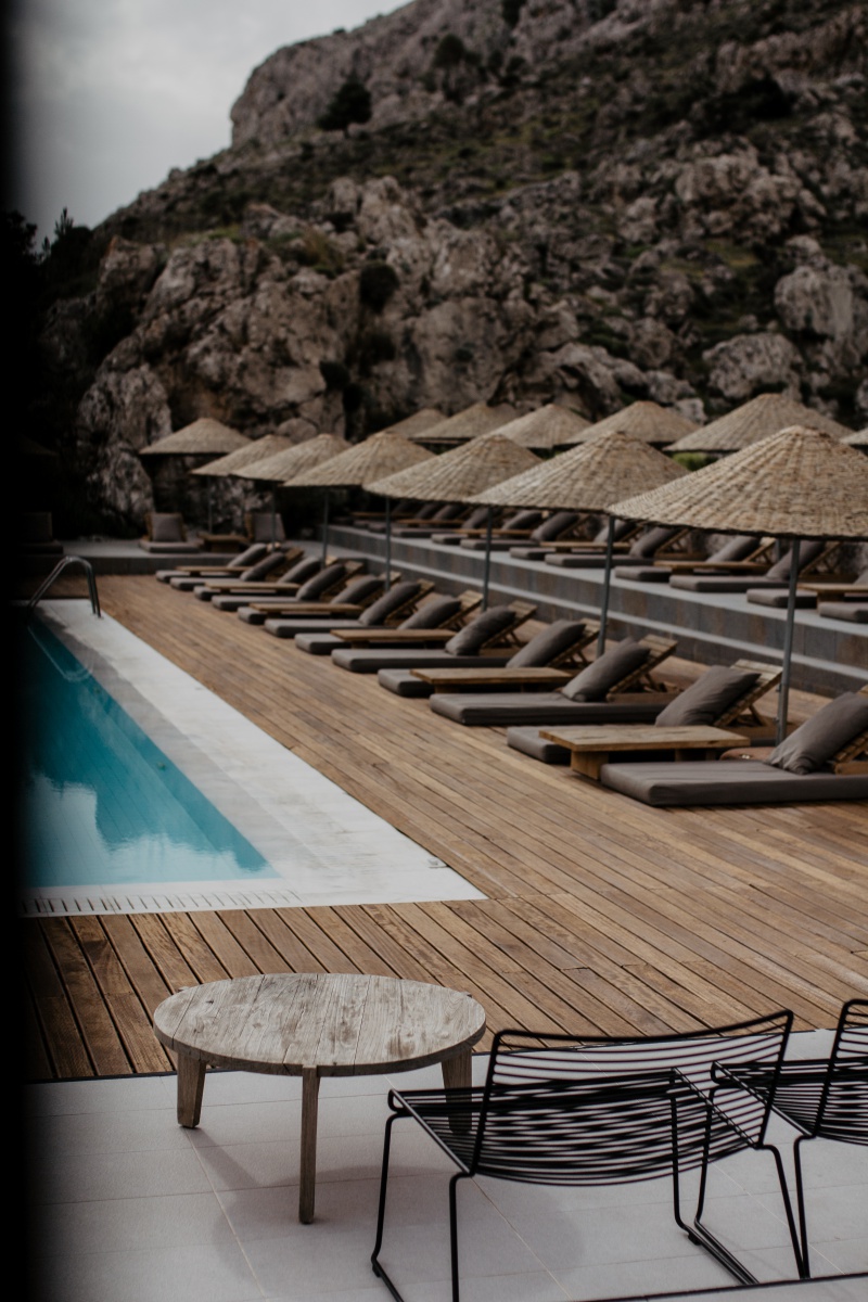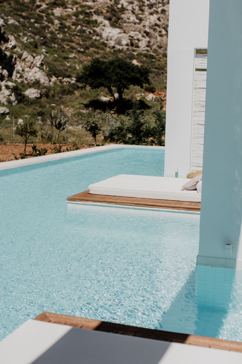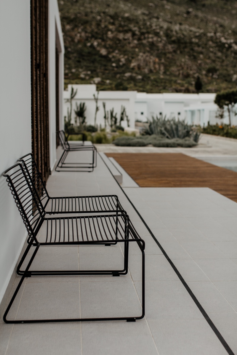 Das Highlight ist natürlich mit Abstand die eigene Terrasse mit Zugang zum Pool, den man sich mit ein paar Einheiten teilt. Jedes der 90 Zimmer verfügt hier über einen Sharing Pool. Die Sonnenliegen auf der Terrasse, welche versetzt ausgerichtet sind, laden zum Sonnenbaden ein. Auch zwei stylische Sessel und ein kleines Tischerl findet ihr auf eurer eigenen Terrasse. Wir haben das Zimmer unter Tags nie verlassen, da wir uns sooo wohlgefühlt haben. Wir hatten von der Früh weg bis ca. 15 Uhr Sonne auf unserer Terrasse und das war mehr als perfekt. Da der Pool nicht beheizt ist, war dieser sehr erfrischend.