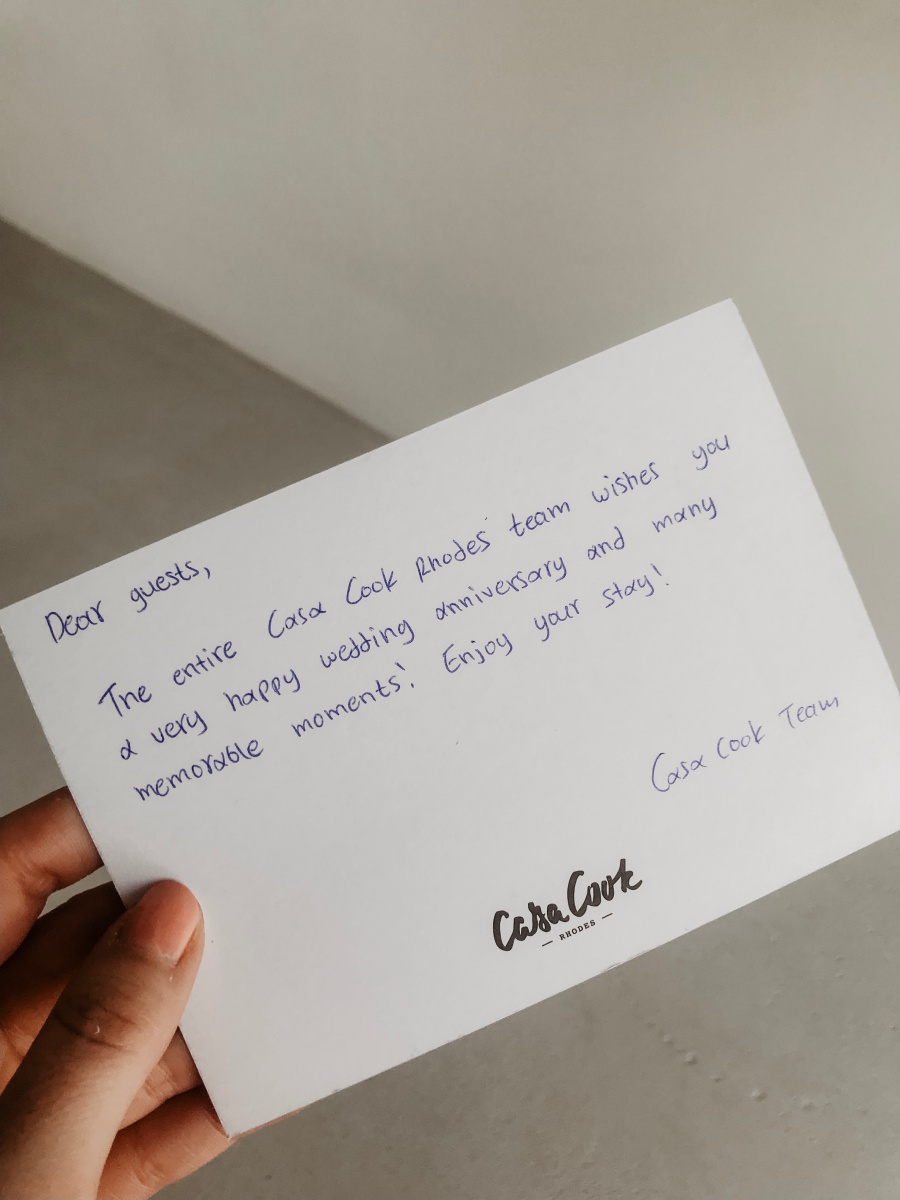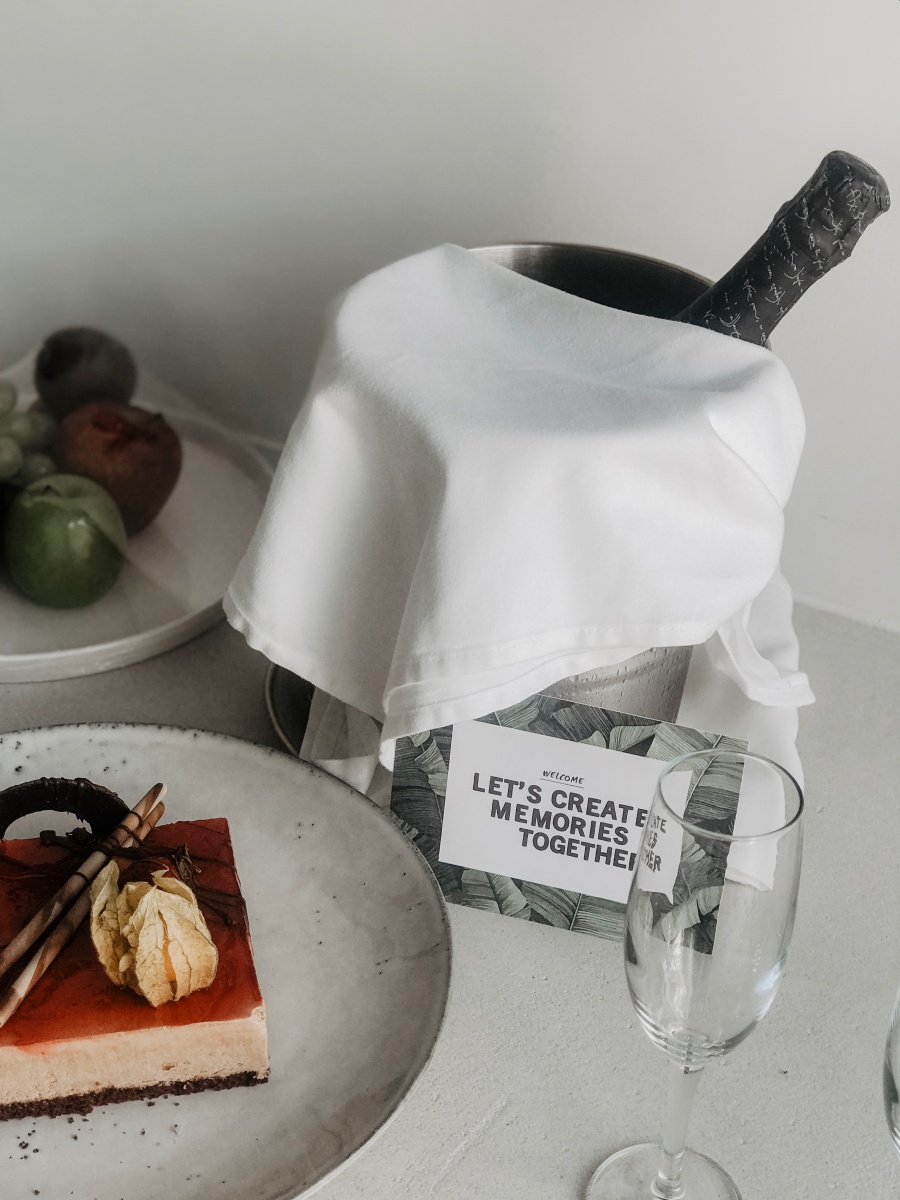 Zu unserem Hochzeitstag bekamen wir eine Flasche Sekt, frische Früchte, eine kleine Torte und eine handgeschriebene Karte mit Glückwünschen. Ist das nicht herzig? Wir haben uns wirklich sehr über diese Aufmerksamkeit gefreut.