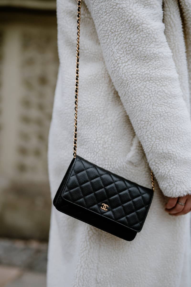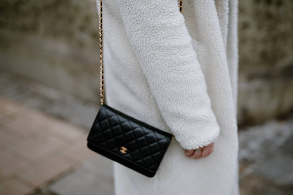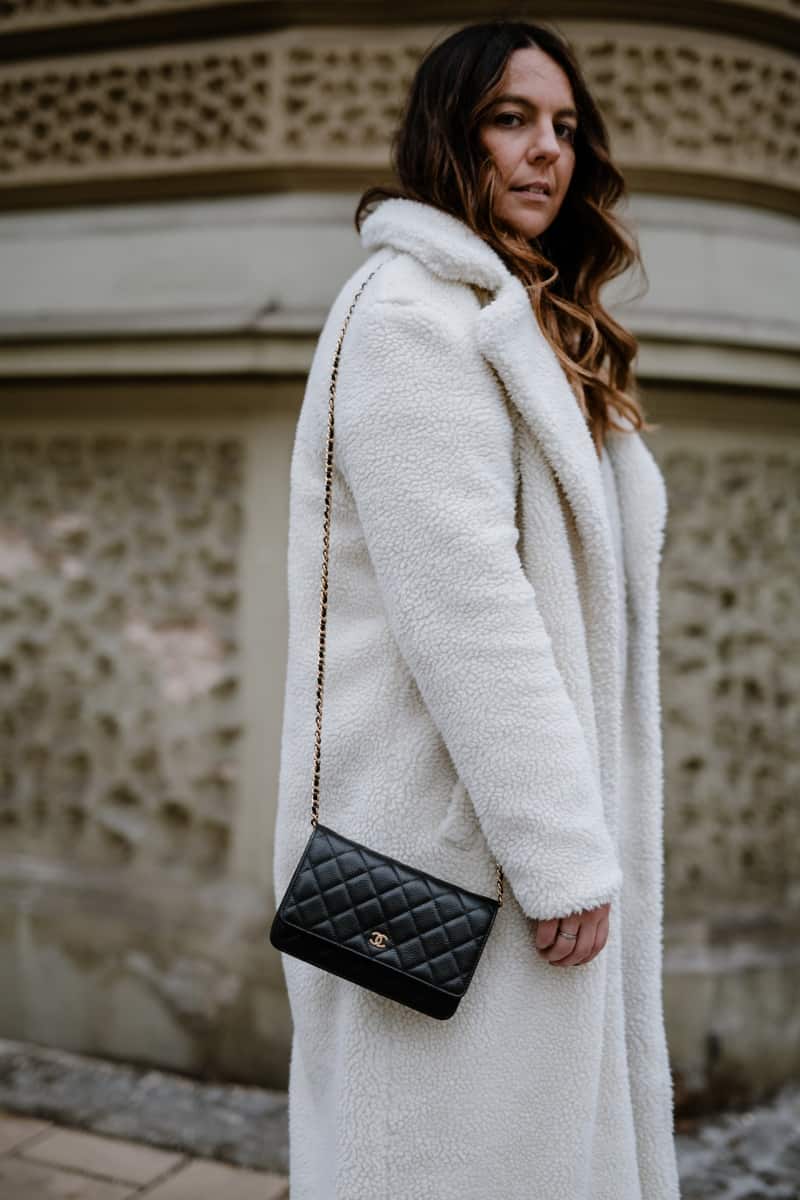 Pullover. Zara // Teddy Mantel. NA-KD // Tasche. Chanel // Jeans. Mango // Schuhe. NA-KD