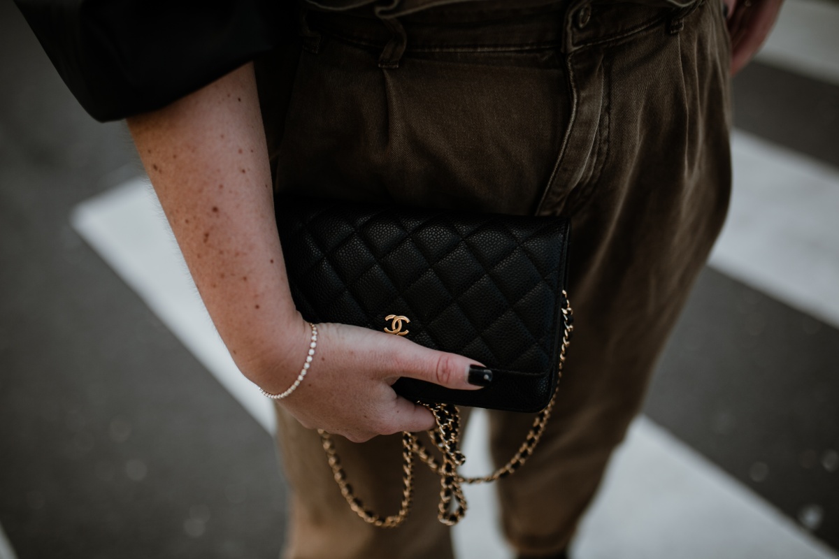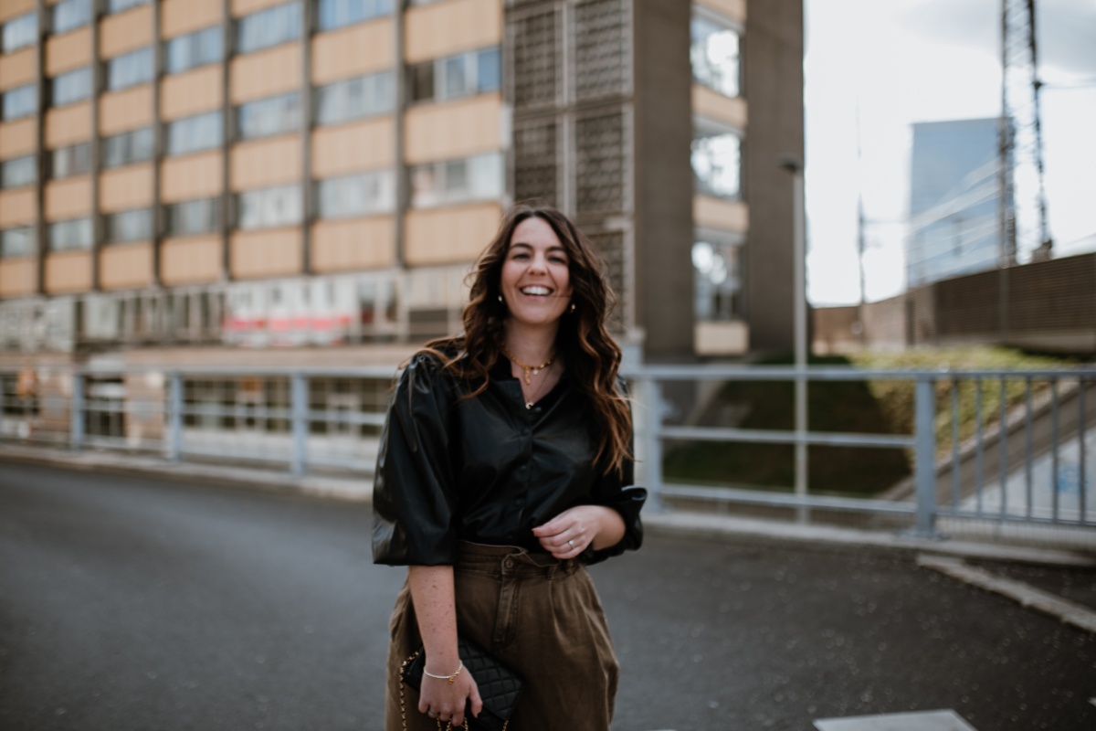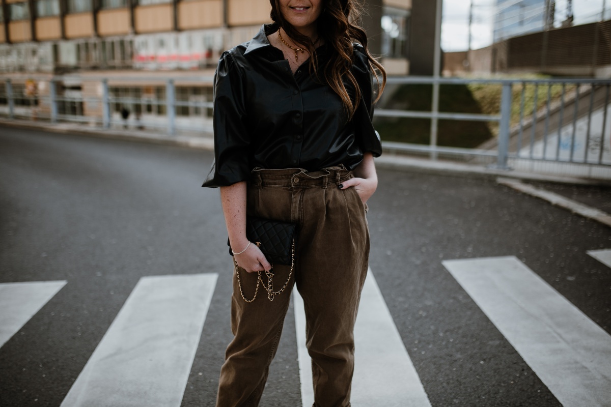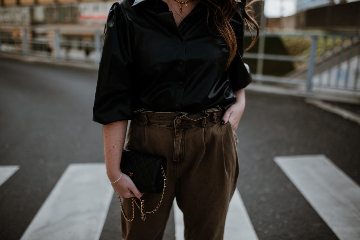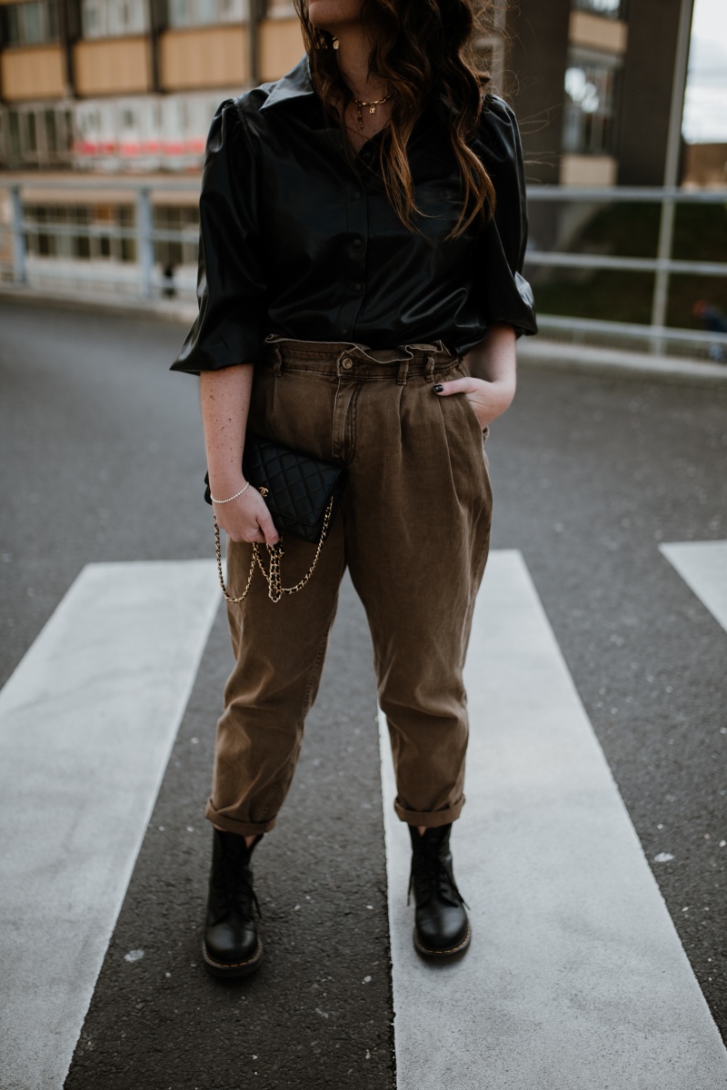Fake Leather Bluse. NA-KD // Hose. ZARA (ähnlich in Khaki) // Tasche. Chanel // Kette. ariane ernst // Kette mit Anhänger. Xenox // Schuhe. Doc Martens