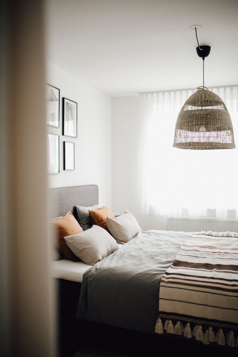 Bett. IKEA // Lampe. IKEA // Bettwäsche. IKEA // Faltkorb / Blumenkorb. IKEA // Polsterbezug beige. IKEA // Innenkissen. IKEA // Polsterbezug braun. H&M Home // Innenkissen. H&M Home // Tagesdecke. H&M Home // Nachttisch. IKEA // Vase. Depot // Tablett. Nanu Nana // Spiegel. IKEA // Teppich. Westwing