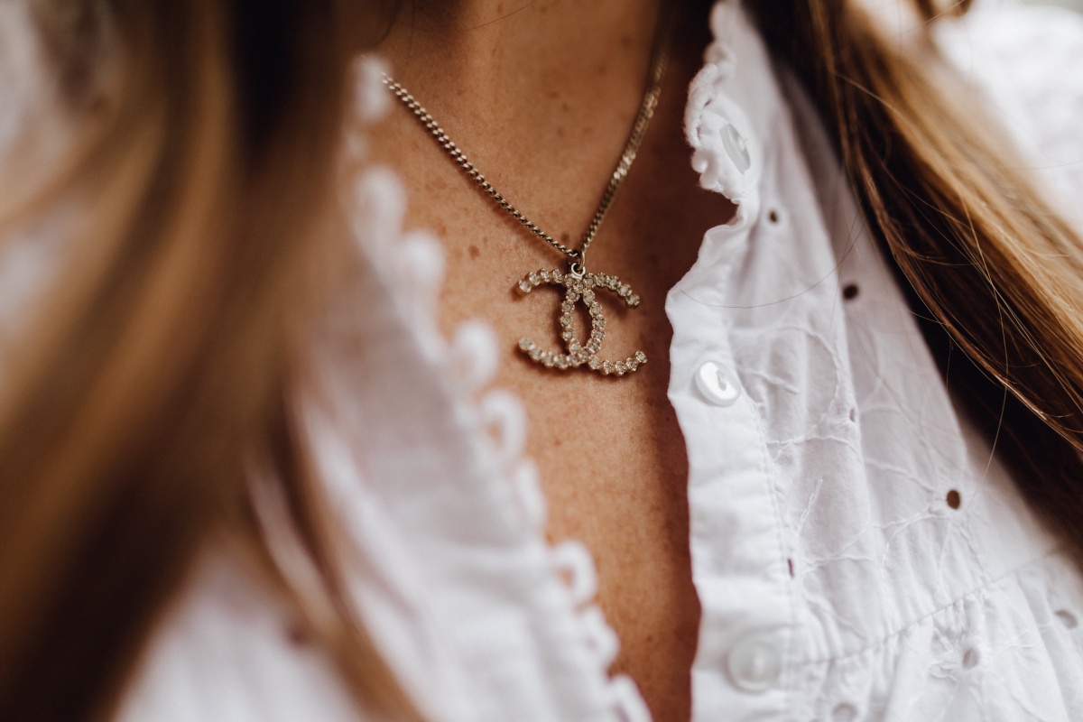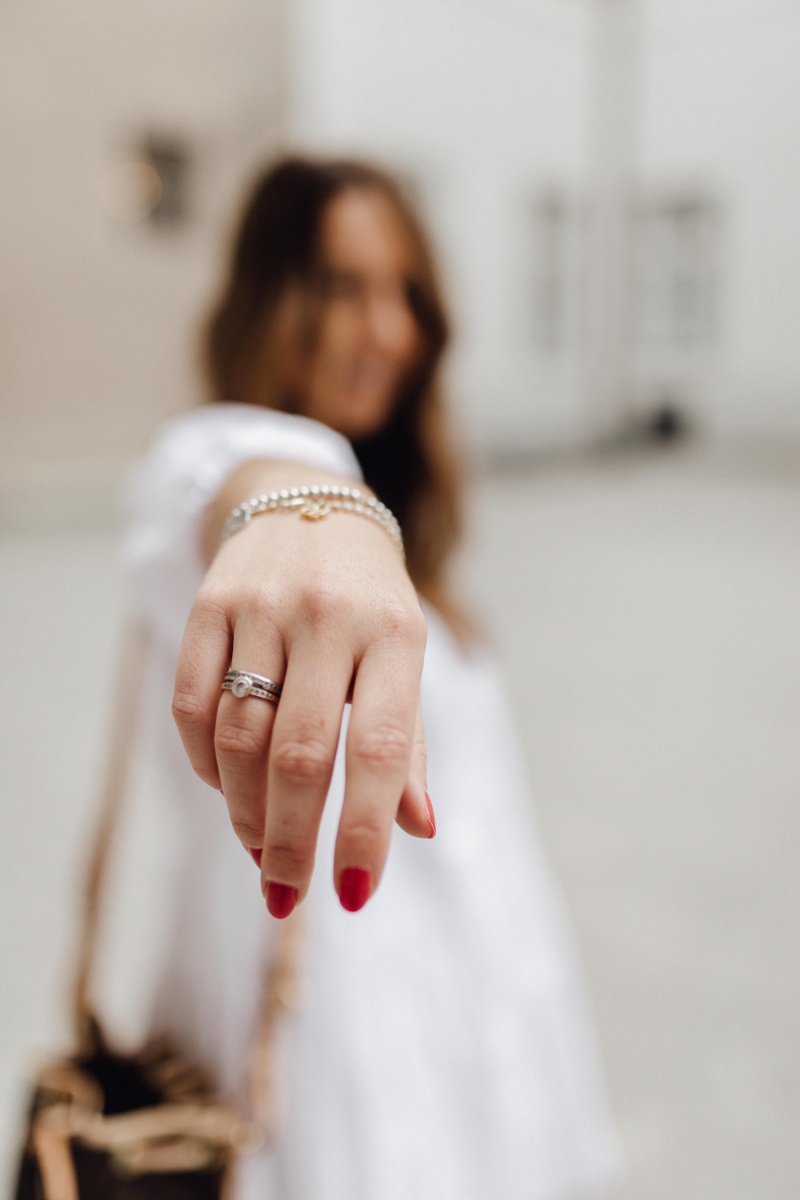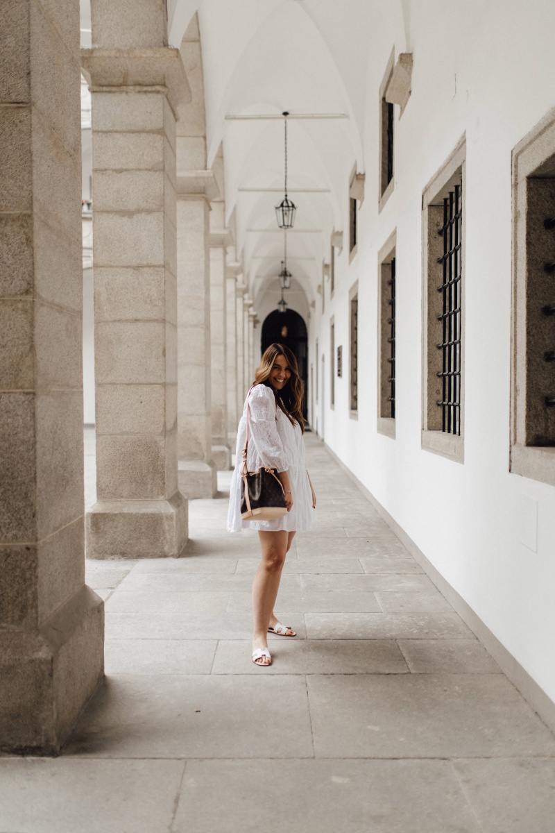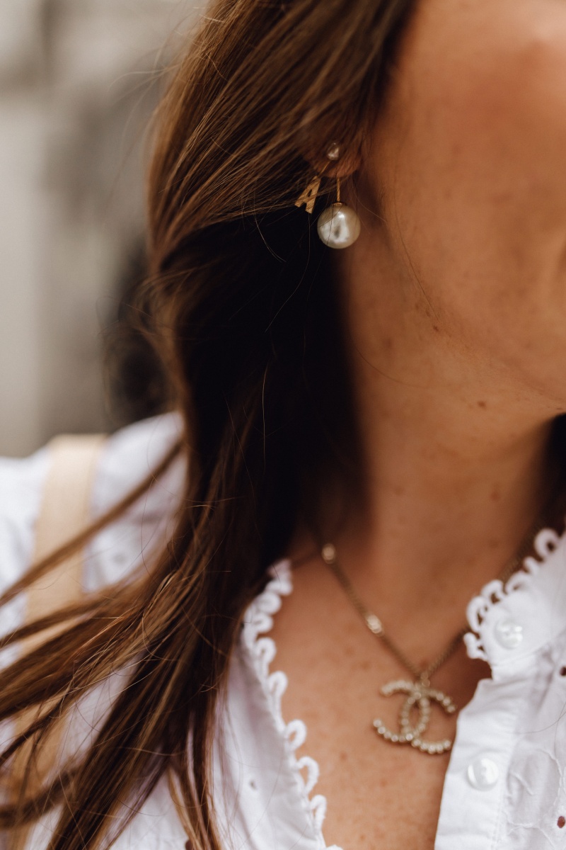 Kleid. ZARA // Tasche. Louis Vuitton // Ohrringe. Chanel, Dior // Kette. Chanel // Pantoletten. Hermès