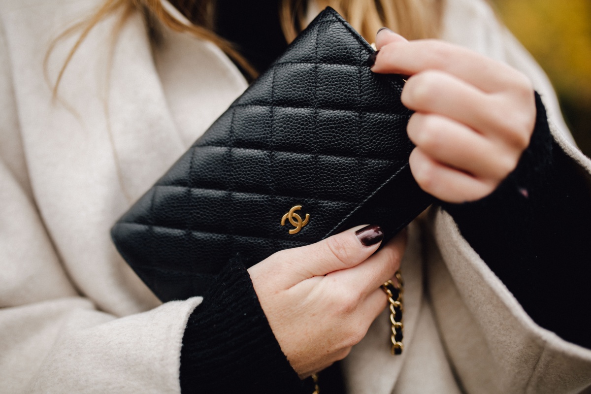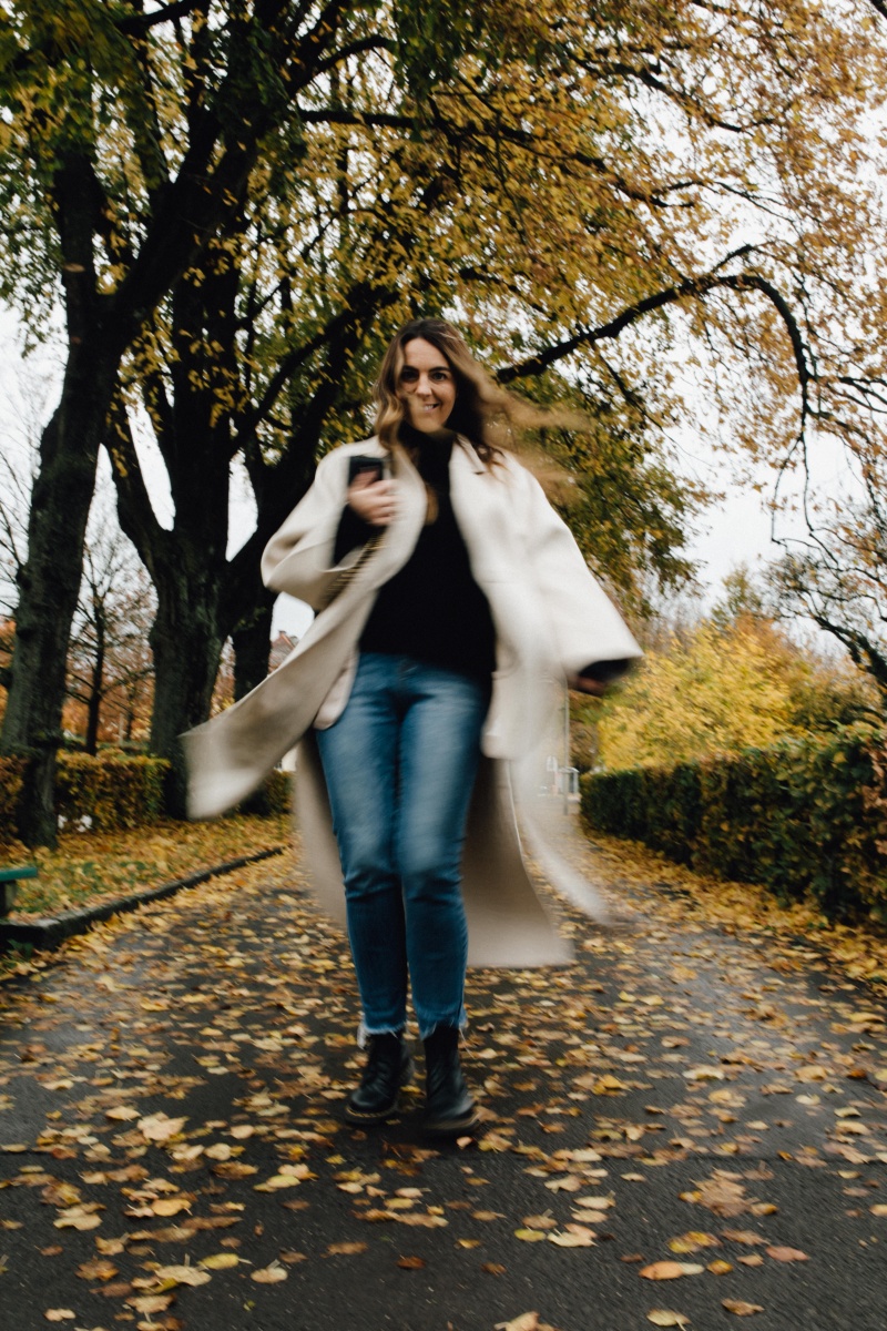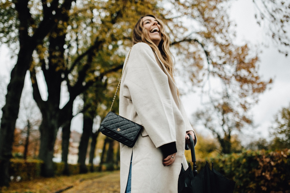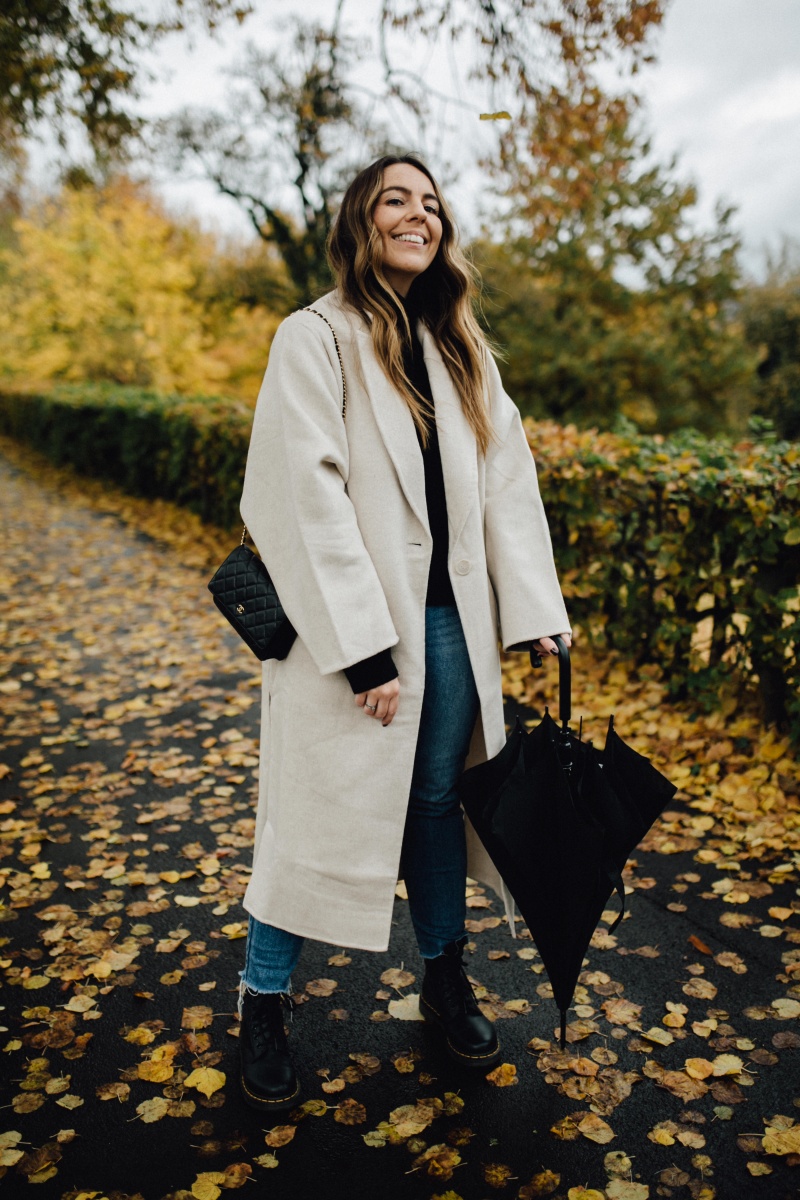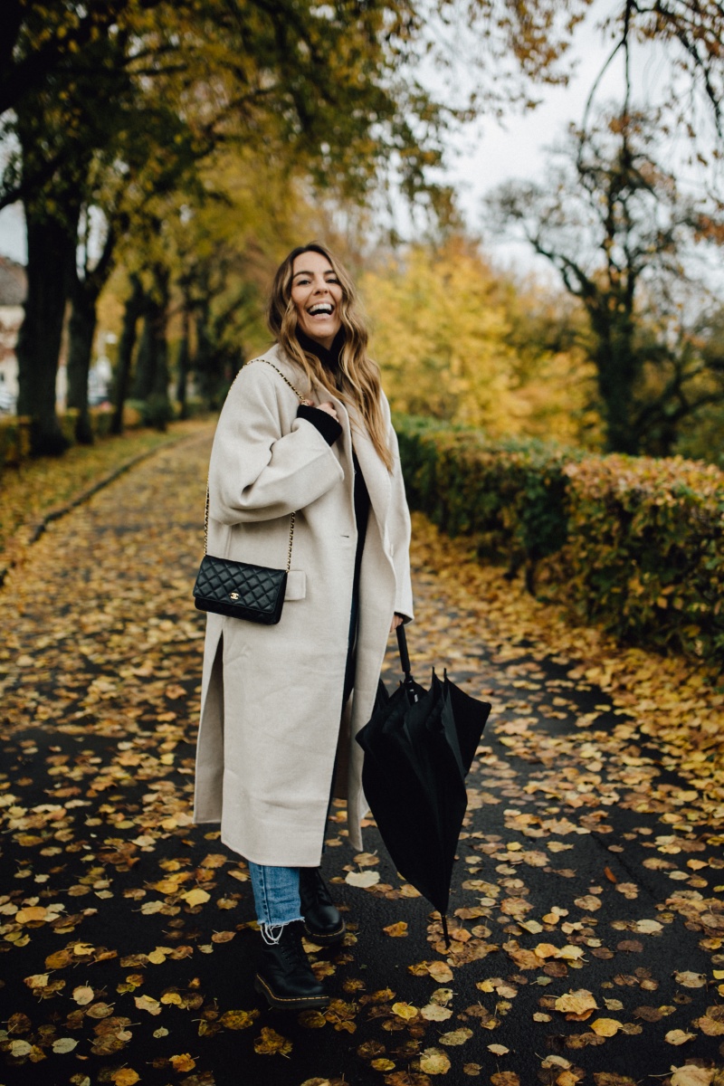 Pullover. NA-KD (ähnlich) // Mantel. H&M (ähnlich oder braune Version) // Jeans. Bershka // Tasche. Chanel // Boots. Dr. Martens