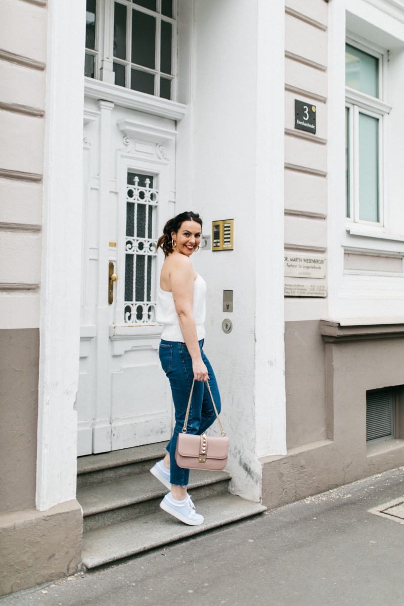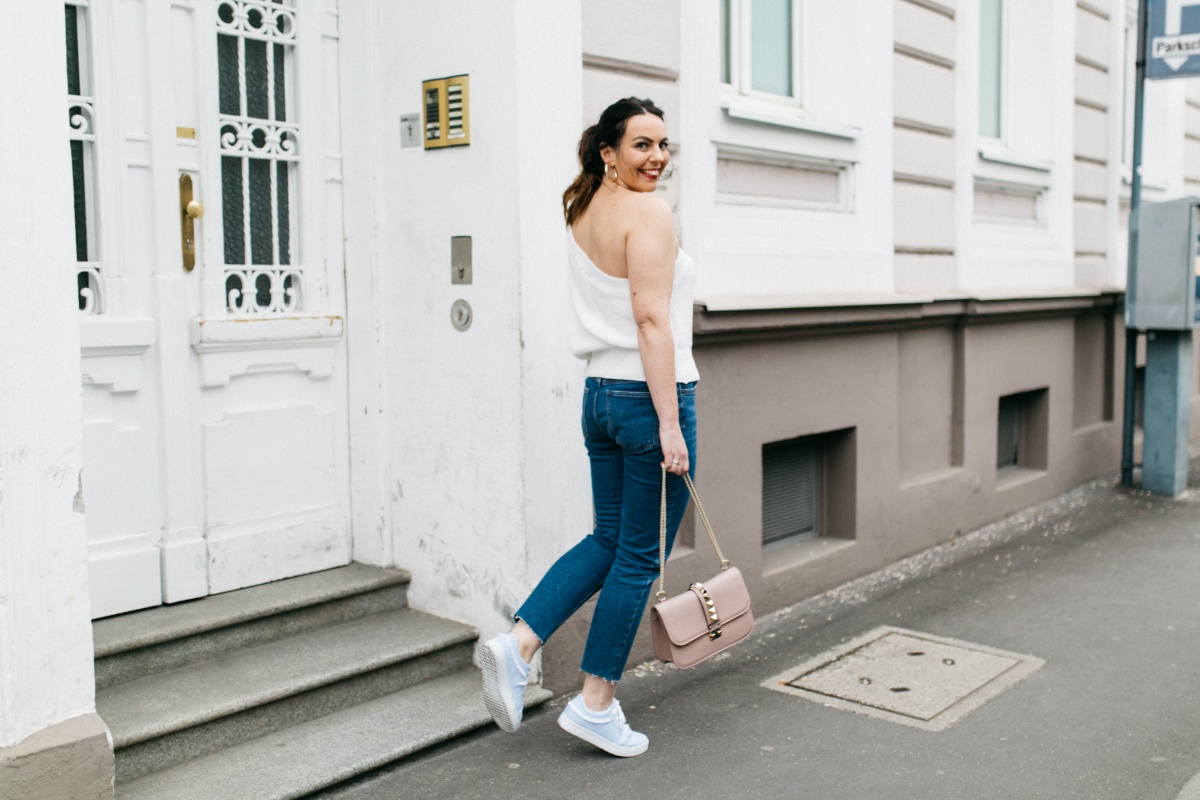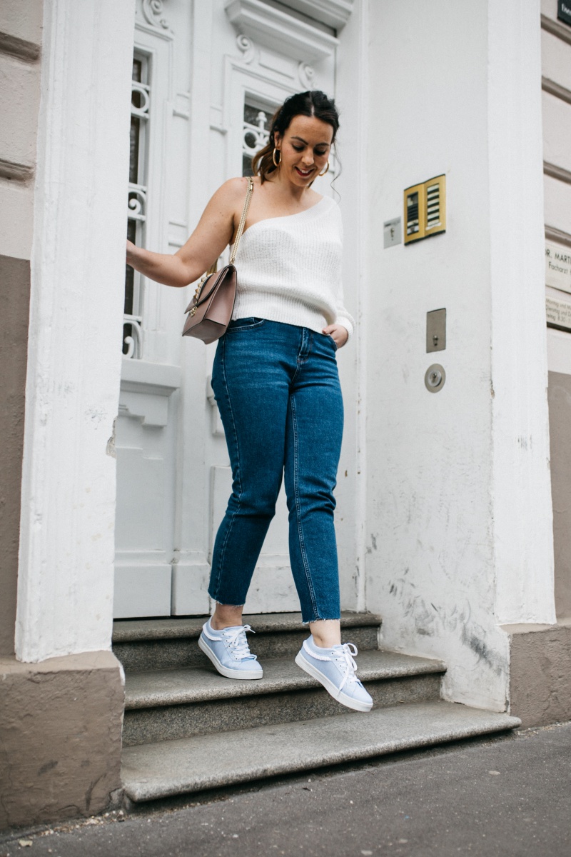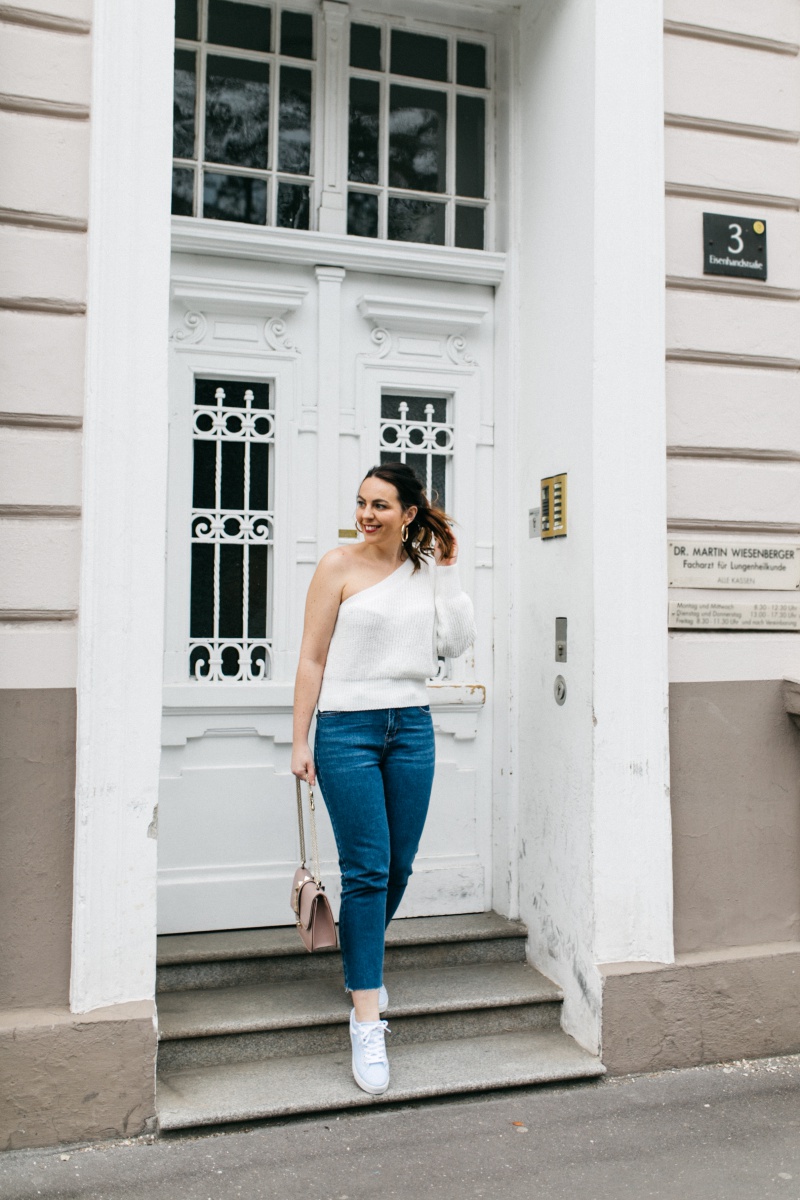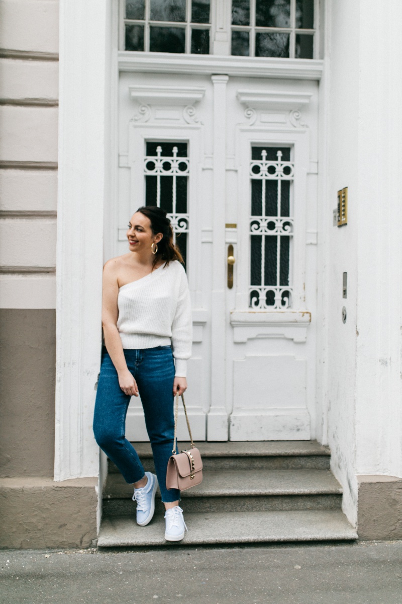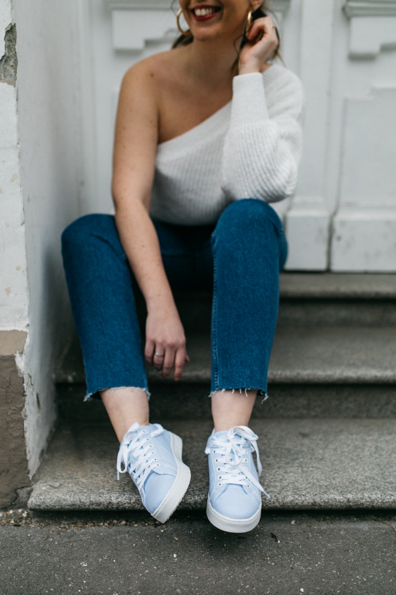 Es ist schon lange kein Geheimnis mehr, dass ich Streifen liebe. Daher bin ich ganz verliebt in meine neuen Sneaker. Perfekt für den bevorstehenden Frühling und in meiner Lieblingskombi mit Jeans und Pullover ein echtes Highlight. Dieser One-Shoulder Pullover ist einfach mehr als perfekt für die bevorstehenden warmen Tage. Und die Jeans ist ein Teil meiner Shoppingausbeute von vor zwei Wochen. Wie ihr vielleicht wisst, habe ich bei der Jeans gleich dreifach zugeschlagen. Aber bei dem Preis konnte ich einfach nicht anders.
