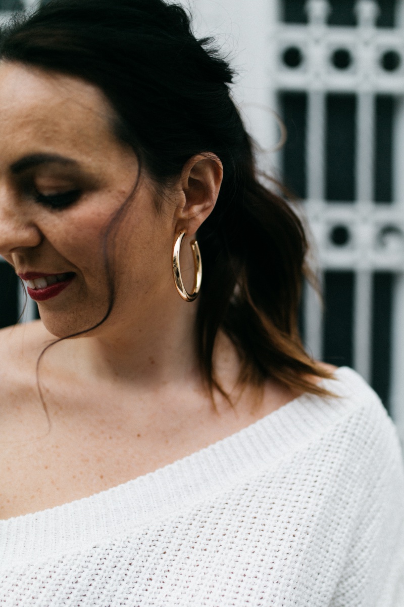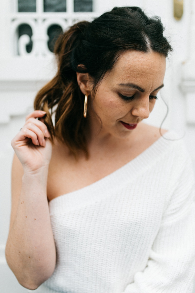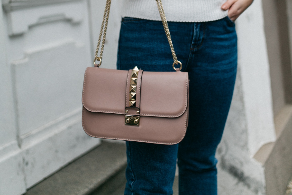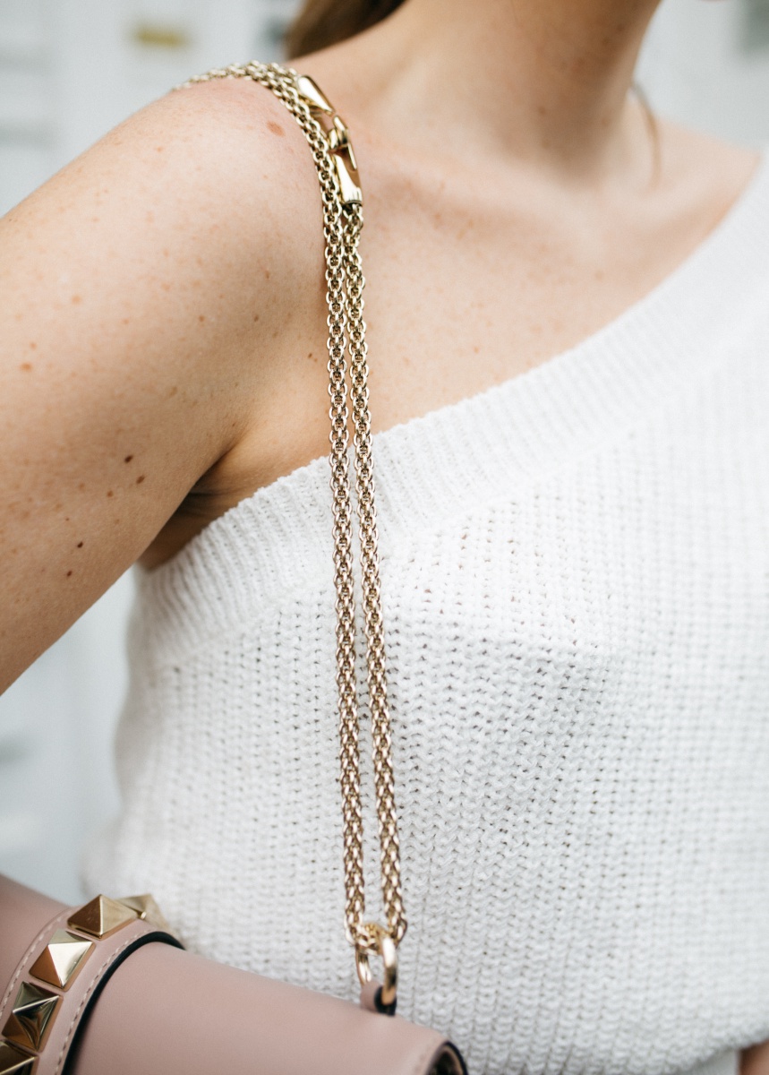 ONE-SHOULDER Pullover. ZARA // OHRRINGE. MANGO // TASCHE. VALENTINO // JEANS. BERSHKA // *SCHUHE. DEICHMANN