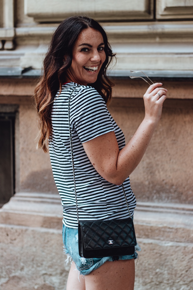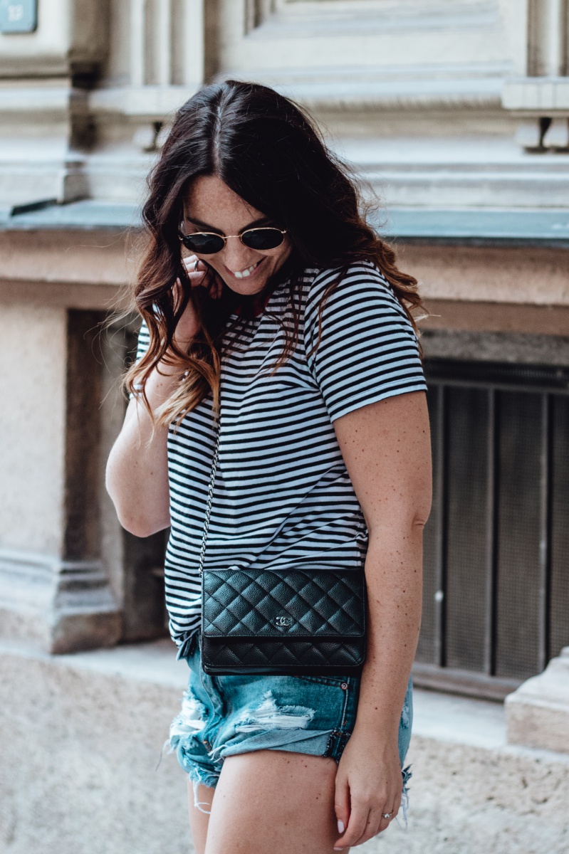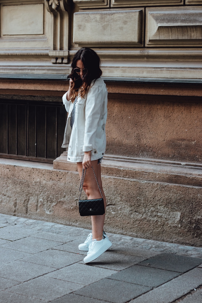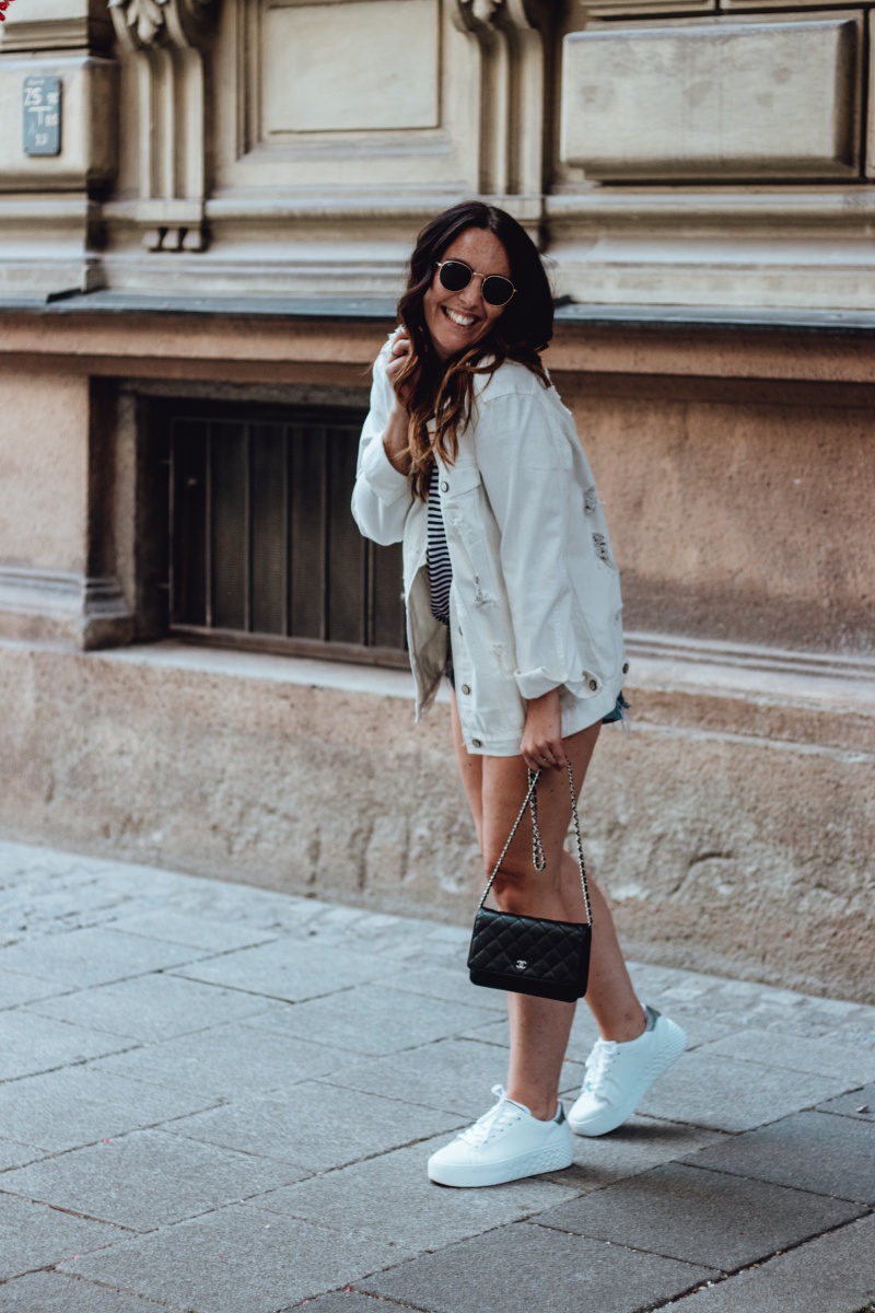 Shirt. BERSHKA // Sonnenbrille. RAYBAN // Shorts. GLAMOROUS // Tasche. CHANEL // Jeansjacke. VERO MODA // Schuhe. Deichmann