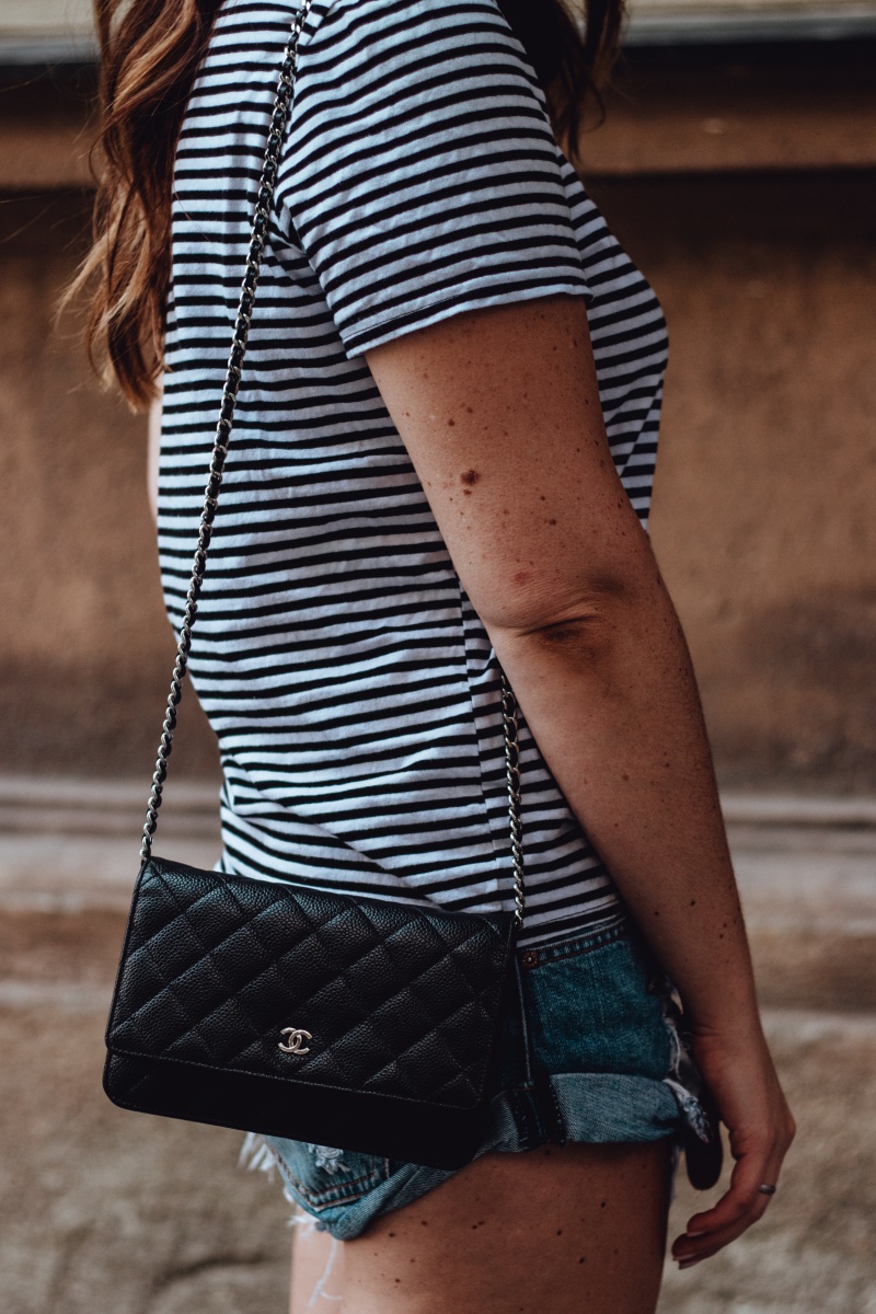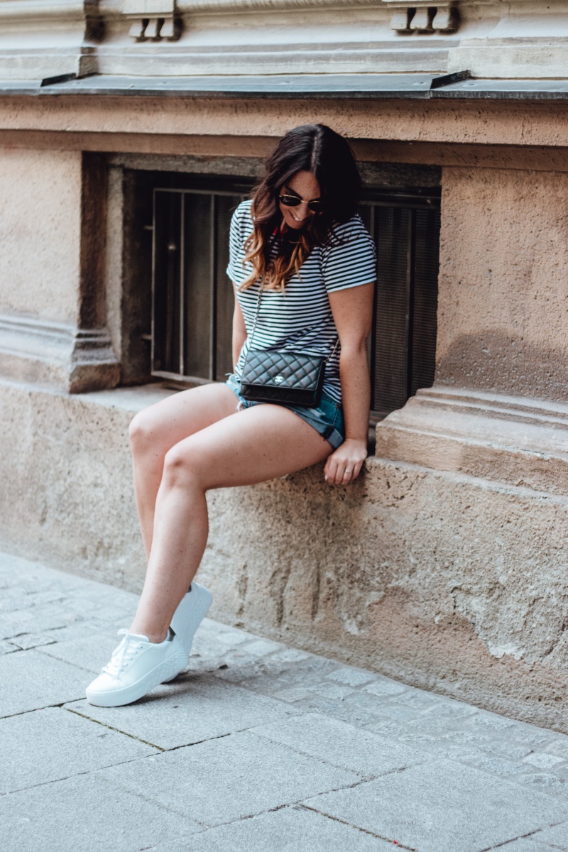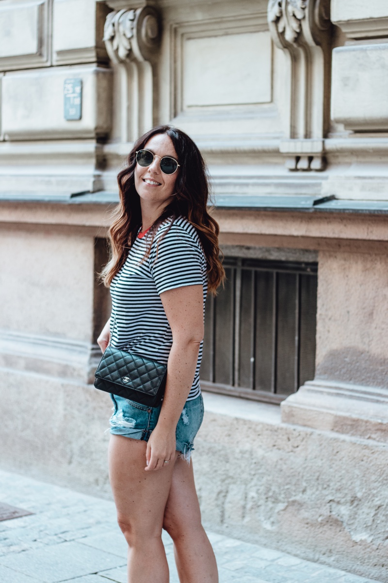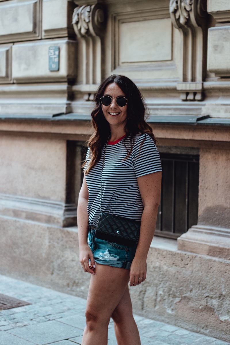 Shirt. BERSHKA // Sonnenbrille. RAYBAN // Shorts. GLAMOROUS // Tasche. CHANEL // Jeansjacke. VERO MODA // Schuhe. Deichmann