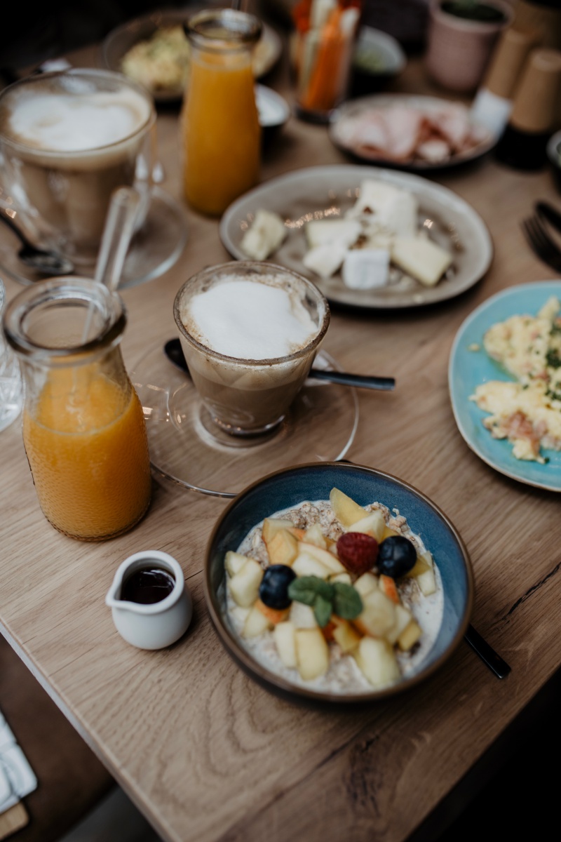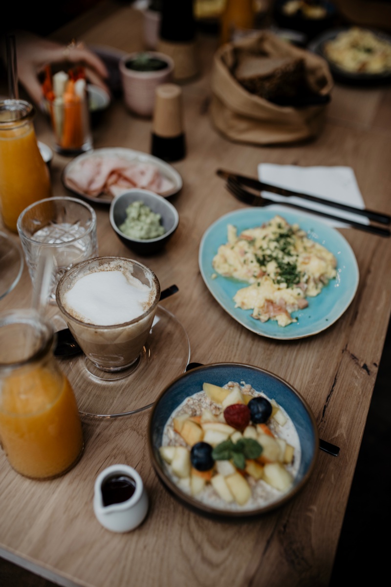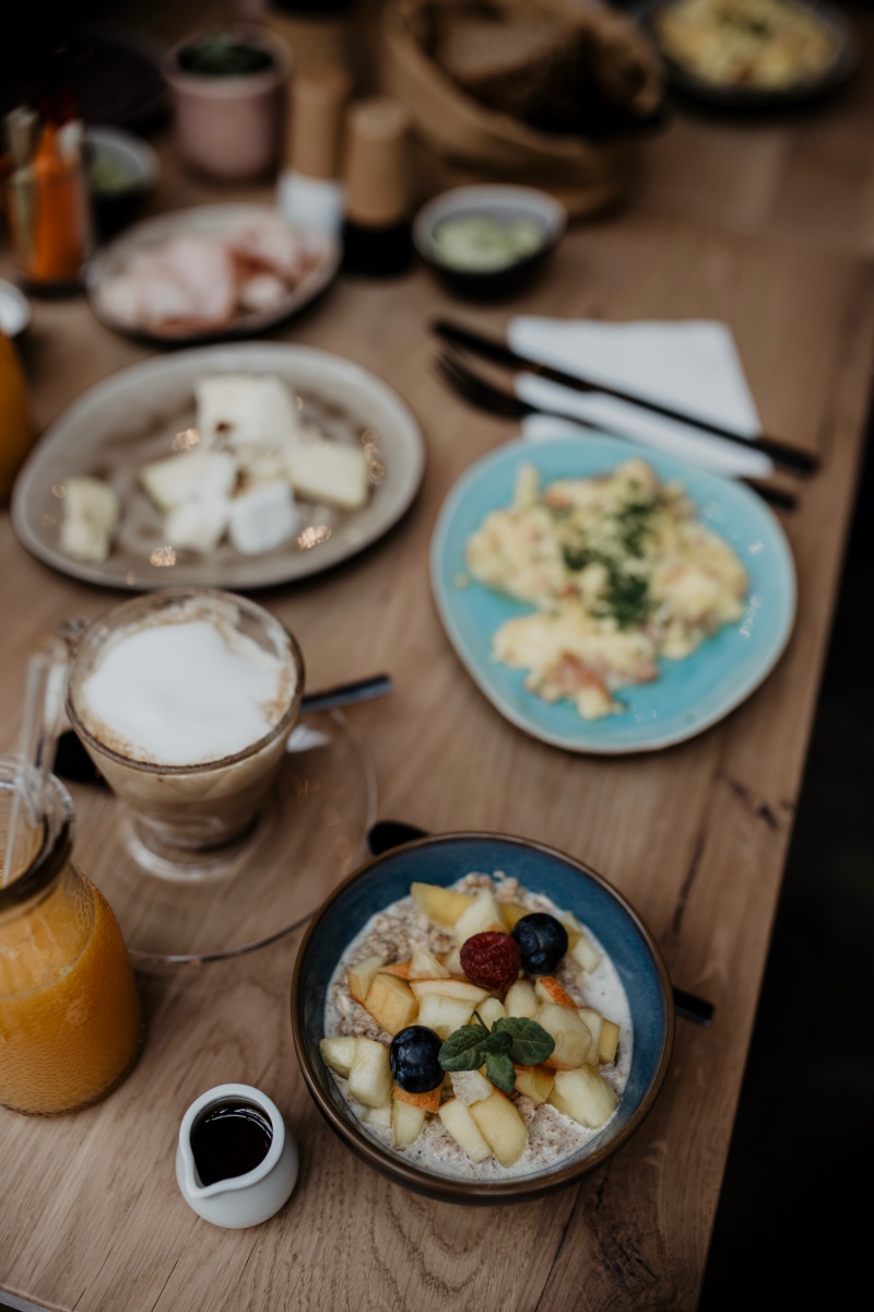 Eierspeise mit Schinken, Körndlbrot mit Karotten, Avocado-Limetten Aufstrich, einer Käseauswahl, Cappuccino, frischgepresstem Orangensaft und einem Frühstücksbrei.