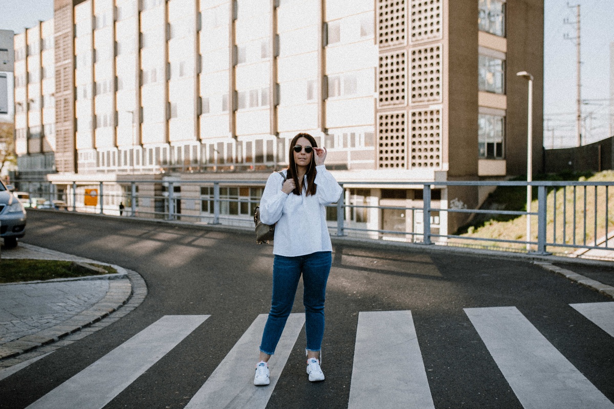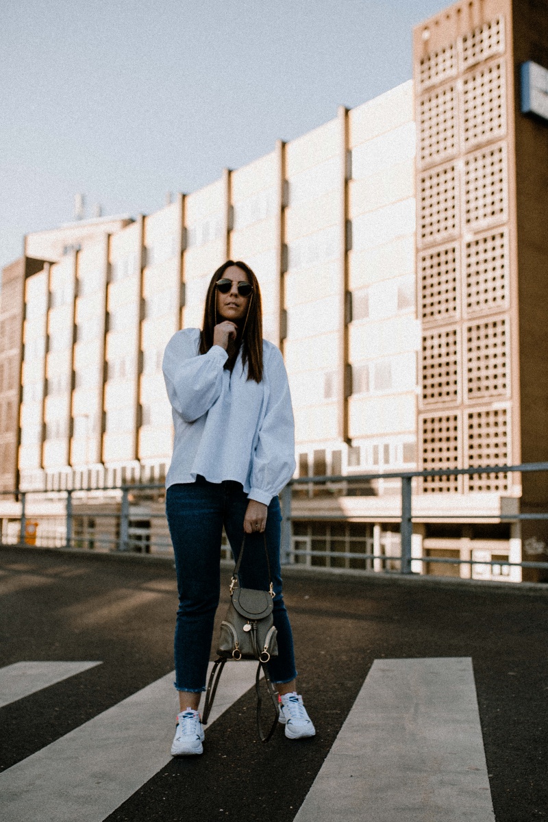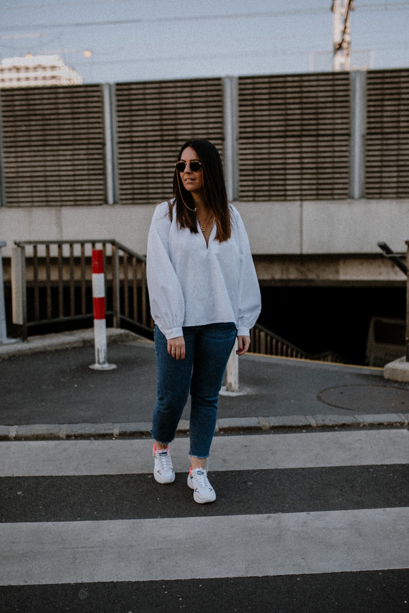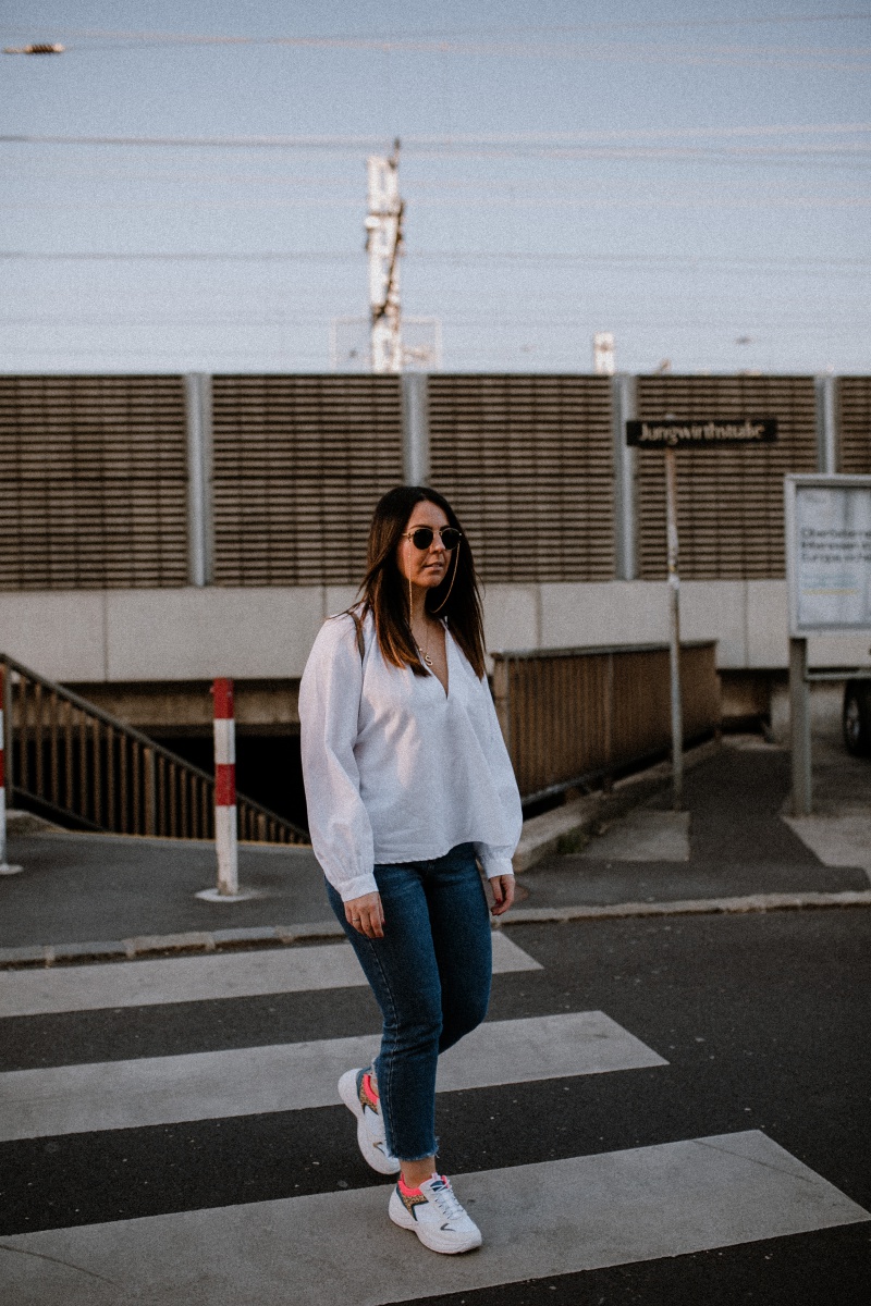 Am besten den Look dazu, ganz einfach halten. Ich habe mich für Jeans und eine weiße Bluse entschieden, die ich momentan sehr gerne trage. Ich mag den Schnitt, die Ballon-Ärmel und auch den Ausschnitt total gerne. Mein kleiner Rucksack darf natürlich bei diesem Look nicht fehlen. Ich sags euch, der war jeden Cent wert. Die Farbe passt einfach überall dazu und ich bin super happy mit dem Teil.
