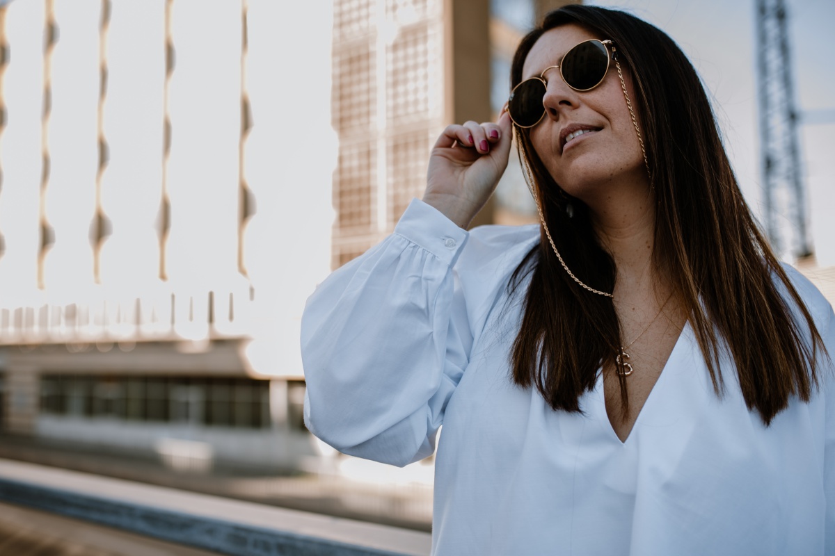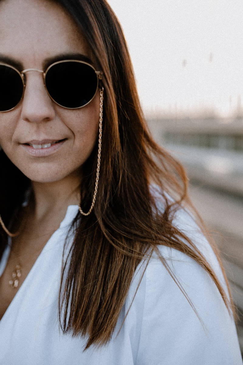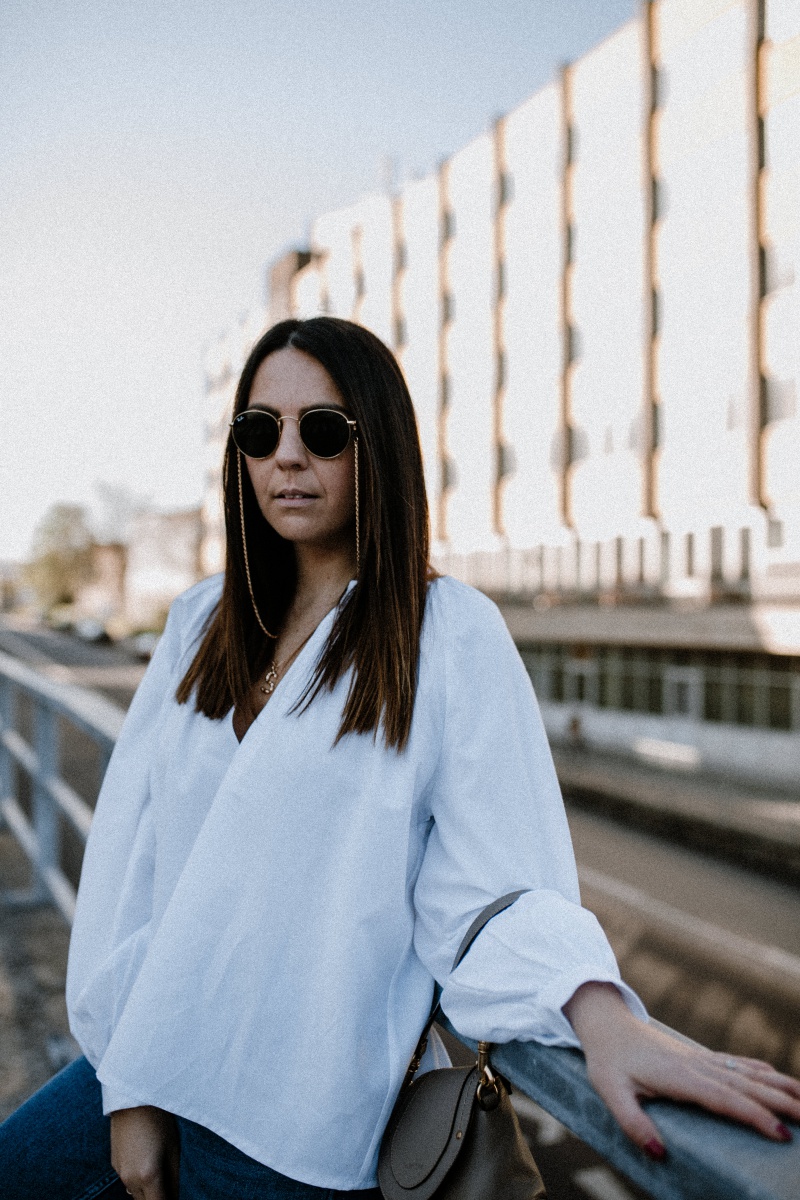 Sonnenbrille. RayBan // Brillenkette. Bershka // kette. Xenox // Bluse. NA-KD // Jeans. Bershka // Schuhe. Deichmann