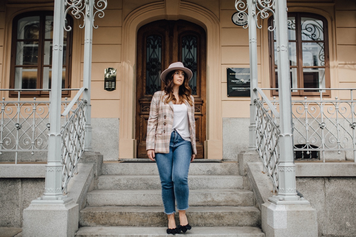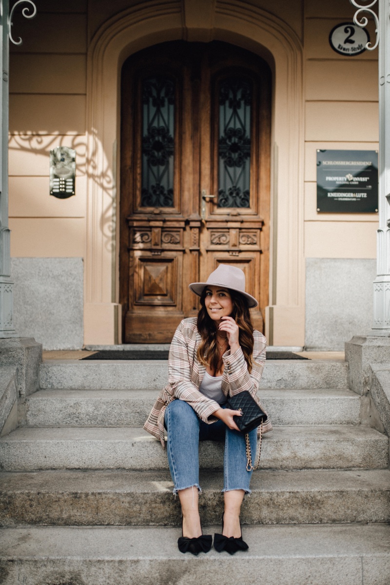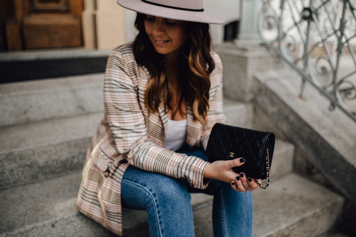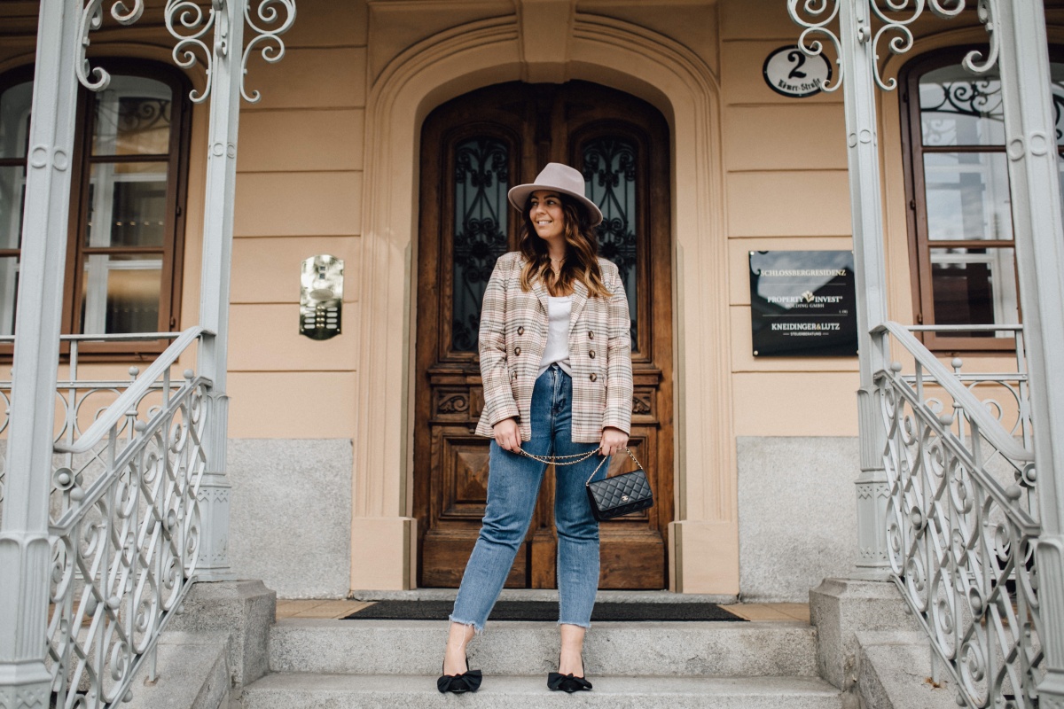 Top. H&M (alt) // Blazer. NA-KD // Hut. Asos // TASCHE. Chanel // Ohrringe. H&M // Jeans. Bershka // Schuhe. zara (alt)