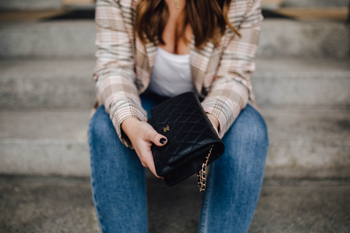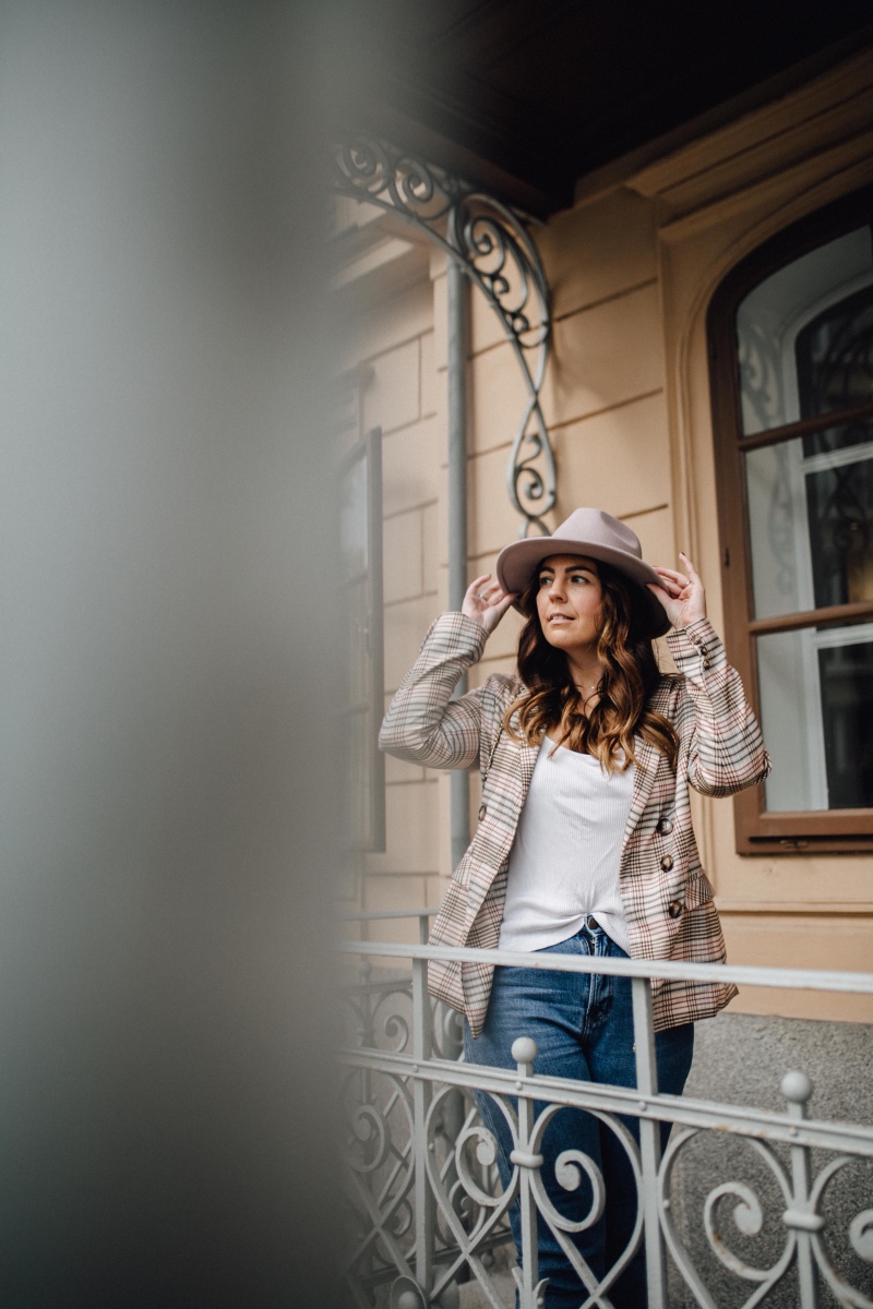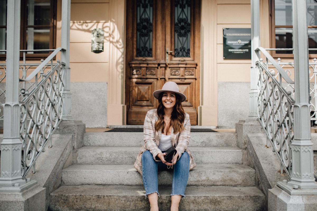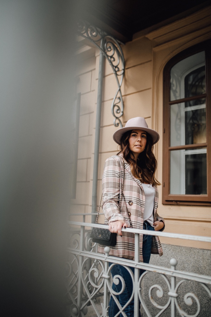 Top. H&M (alt) // Blazer. NA-KD // Hut. Asos // TASCHE. Chanel // Ohrringe. H&M // Jeans. Bershka // Schuhe. zara (alt)