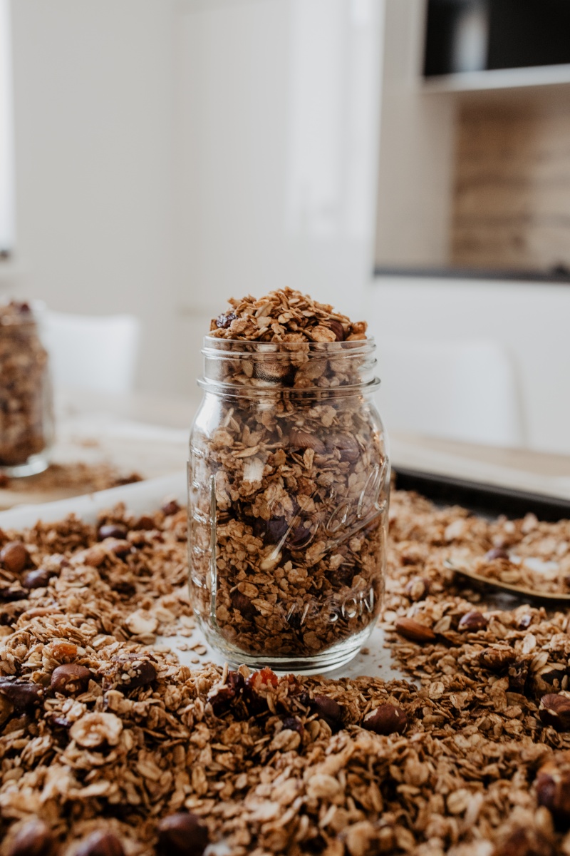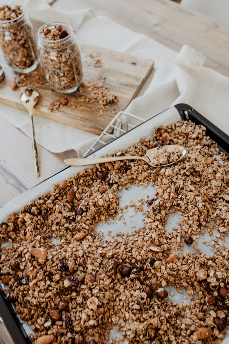 30 Minuten backen und ca. alle 10 Minuten die Masse auf dem Blech verrühren, damit alles gleichmäßig trocknen kann. Am Ende das fertige Granola auskühlen lassen. Am besten in Glasbehälter füllen.