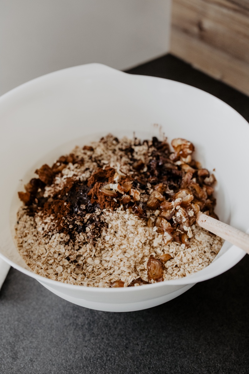 Zuerst die Datteln klein schneiden. Danach alle trockenen Zutaten in einer großen Schüssel vermischen.