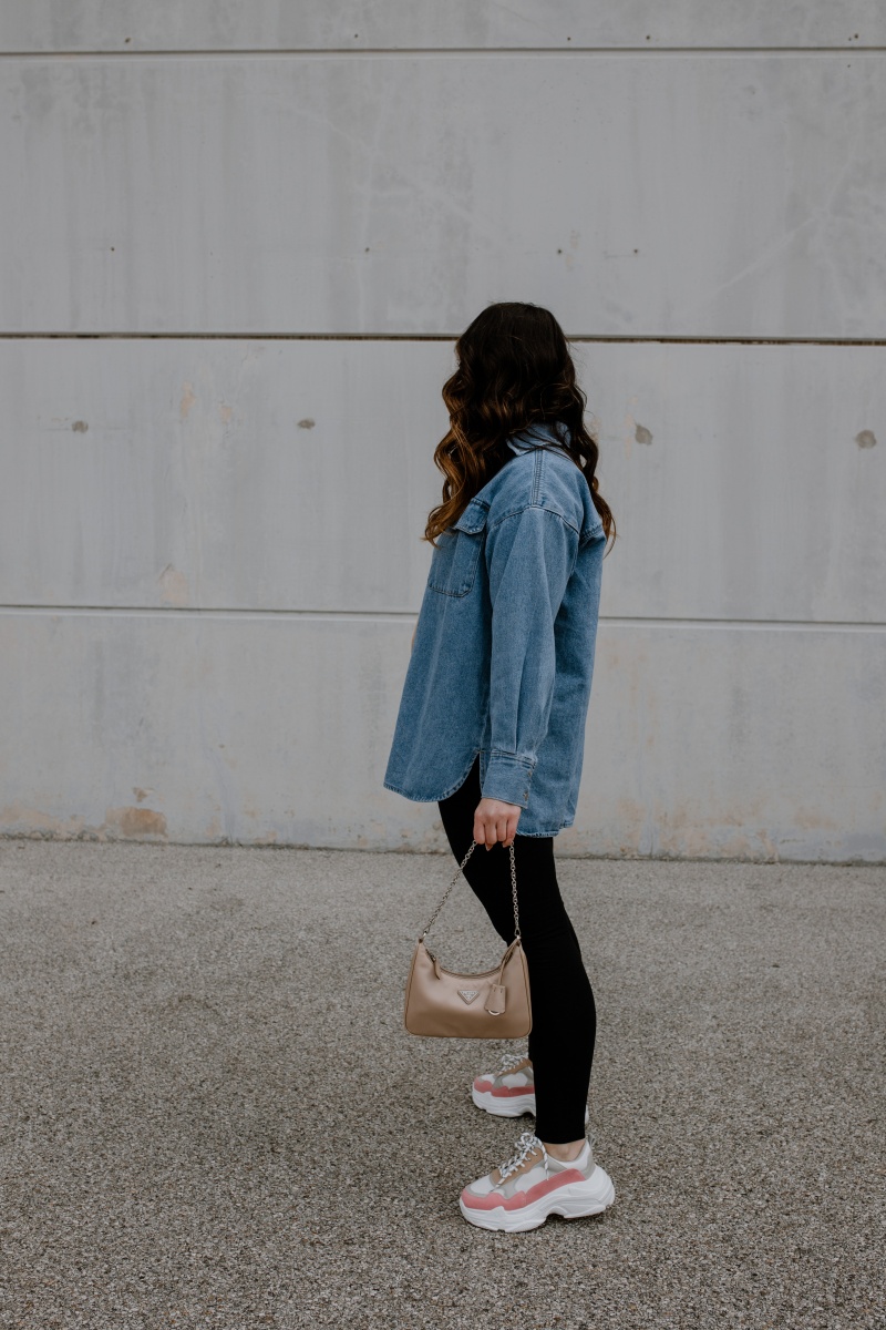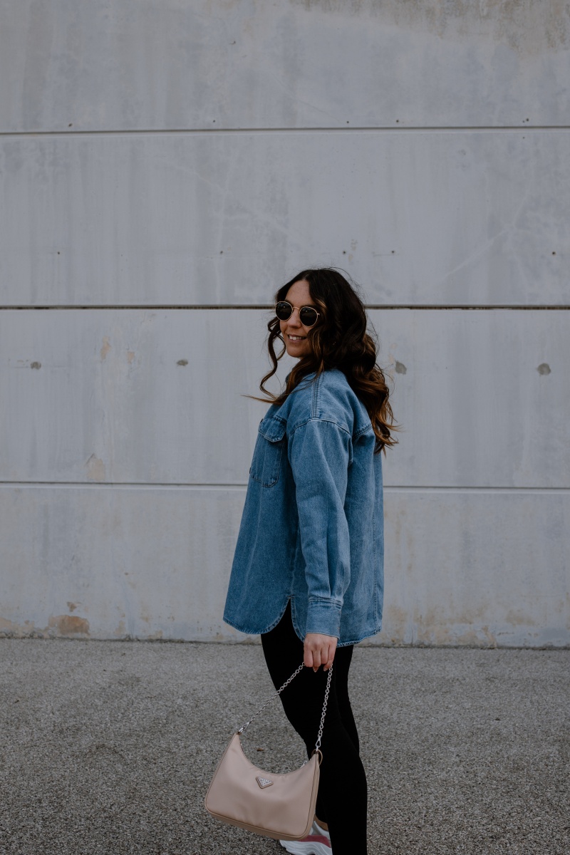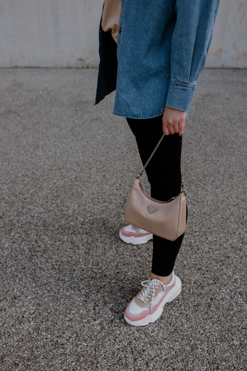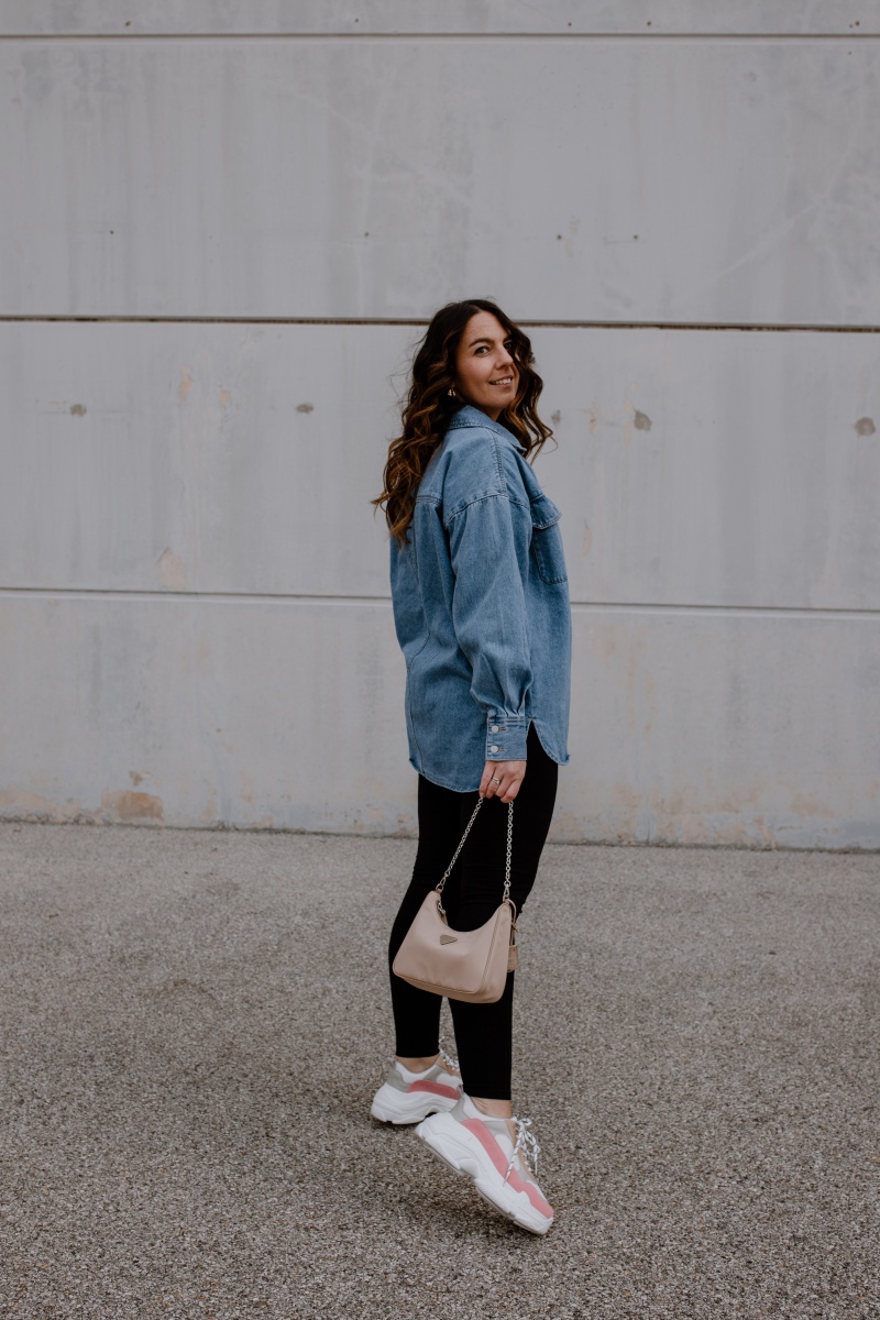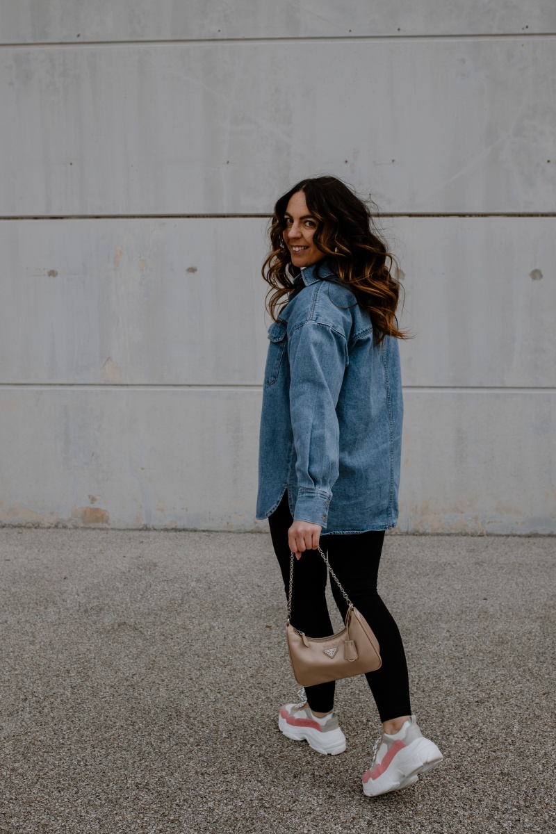 Shirt. H&M // Blusenjacke. H&M // Tasche. Prada // Leggings. H&M // Sneaker. NA-KD