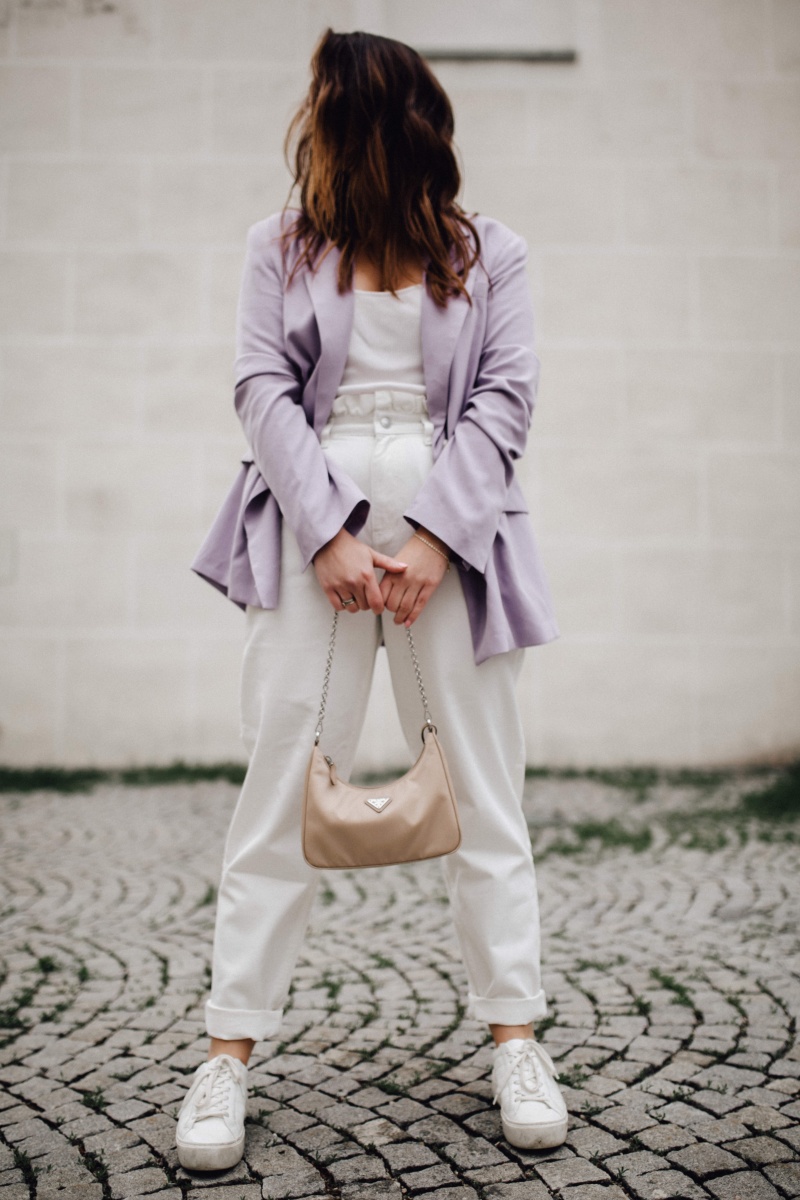 TOP. H&M / alt (ähnlich) // Blazer. Bershka (ähnlich) // Ohrring / Buchstabe A. Dior // Tasche. Prada // Ketten. Chanel & ariane ernst // Paperbag Jeans. NA-KD // Sneaker. Mango / alt (ähnlich)