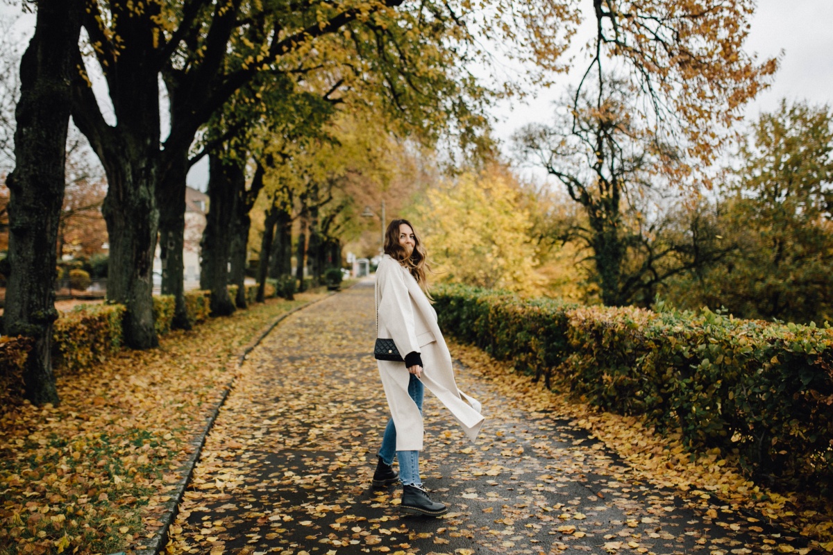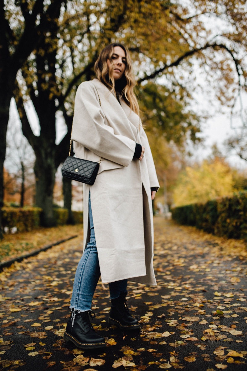 Pullover. NA-KD (ähnlich) // Mantel. H&M (ähnlich oder braune Version) // Jeans. Bershka // Tasche. Chanel // Boots. Dr. Martens