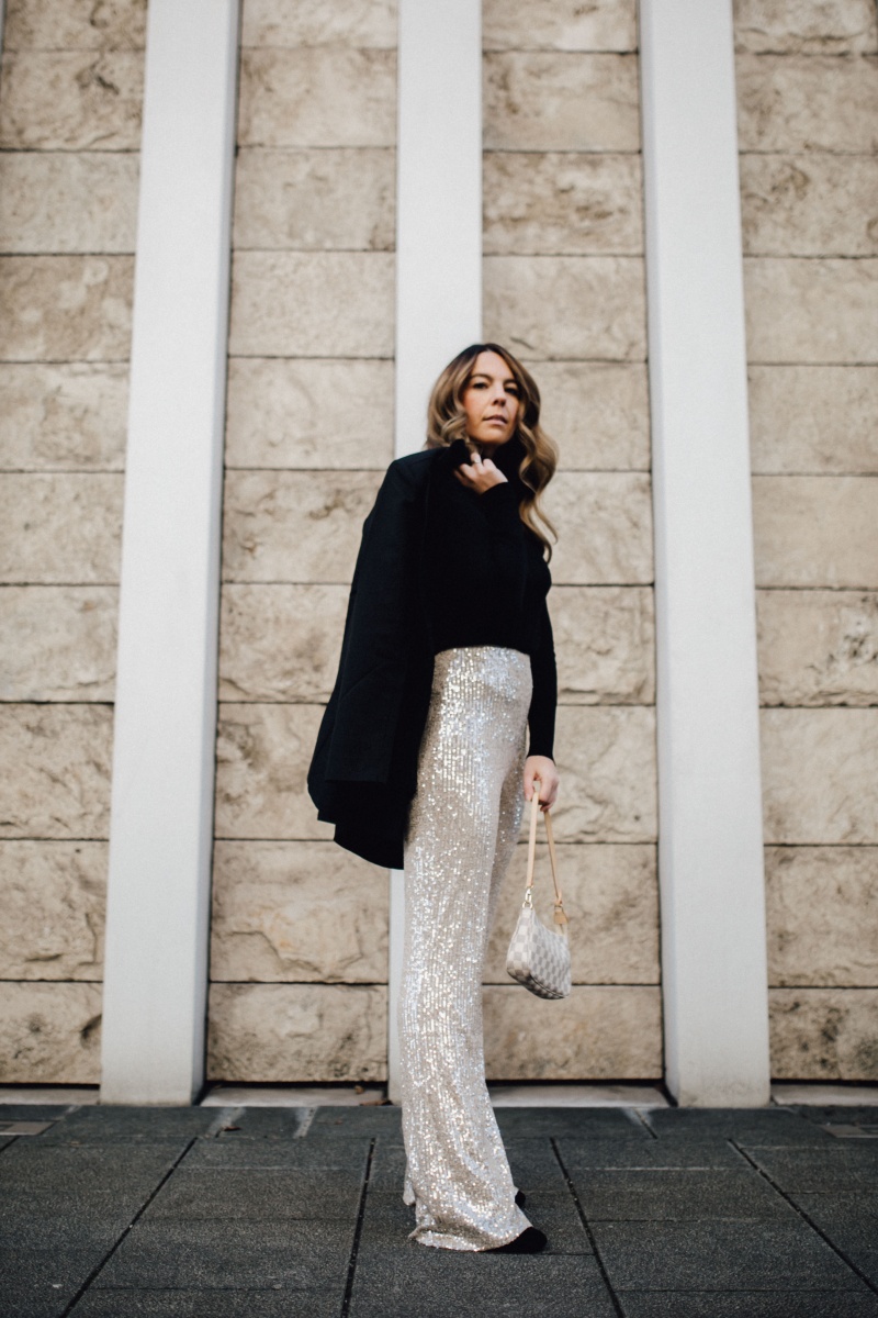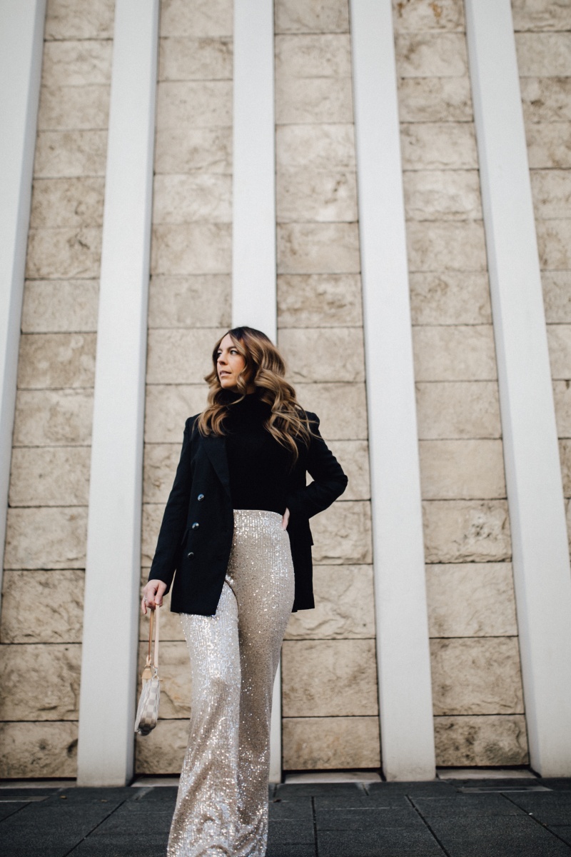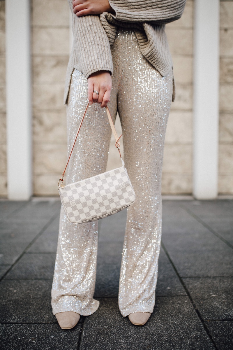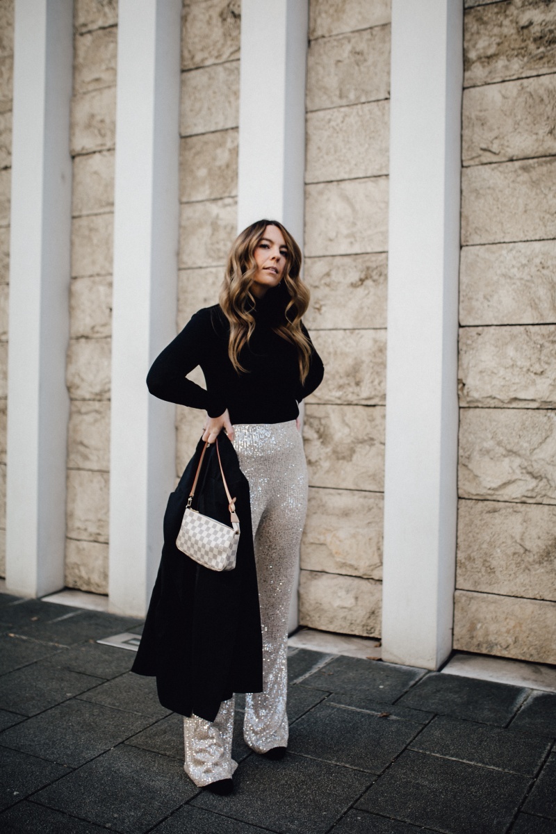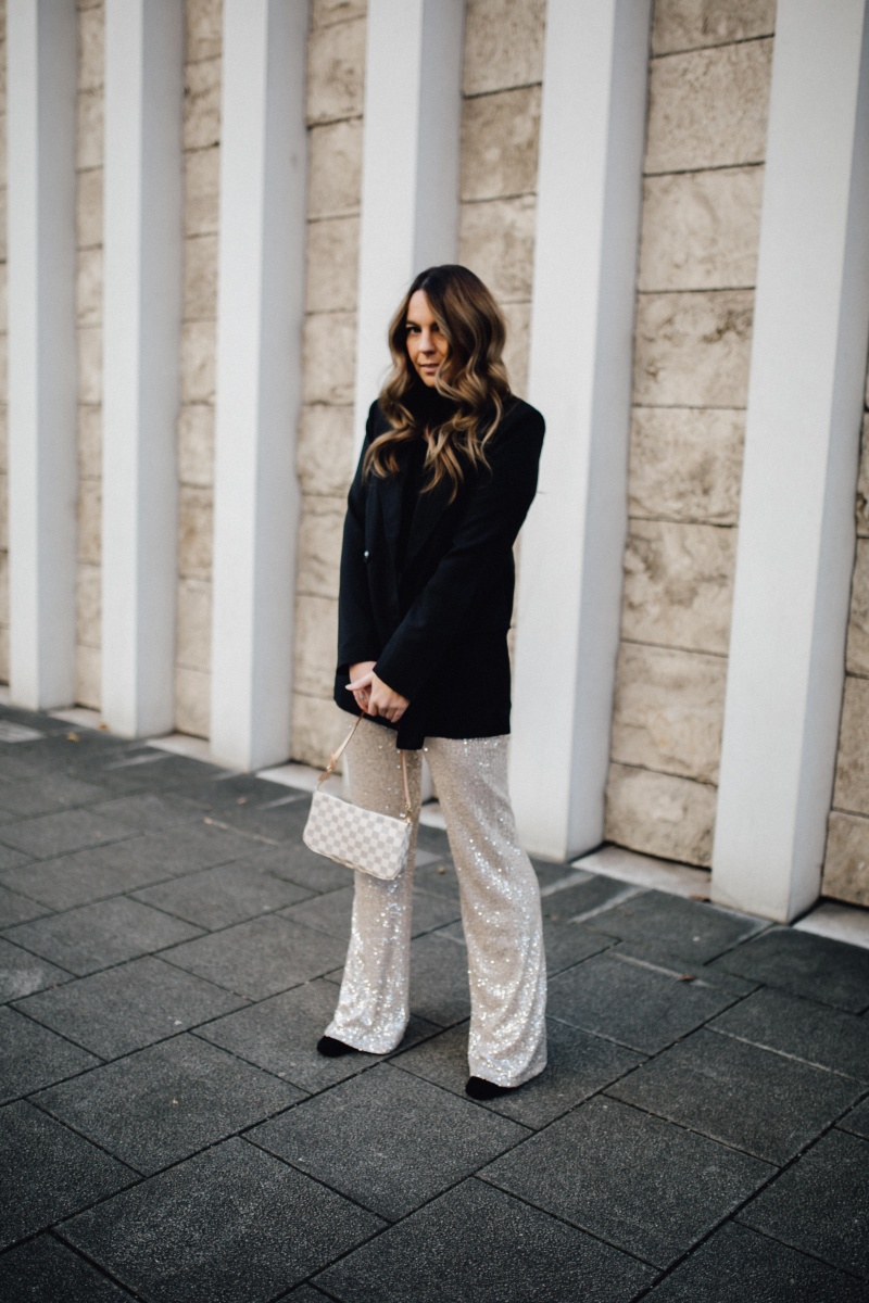 Outfitdetails: Pailettenhose. NA-KD (ähnlich) // Pullover. H&M (ähnlich) // Rollkragenpullover. ZARA (ähnlich) // Blazer. NA-KD (ähnlich) // Tasche. Louis Vuitton // Stiefeletten schwarz. BERSHKA (ähnlich) // Stiefeletten beige. NA-KD (ähnlich)