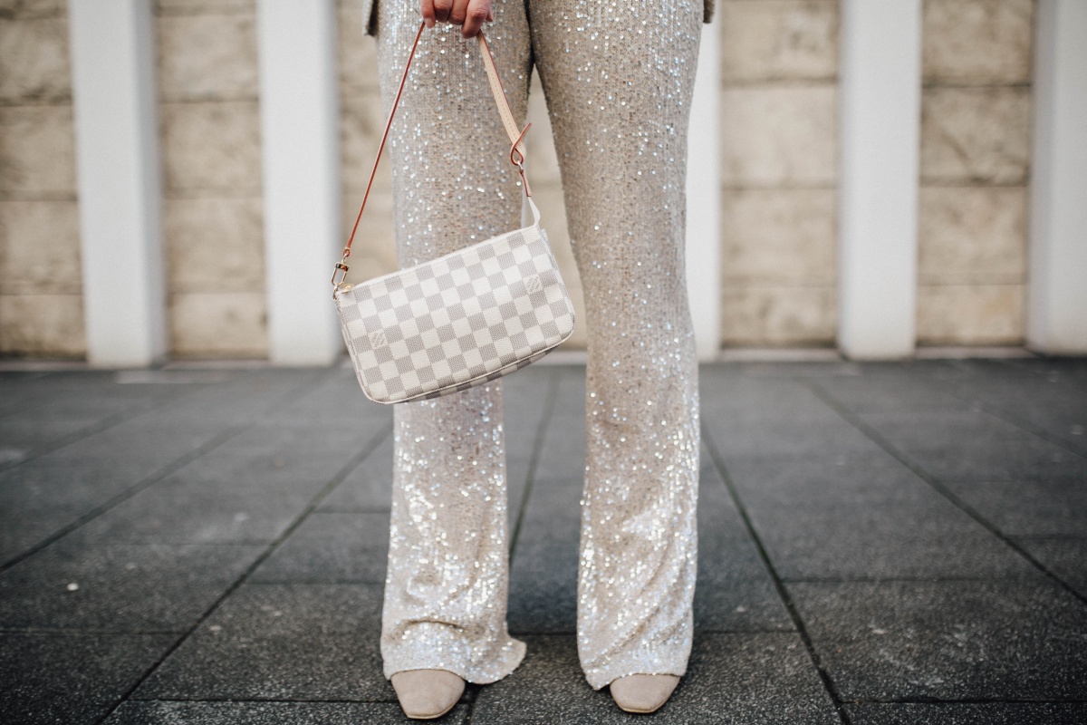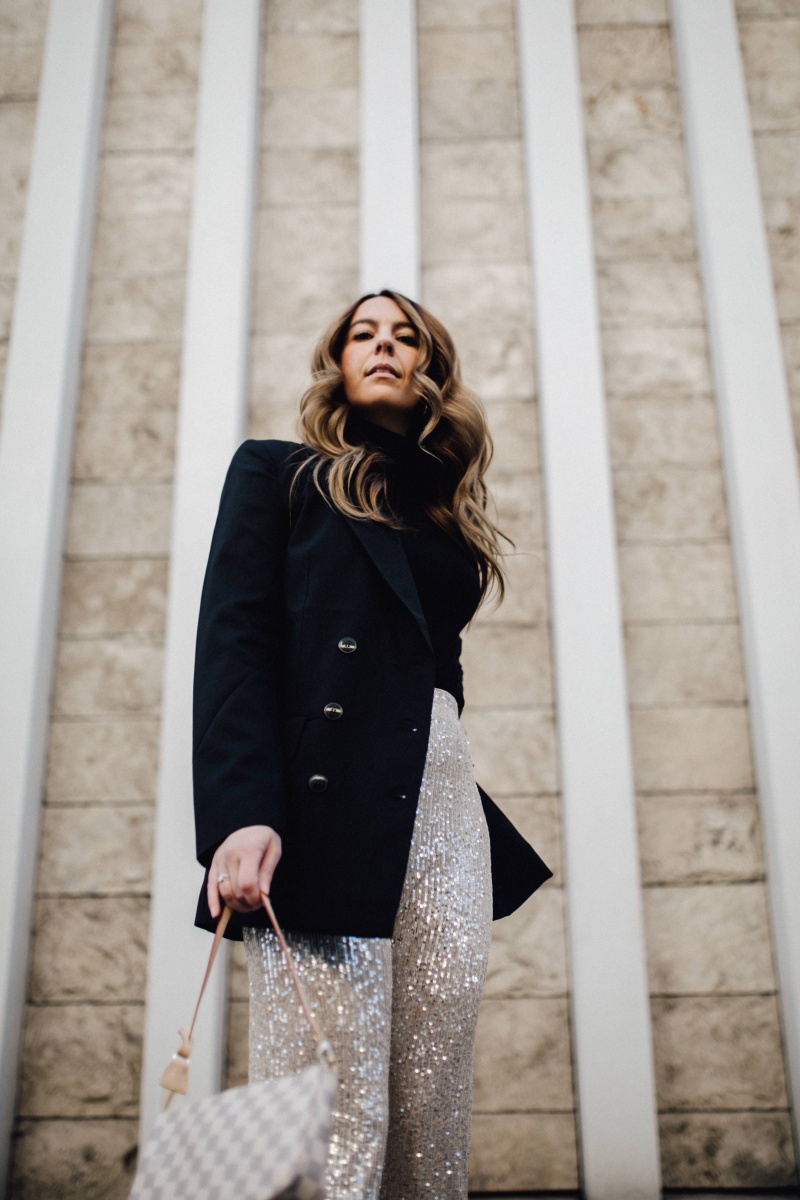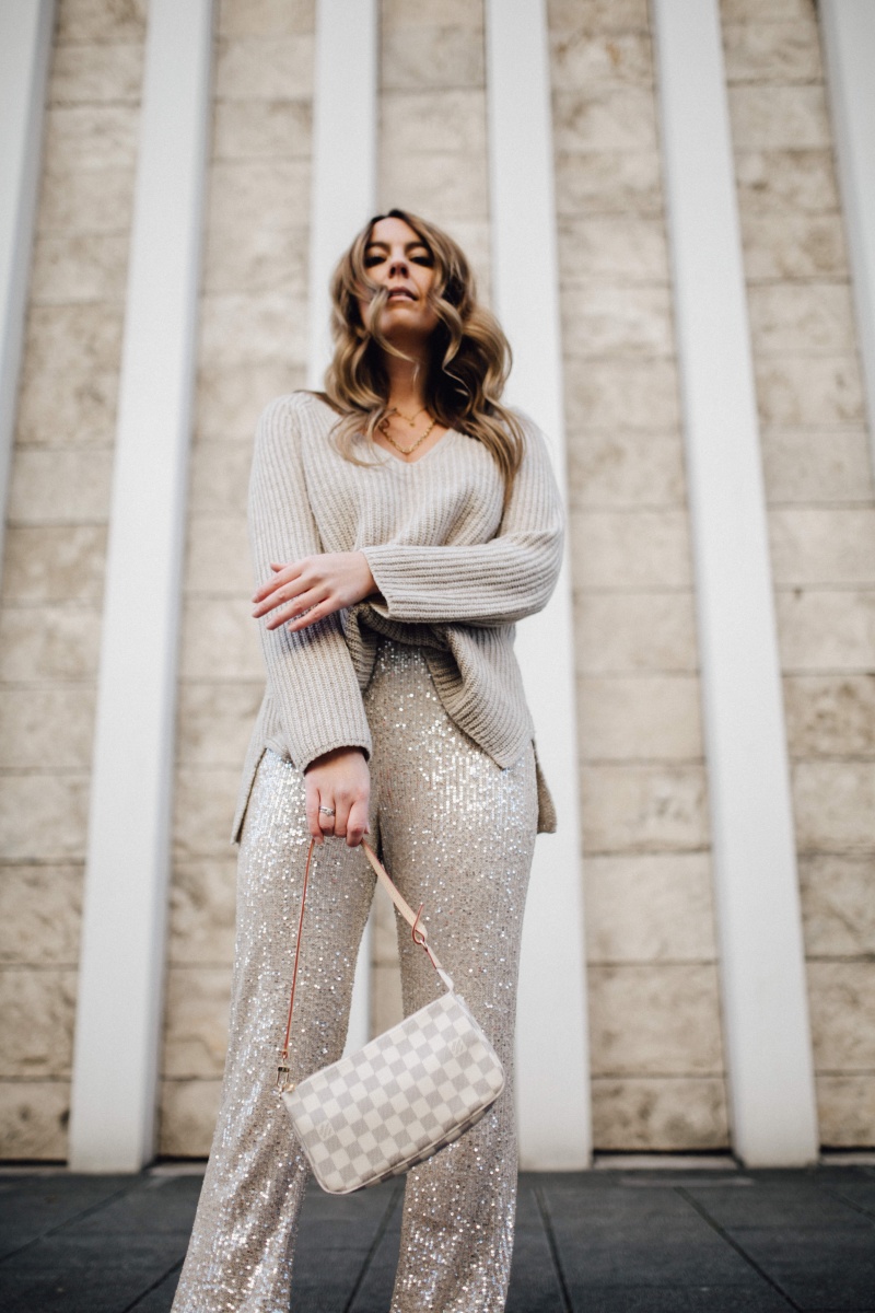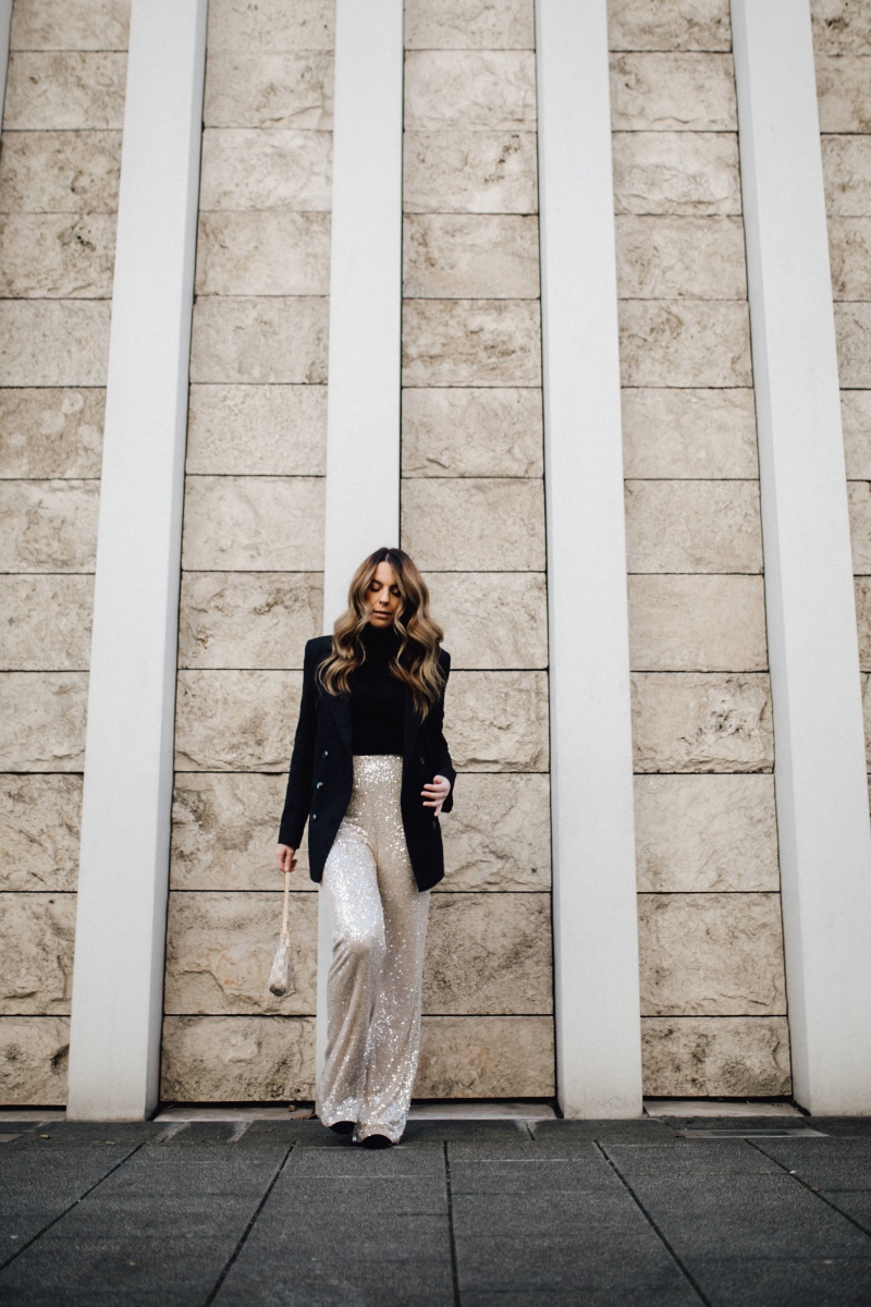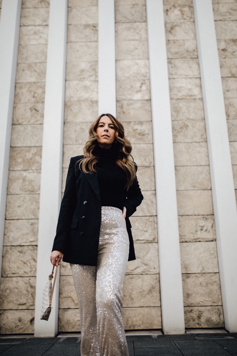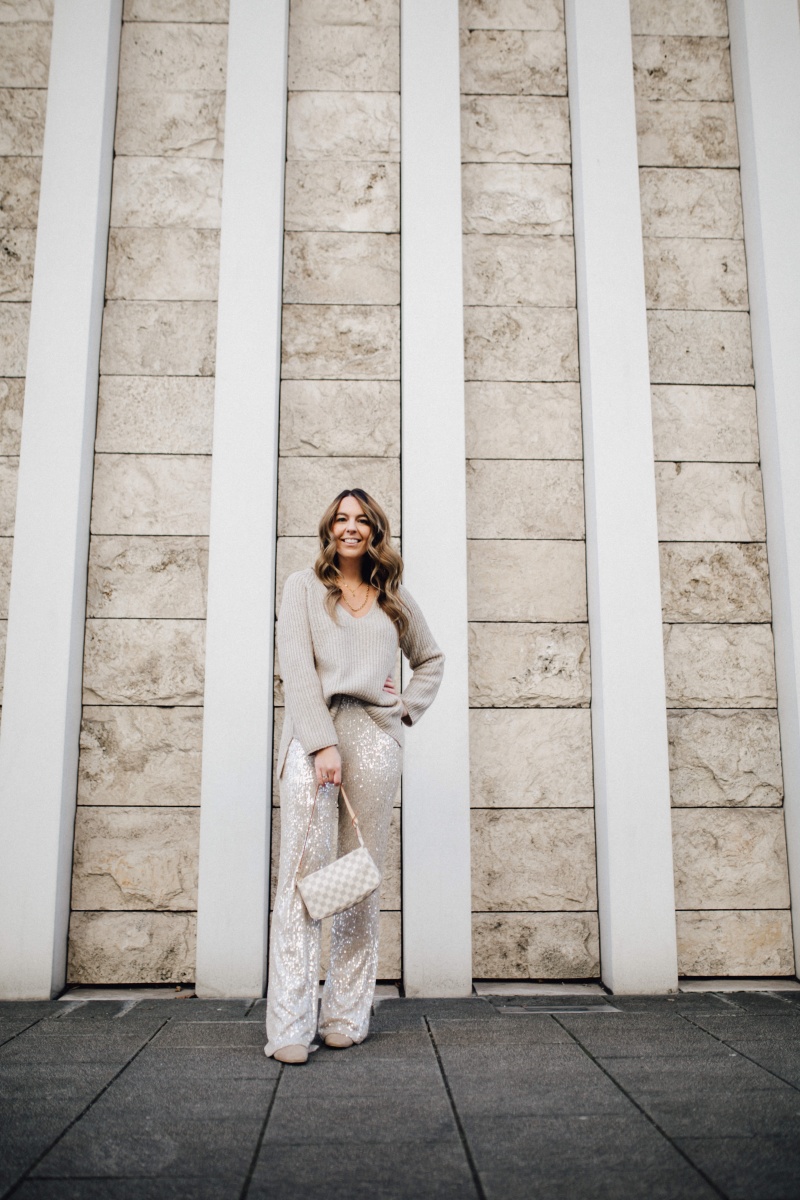 Outfitdetails: Pailettenhose. NA-KD (ähnlich) // Pullover. H&M (ähnlich) // Rollkragenpullover. ZARA (ähnlich) // Blazer. NA-KD (ähnlich) // Tasche. Louis Vuitton // Stiefeletten schwarz. BERSHKA (ähnlich) // Stiefeletten beige. NA-KD (ähnlich)