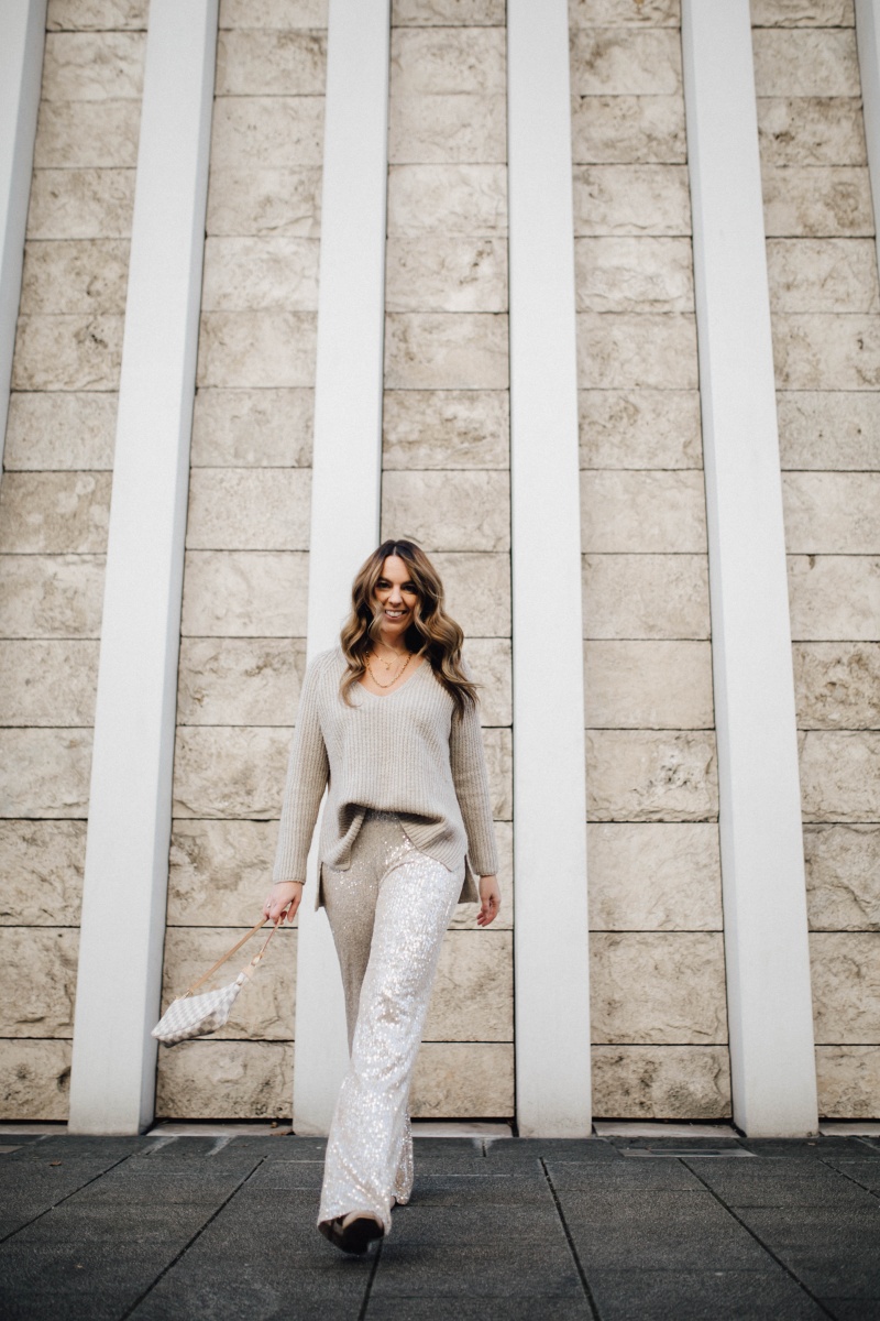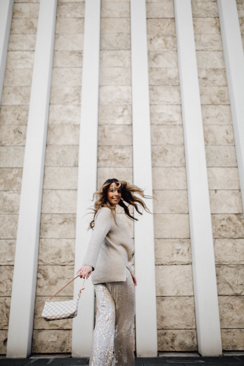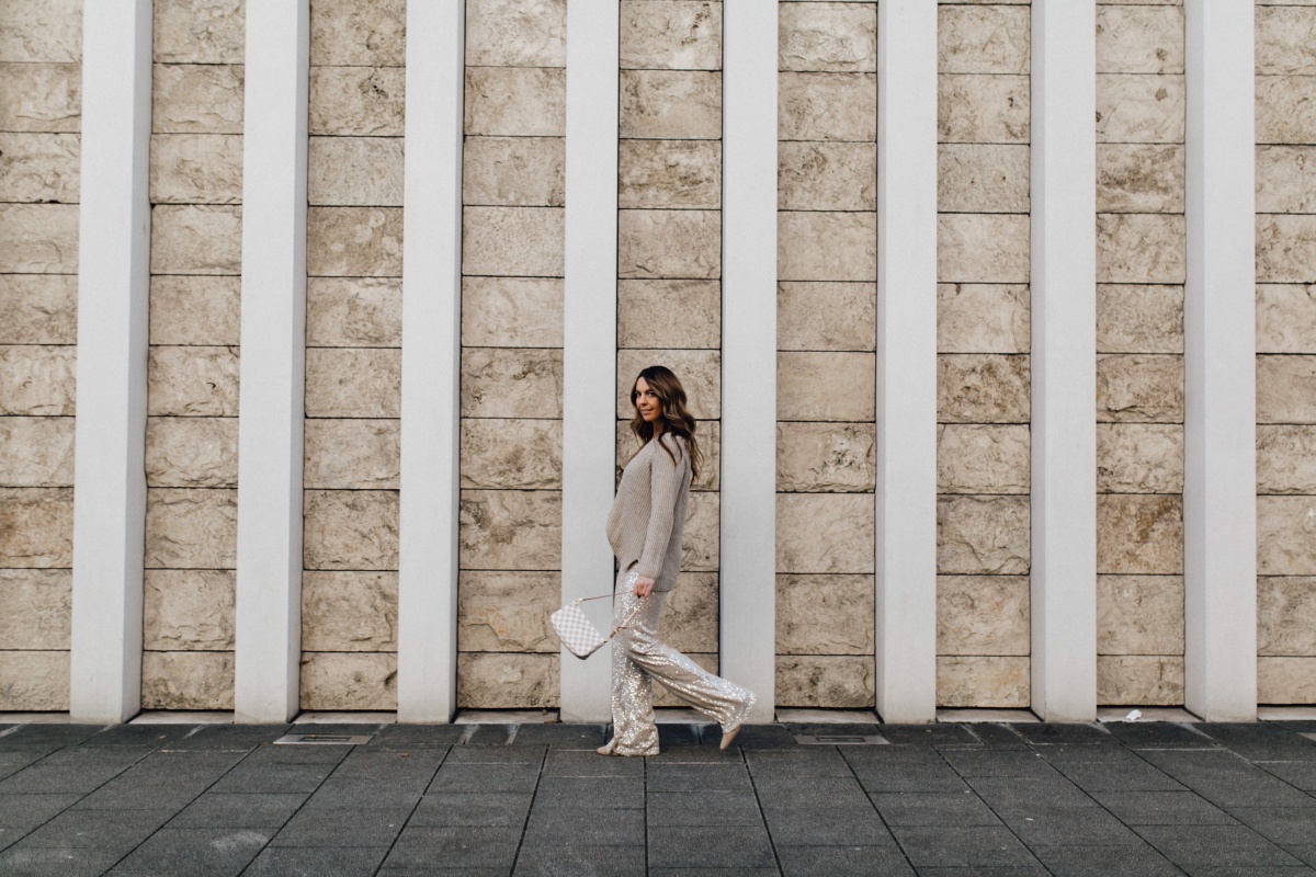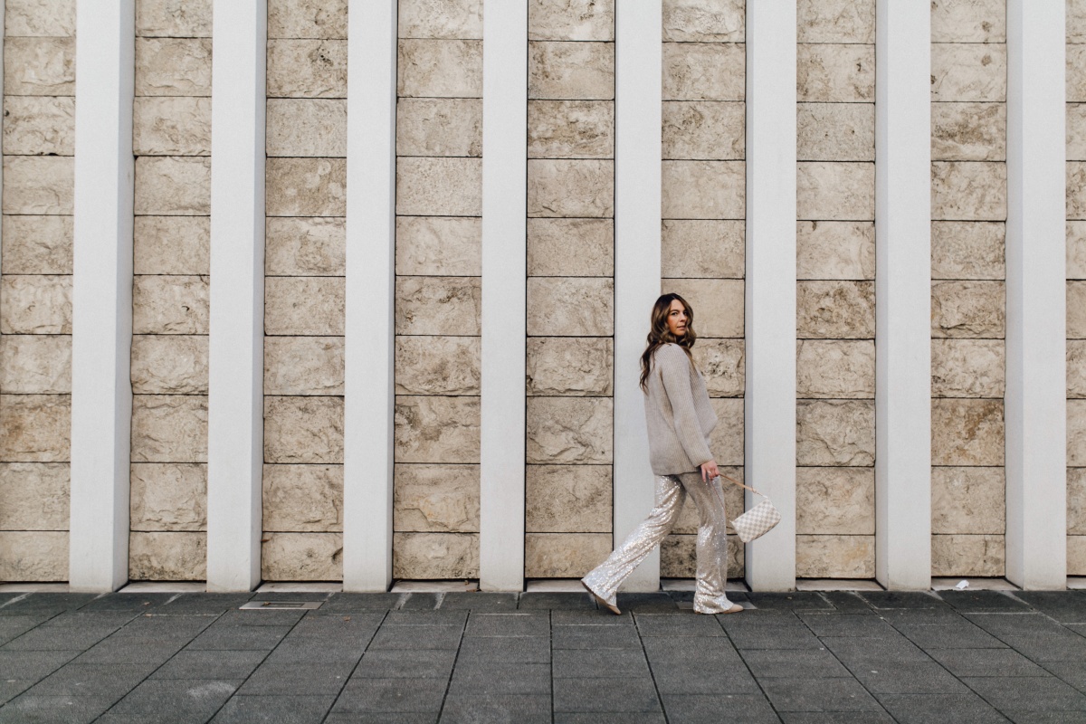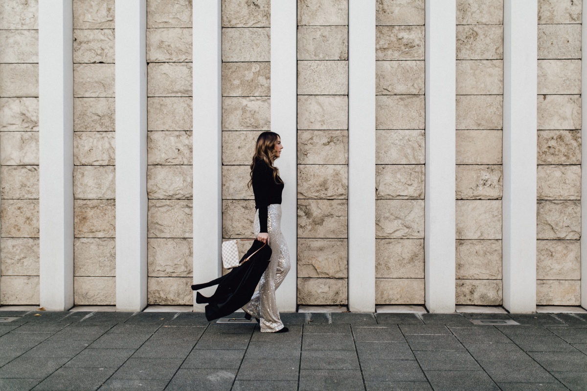 Outfitdetails: Pailettenhose. NA-KD (ähnlich) // Pullover. H&M (ähnlich) // Rollkragenpullover. ZARA (ähnlich) // Blazer. NA-KD (ähnlich) // Tasche. Louis Vuitton // Stiefeletten schwarz. BERSHKA (ähnlich) // Stiefeletten beige. NA-KD (ähnlich)