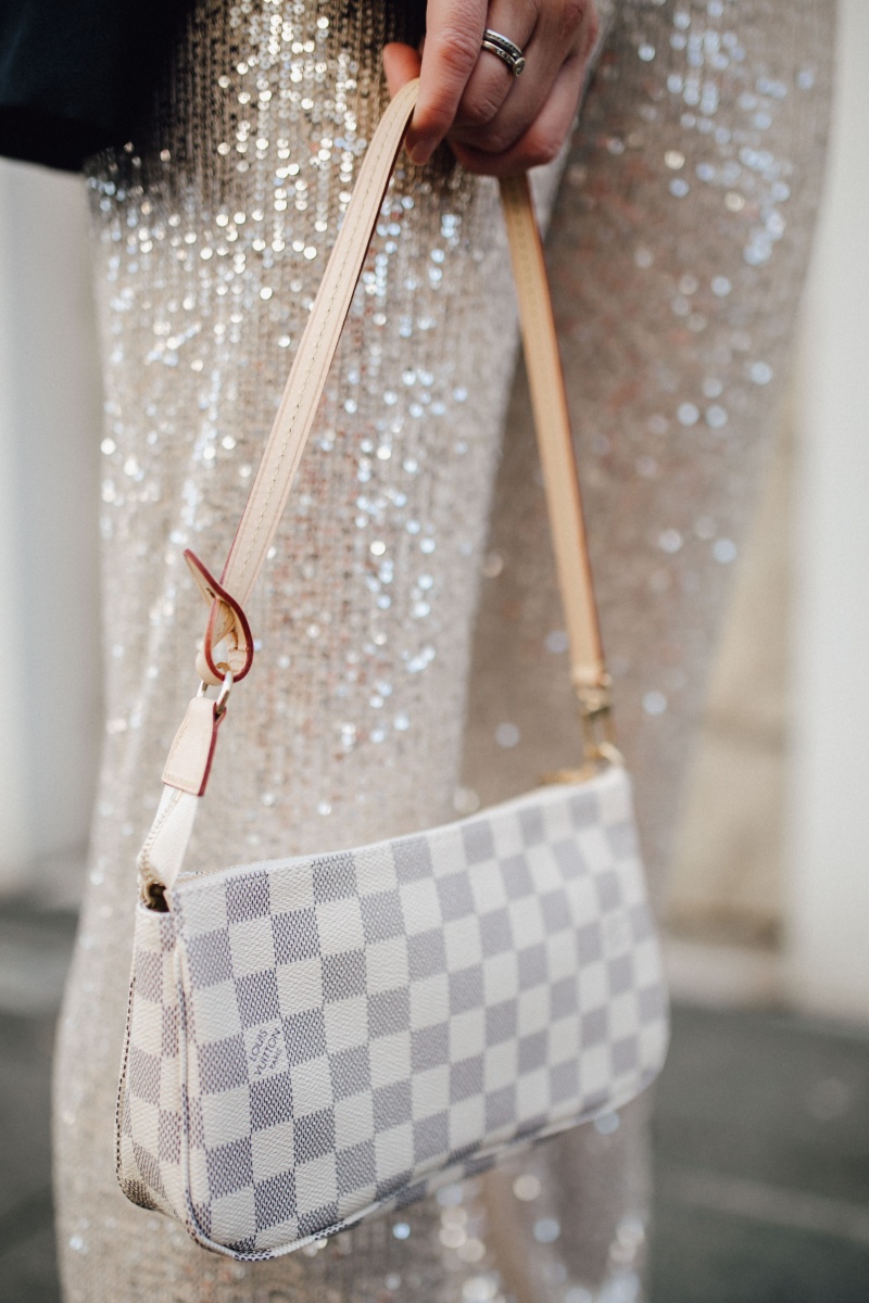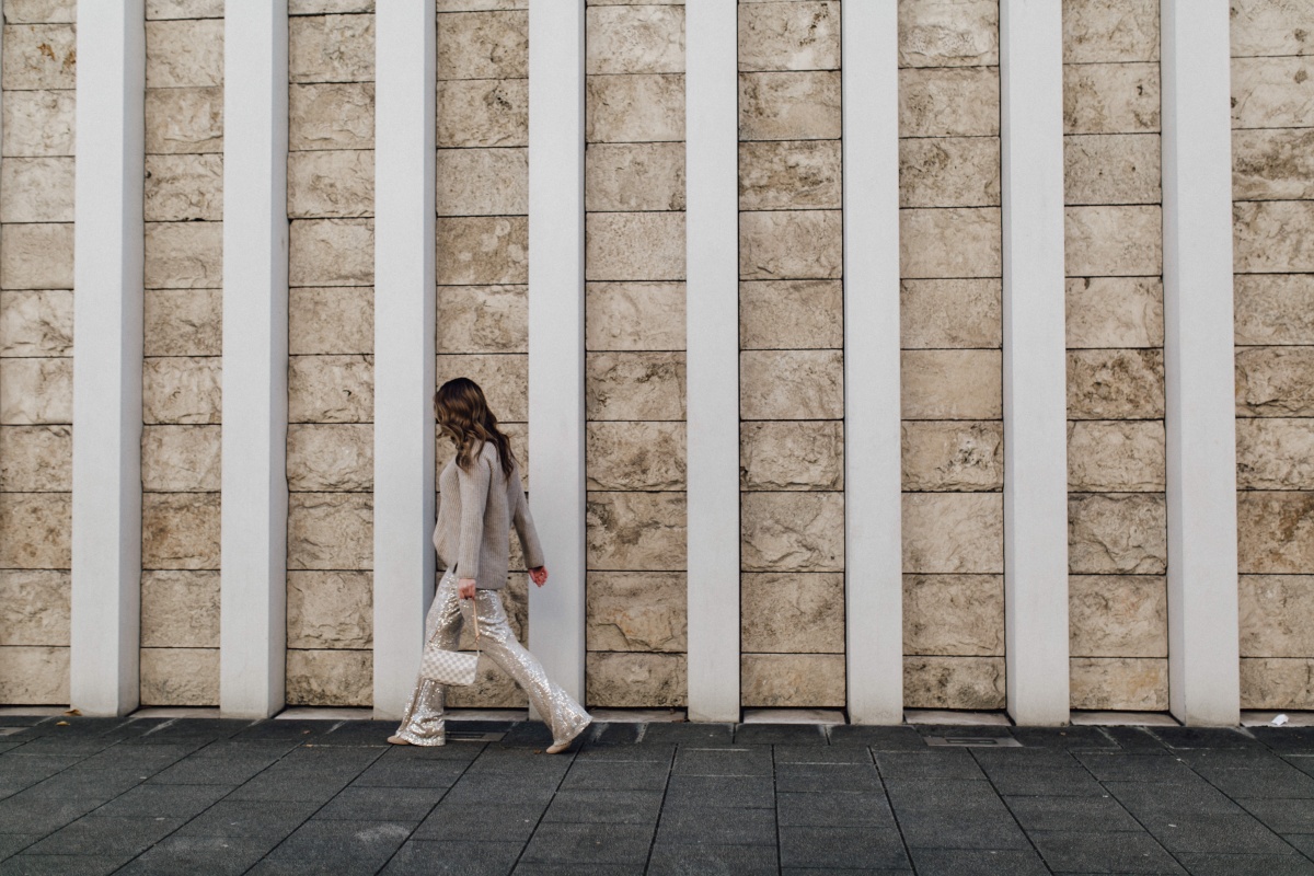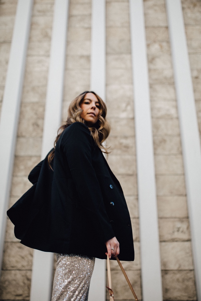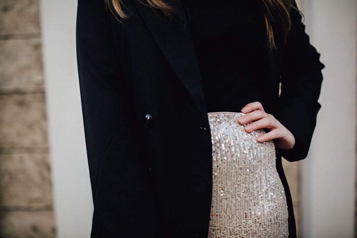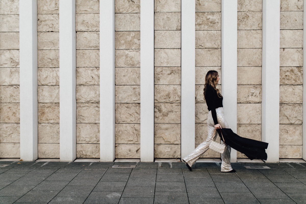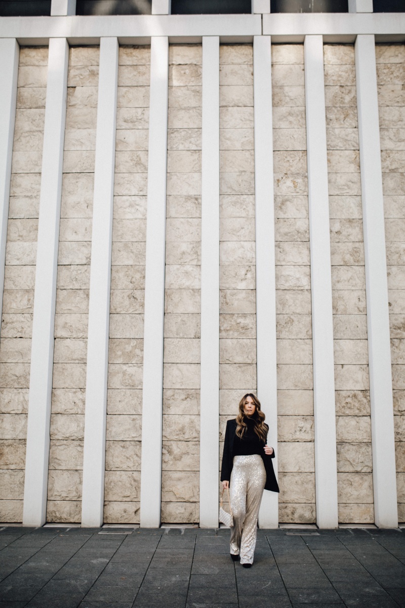 Outfitdetails: Pailettenhose. NA-KD (ähnlich) // Pullover. H&M (ähnlich) // Rollkragenpullover. ZARA (ähnlich) // Blazer. NA-KD (ähnlich) // Tasche. Louis Vuitton // Stiefeletten schwarz. BERSHKA (ähnlich) // Stiefeletten beige. NA-KD (ähnlich)