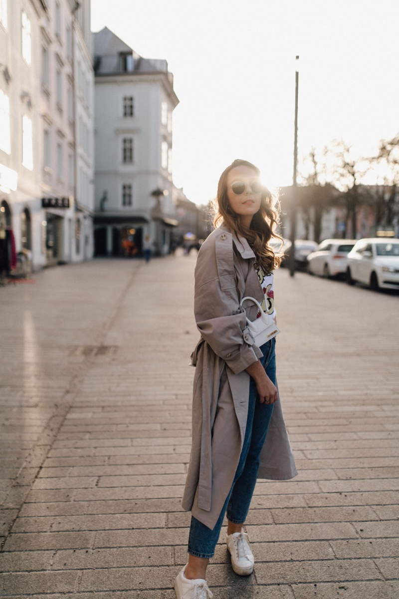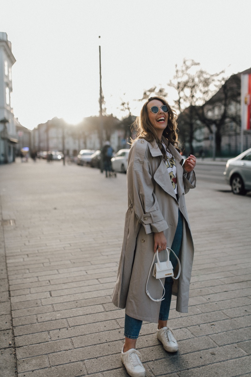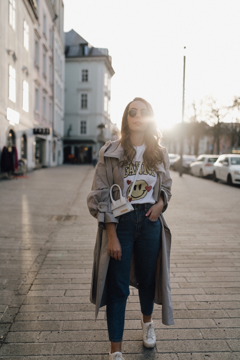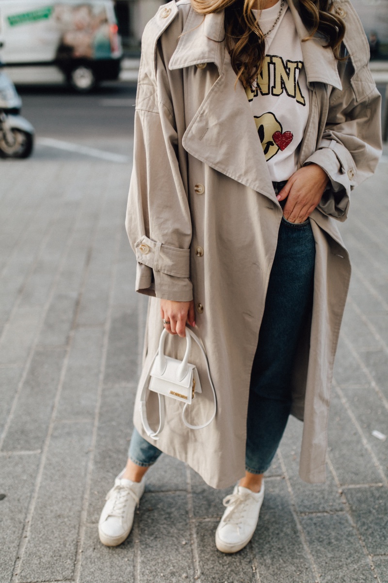 Outfit: Jeans. H&M // Shirt. GANNI (ähnlich) // Trenchcoat. Nasty Gal (ähnlich) // Kette. fafe collection // Kreolen. Mango // Tasche. Jacquemus // Sneaker. Mango (ähnlich)