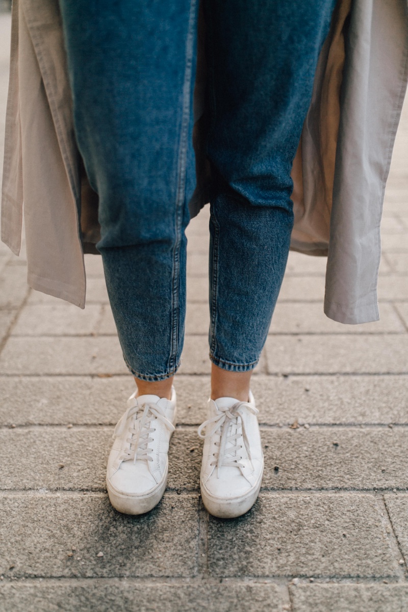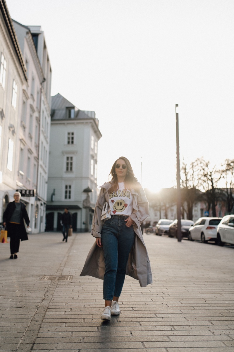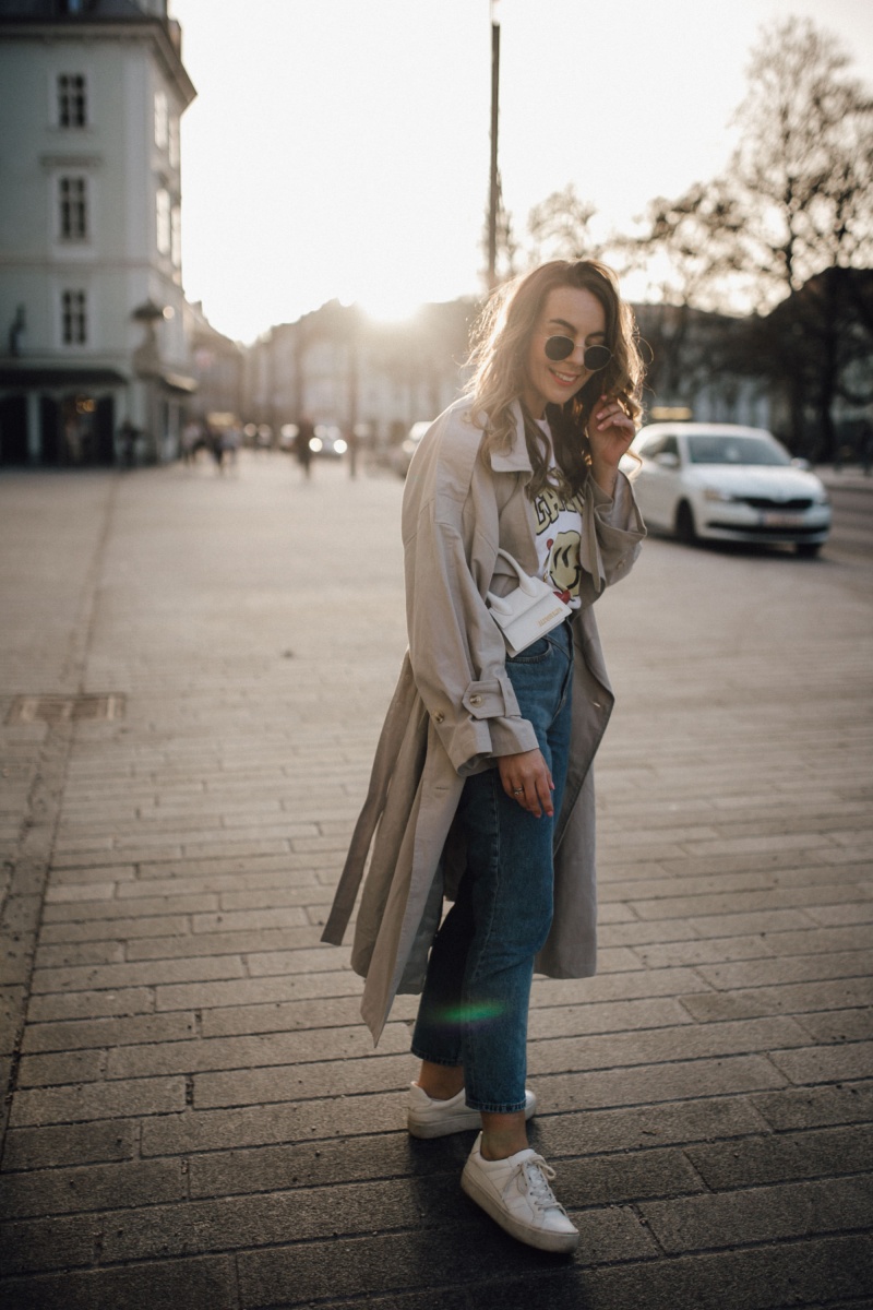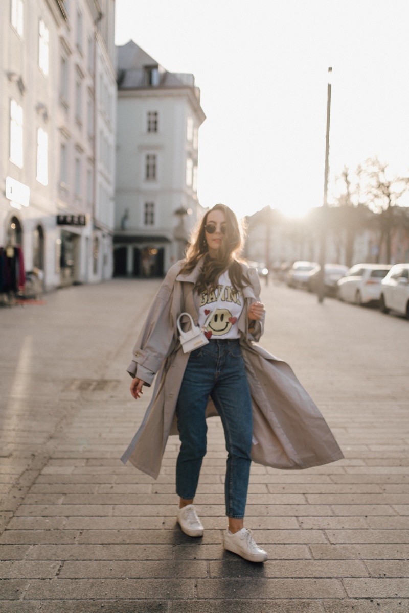 Outfit: Jeans. H&M // Shirt. GANNI (ähnlich) // Trenchcoat. Nasty Gal (ähnlich) // Kette. fafe collection // Kreolen. Mango // Tasche. Jacquemus // Sneaker. Mango (ähnlich)