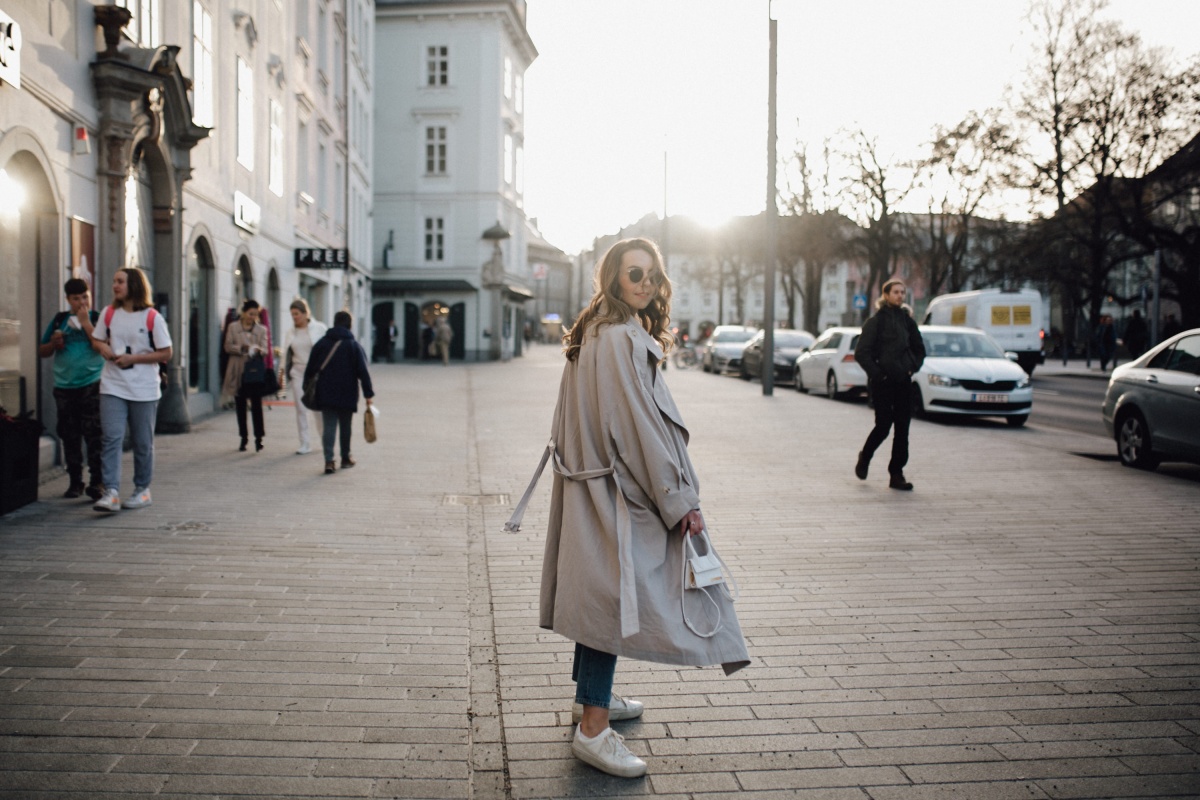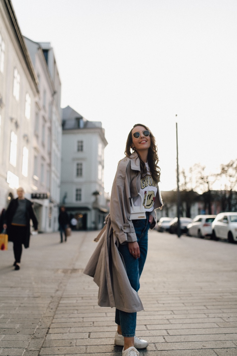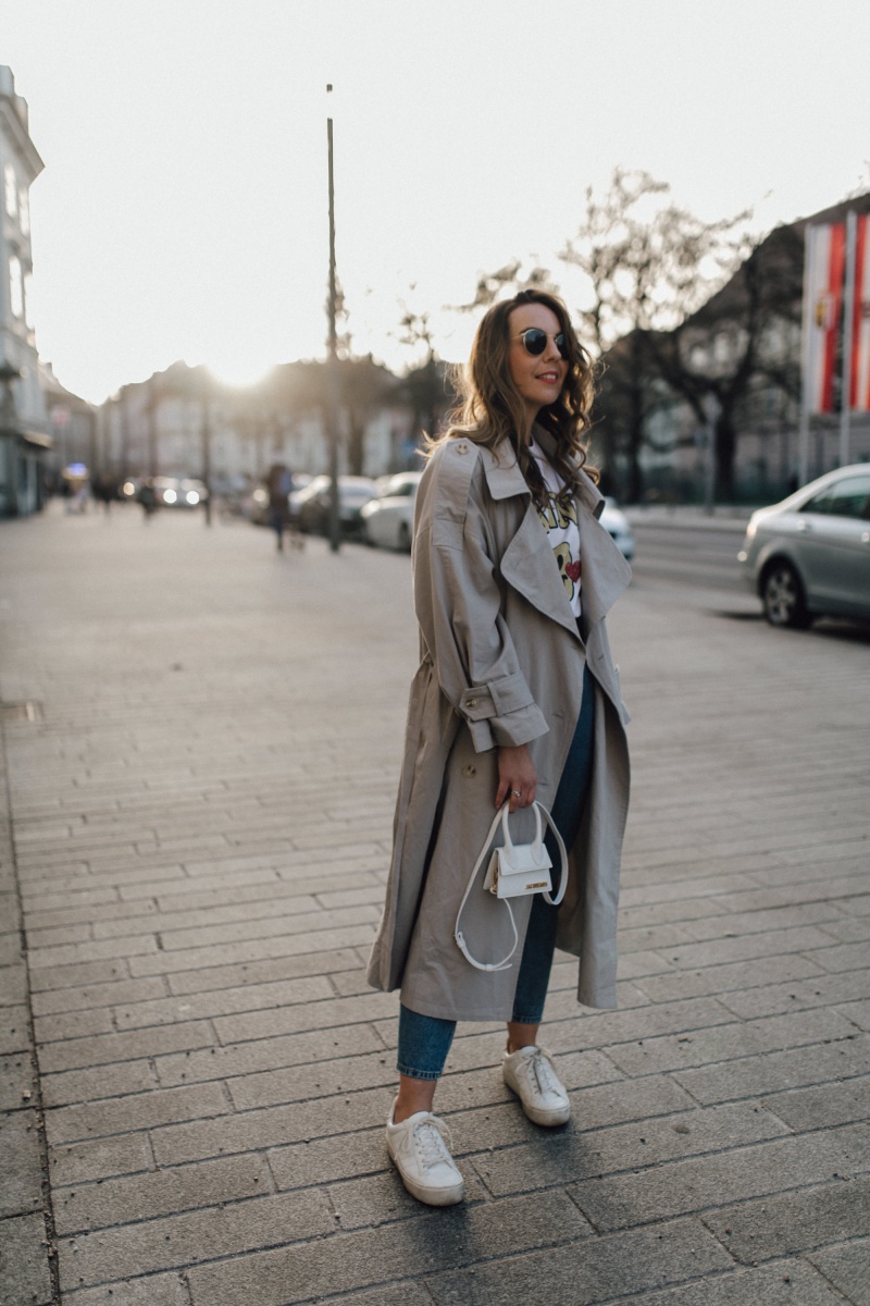 Was im Frühling auch nicht fehlen darf – eine leichte Jacke für den Übergang. Ich habe mich für einen Trenchcoat im Oversize-Look entschieden. Zugegeben war ich anfangs etwas skeptisch, da er doch sehr groß ist. Aber jetzt bin ich total hin und weg. Der perfekte Begleiter für wärmere Tage.