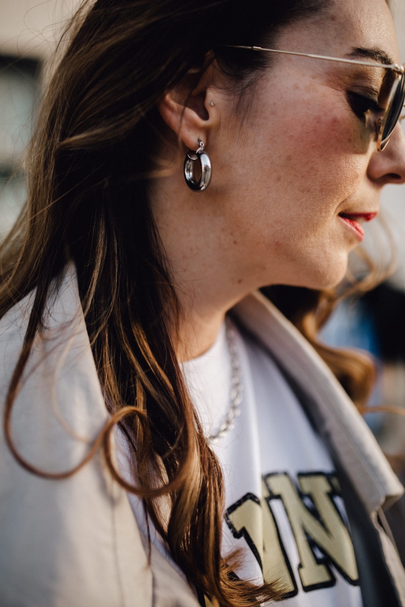 Momentan liebe ich Schmuckstücke in silber. Die Kette ist ein echter Hingucker, da braucht man nicht mehr. Klassische Kreolen dazu – egal in welcher Größe und fertig ist der Look.
