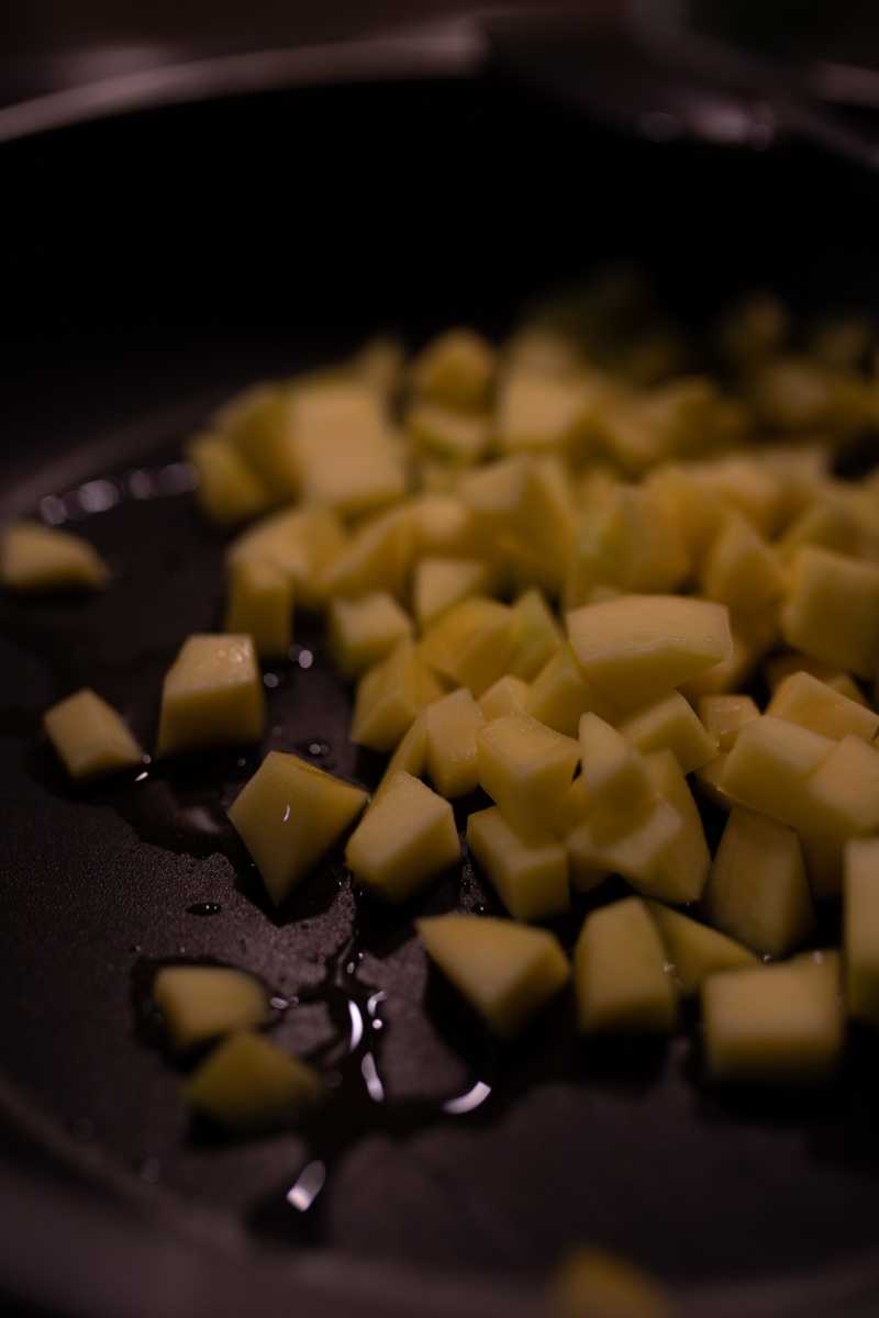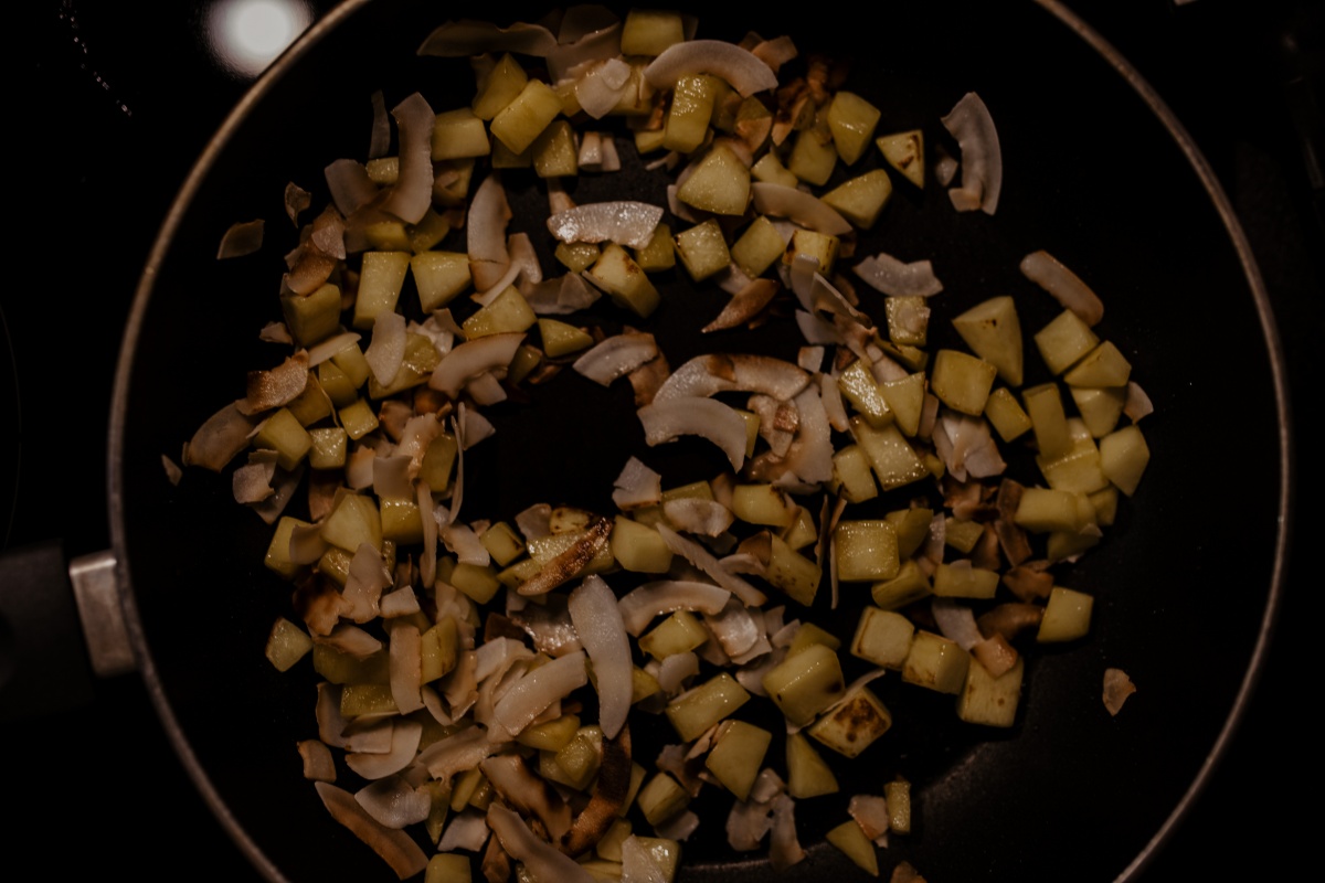 Zuerst Mango in kleine Stücke schneiden und mit etwas Kokosöl in einer Pfanne anbraten. Kokoschips dazu geben und leicht anrösten. Danach zur Seite stellen.