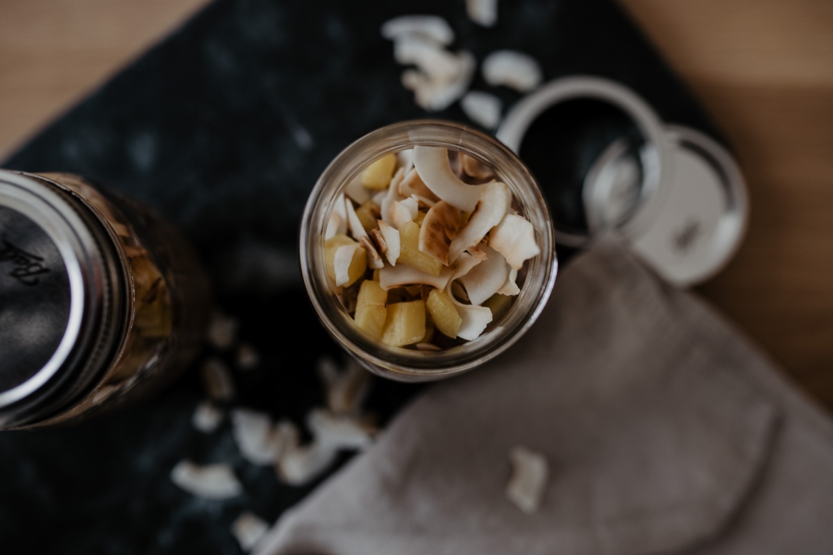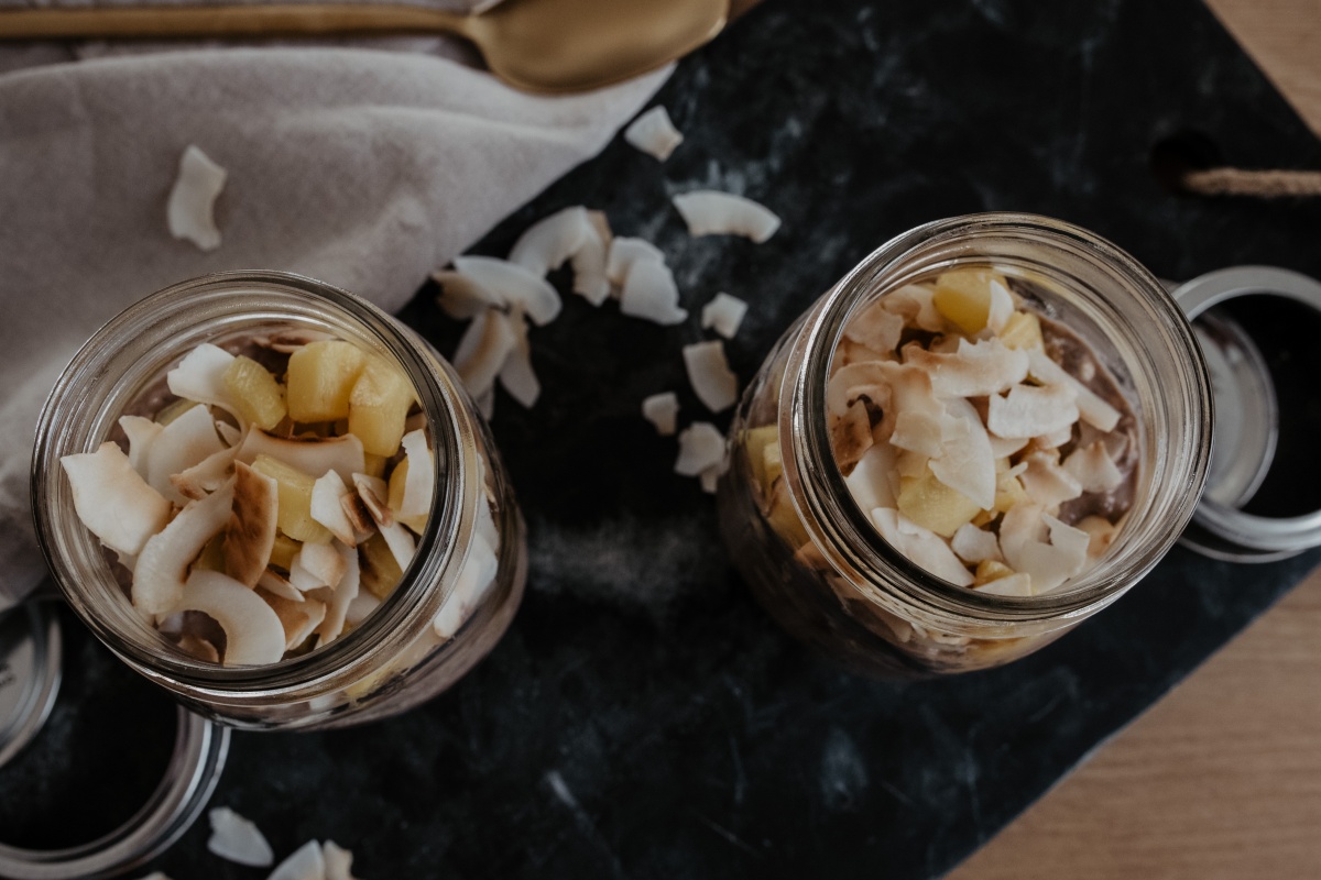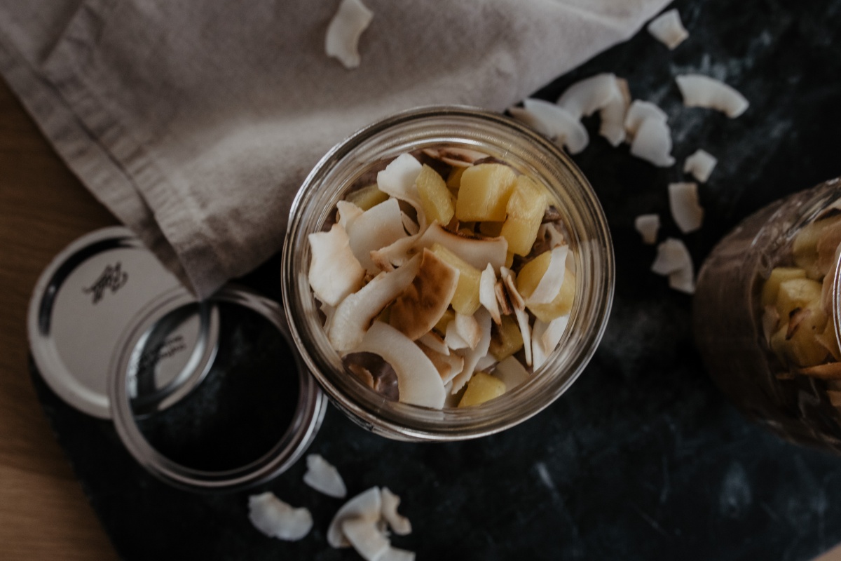 Als Abschluss Kokos & Mango und dann wieder ab in den Kühlschrank. Im Kühlschrank sind die Overnight Oats ein paar Tage haltbar.