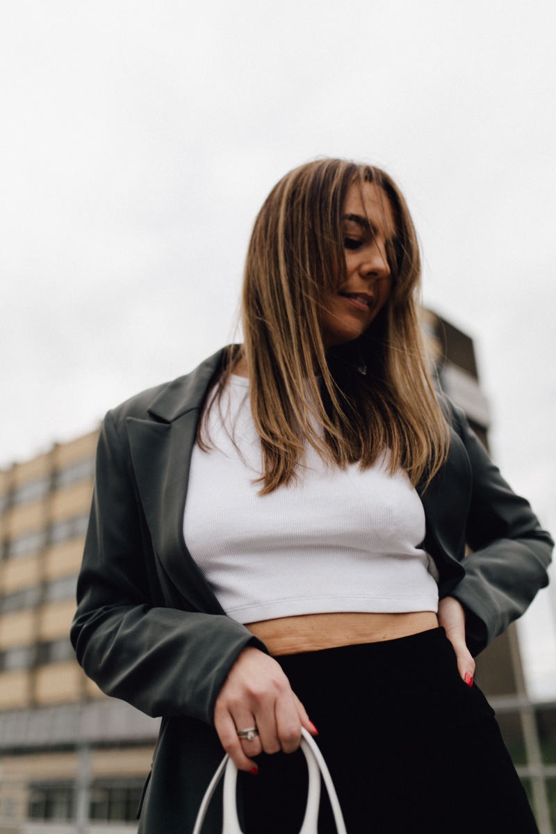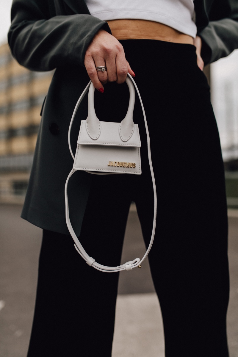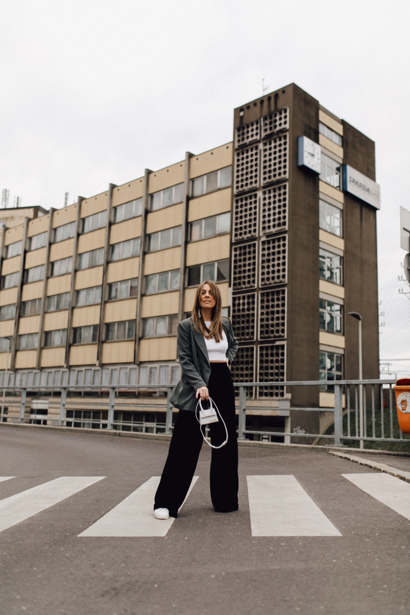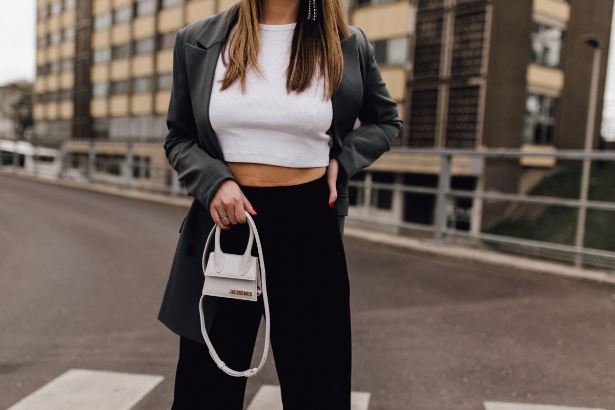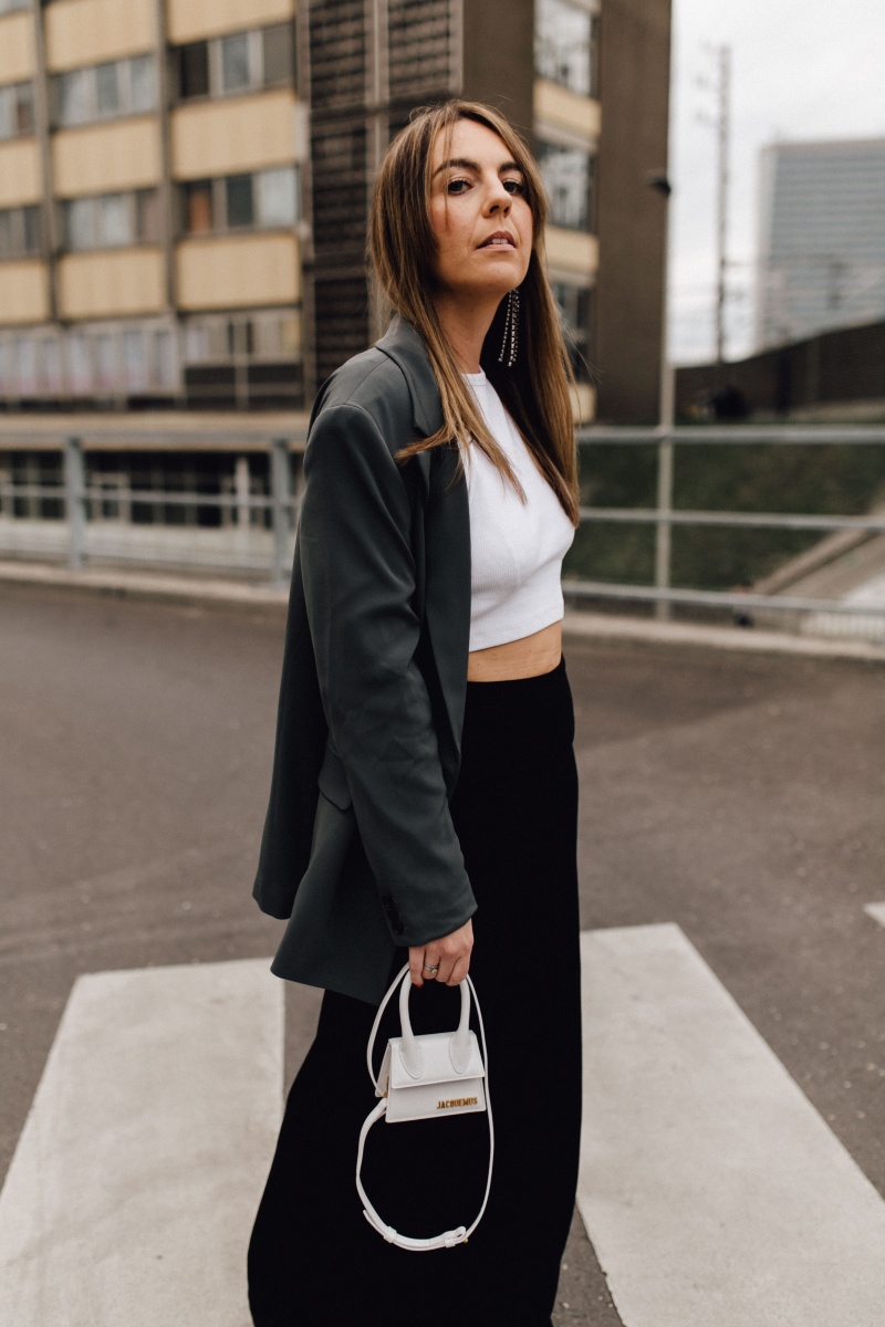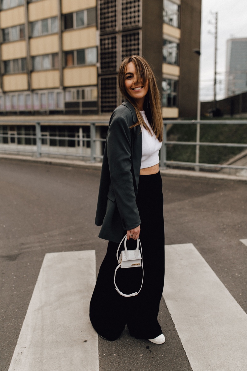 Outfitdetails: Hose. The Michelle Wide Leg Pant von Les Lunes (mit meinem Code LEO50 bekommt ihr 50% bis 03.05.2021 auf das gesamte Sortiment) // Cropped Top. H&M // Blazer. H&M // Ohrringe. H&M (ähnlich) // Tasche. JACQUEMUS // Sneaker. Prada (ähnlich)