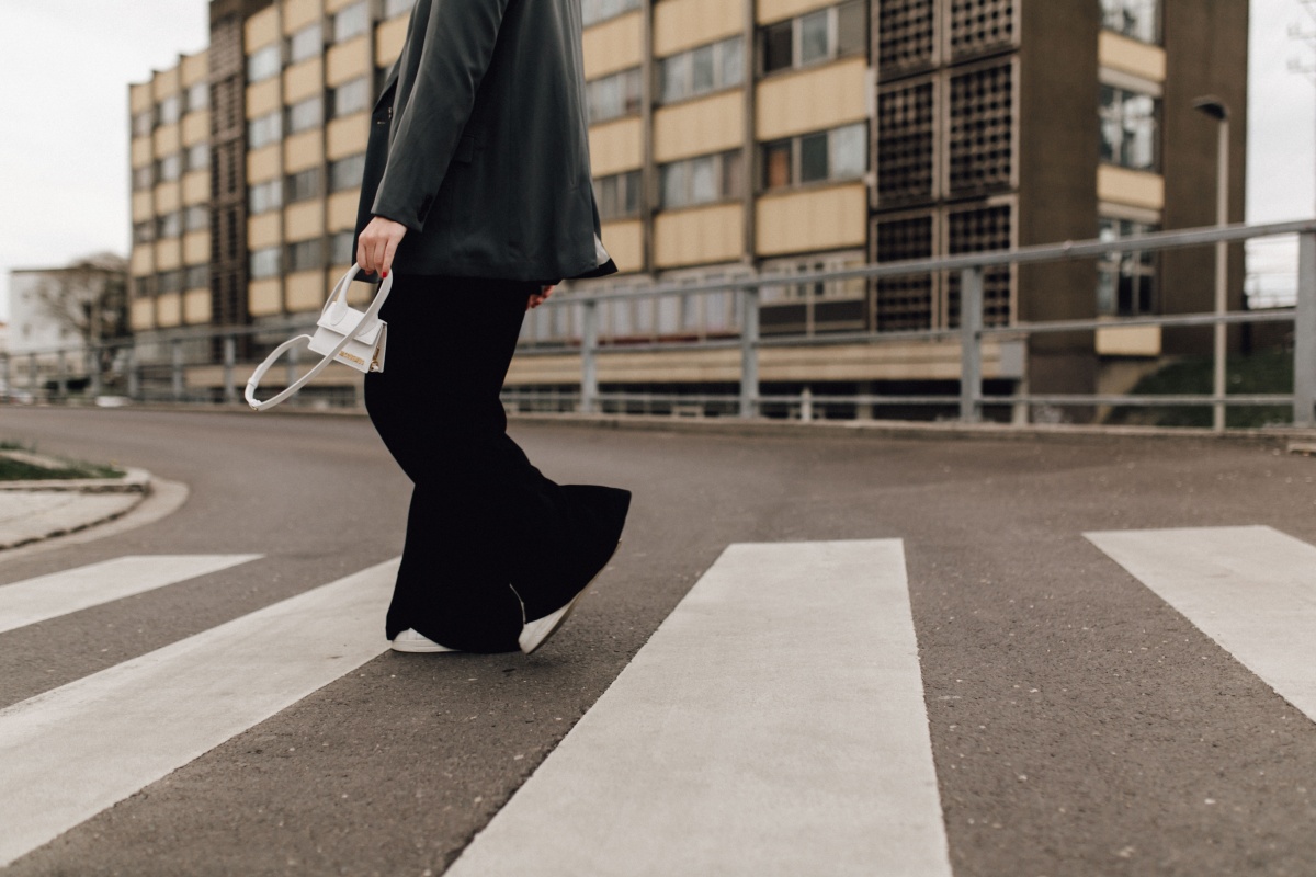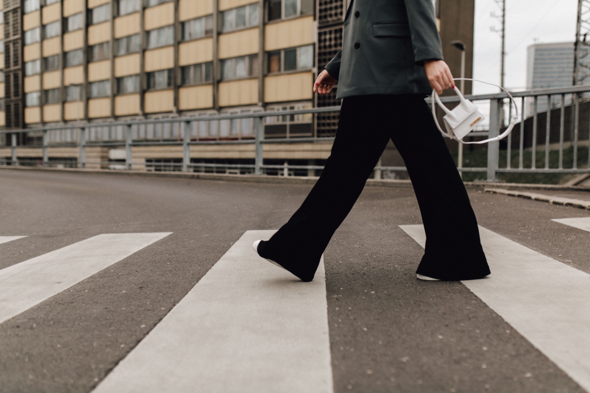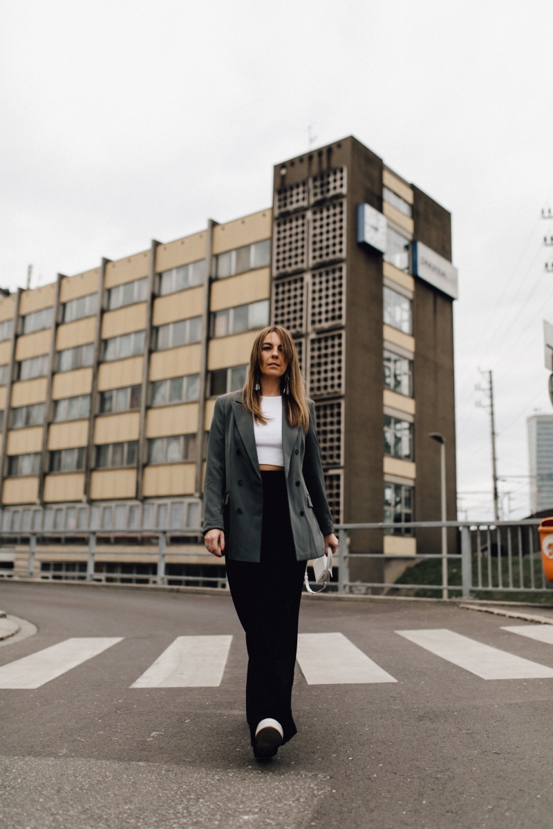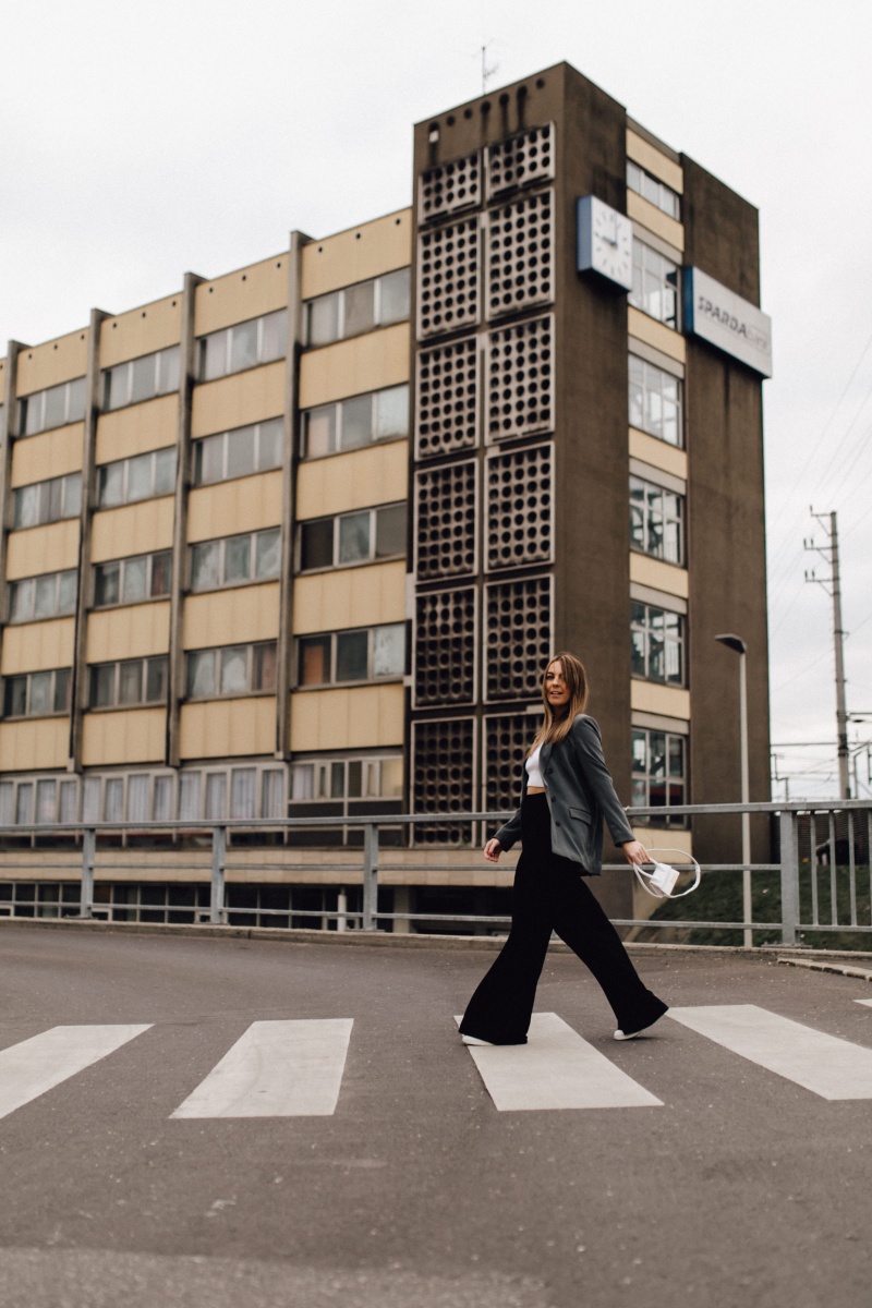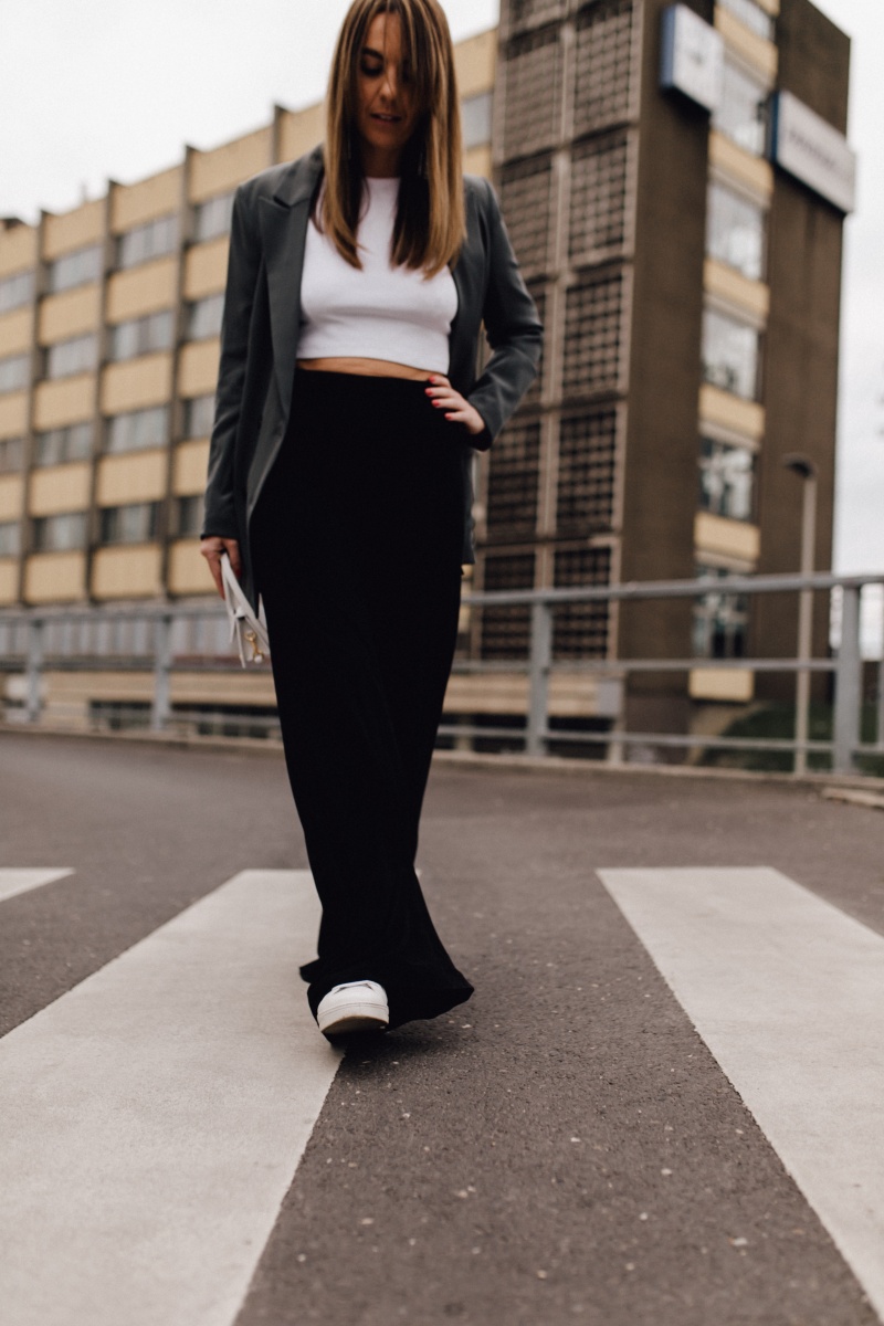 Outfitdetails: Hose. The Michelle Wide Leg Pant von Les Lunes (mit meinem Code LEO50 bekommt ihr 50% bis 03.05.2021 auf das gesamte Sortiment) // Cropped Top. H&M // Blazer. H&M // Ohrringe. H&M (ähnlich) // Tasche. JACQUEMUS // Sneaker. Prada (ähnlich)