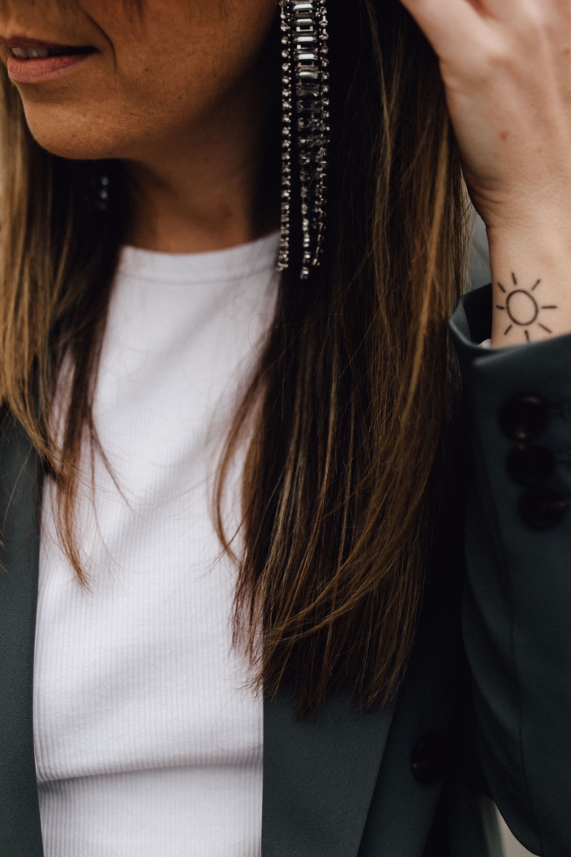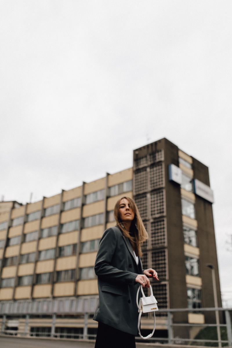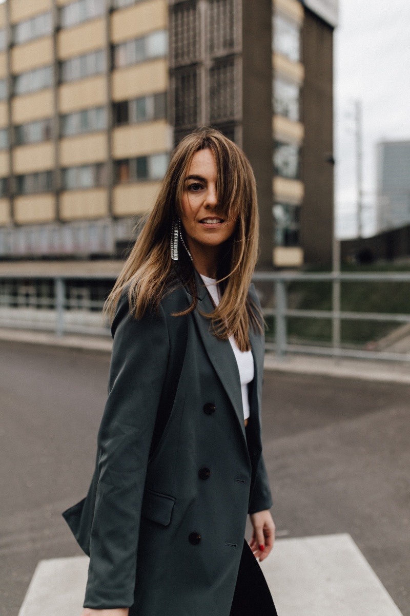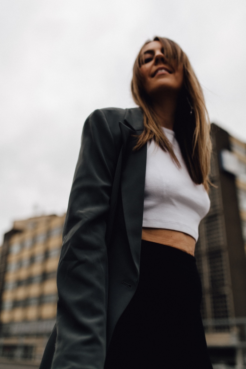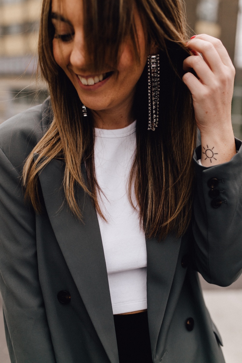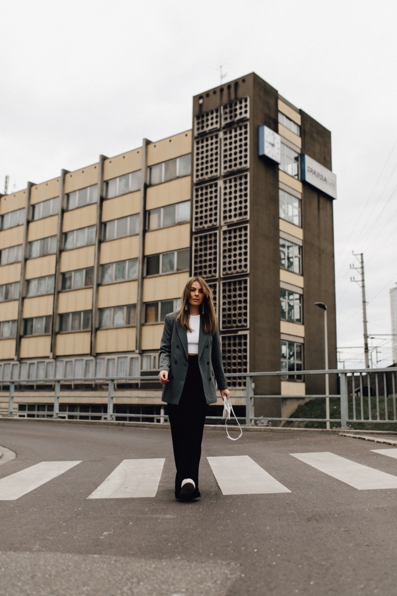 Outfitdetails: Hose. The Michelle Wide Leg Pant von Les Lunes (mit meinem Code LEO50 bekommt ihr 50% bis 03.05.2021 auf das gesamte Sortiment) // Cropped Top. H&M // Blazer. H&M // Ohrringe. H&M (ähnlich) // Tasche. JACQUEMUS // Sneaker. Prada (ähnlich)