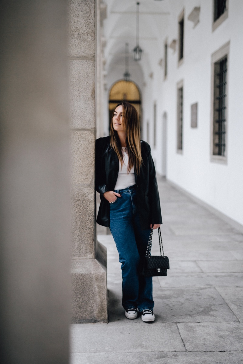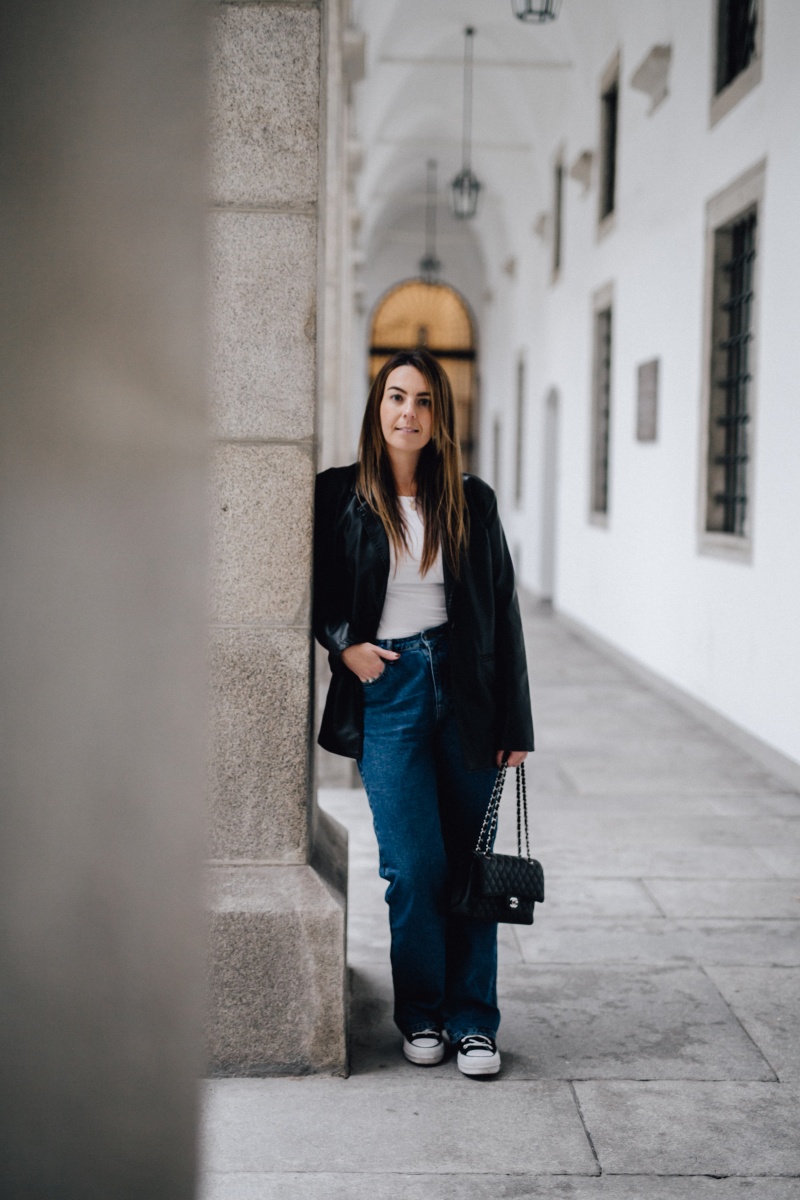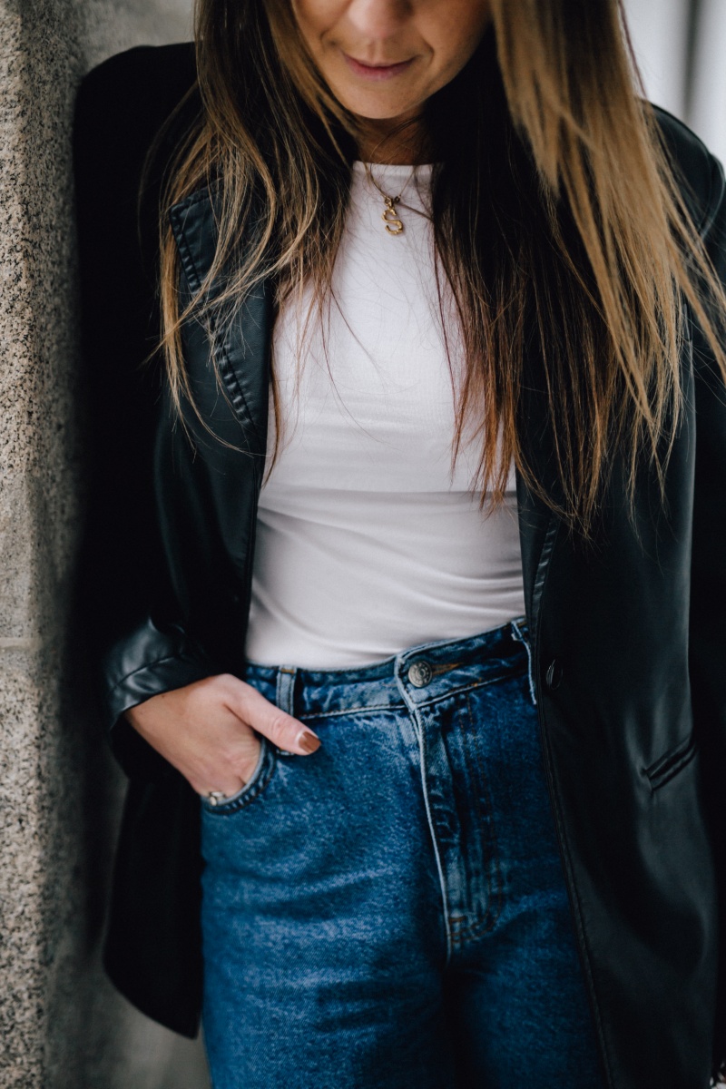 Ob zu Jogginghose oder zu Jeans – ihr könnt den Body individuell kombinieren. Ich habe mich hier für einen klassischen Look entschieden, welcher so gut wie zu jedem Anlass funktioniert. Jeans mit weitem Bein erleben dieses Jahr auch wieder ein „Revival“ und ich habe lange nach dem perfekten Modell Ausschau gehalten. Für viele wahrscheinlich sehr gewöhnungsbedürftig, aber ich mag den 90er Look total gerne. Kombiniert mit einem schwarzen Blazer bietet der Look eine tolle Mischung aus klassisch und casual.